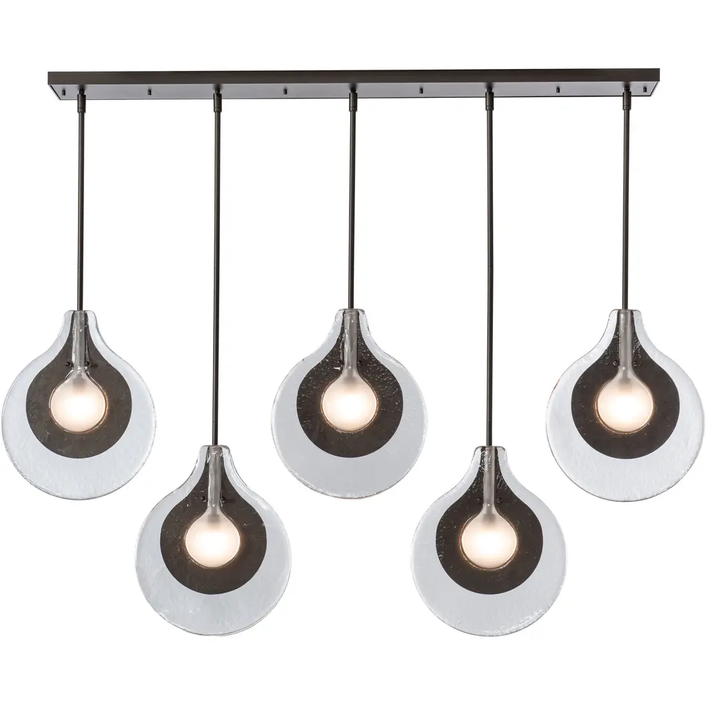 Stunning." "Surprising." "Exquisite." We hear the new Veneto Collection described with excitement for its beautifully handcrafted Venetian glass. Look closely. The textured glass encases both the metal+bulb elements, with a central frosted glass in the bulb area. Part of the ART + ALCHEMY by Hubbardton Forge Collection, this linear Veneto pendant, by HF designer Jason Hancock, features five lights to dramatic effect.