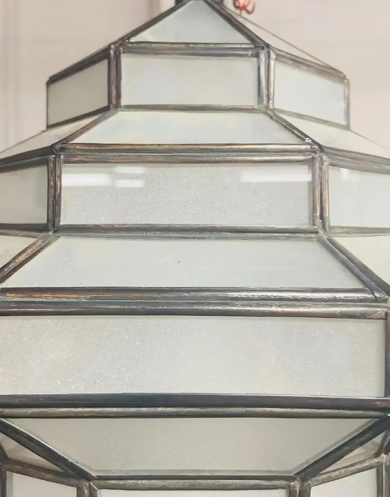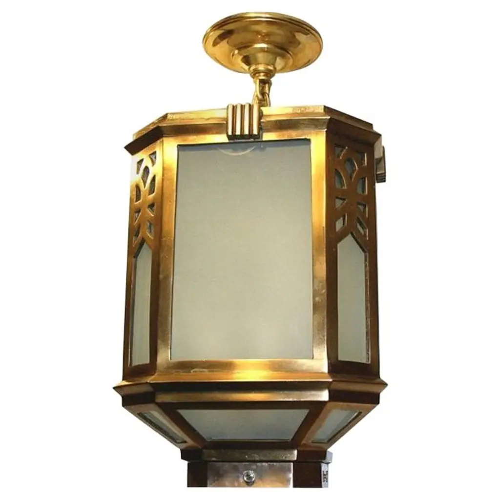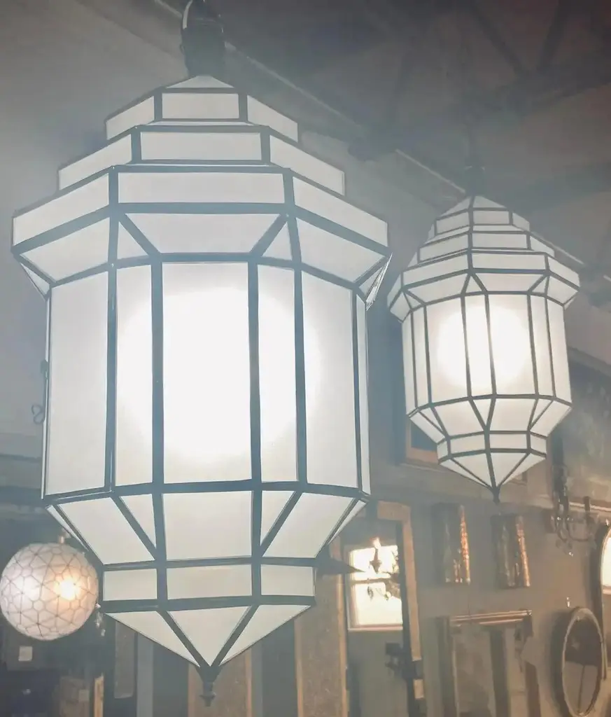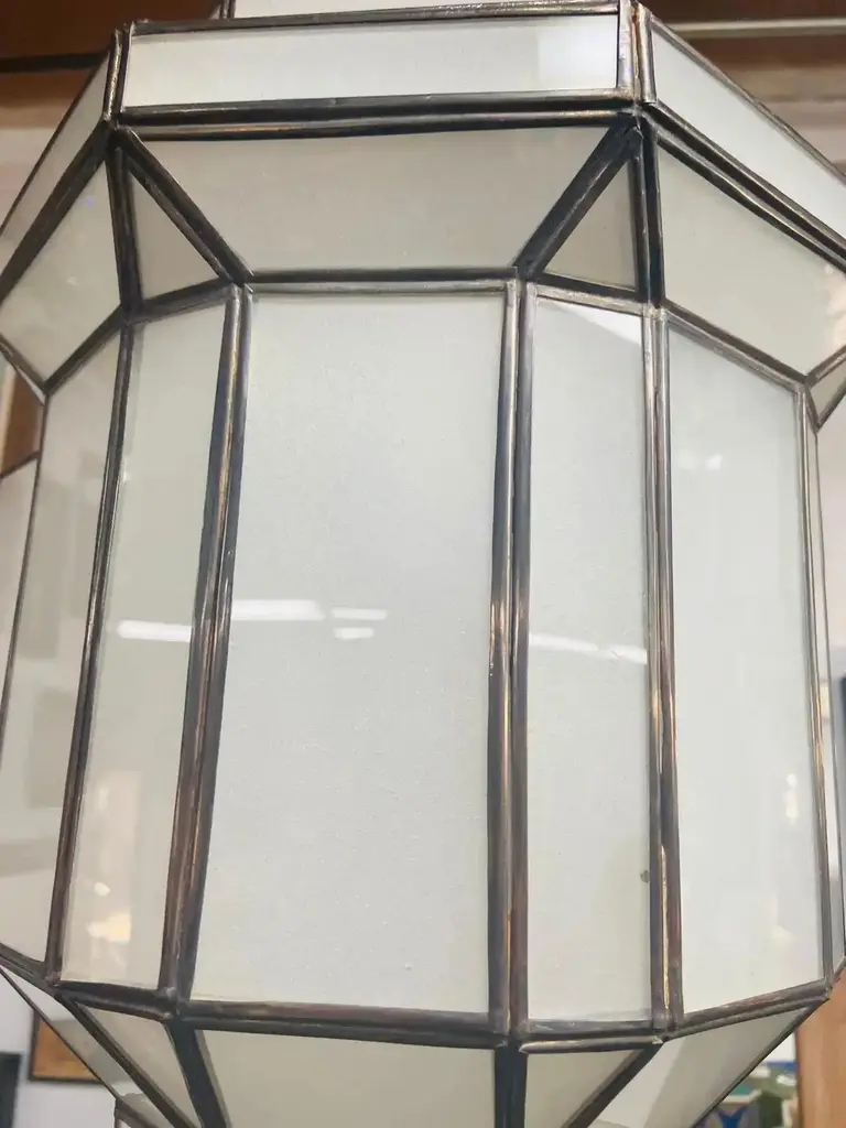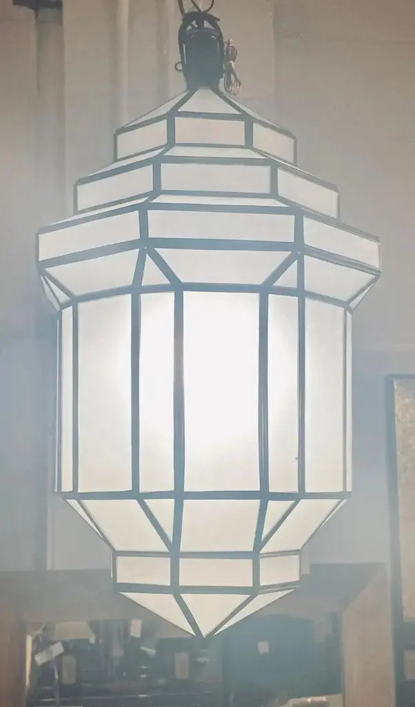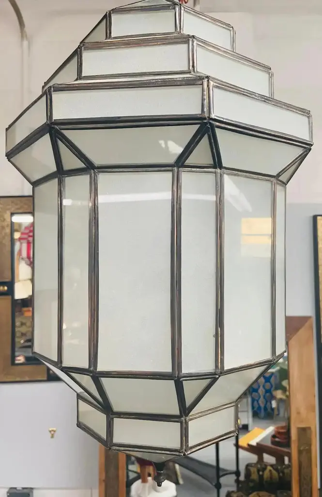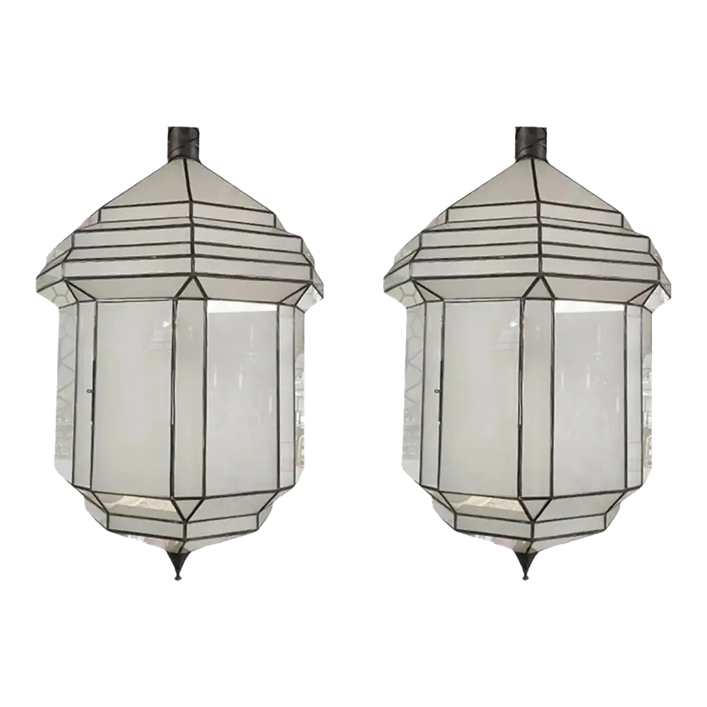 Art Deco style white milk glass handmade chandelier, pendant, lantern, a pair.A gorgeous handcrafted with individual panels, this pair of Art Deco hanging lanterns or ceiling fixtures features sandblasted frosted milky glass and patinated metal frames. The octagonal shaped pendants have a small door on the side of each for changing light bulbs. The lanterns are professionally wired and can hold one standard bulb as shown in the photo attached to the listing. Dimensions: 23" H x 12" D