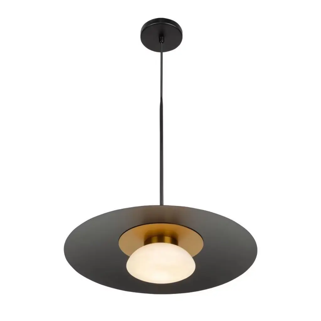 Hanging gracefully from the ceiling, the Camila collection exudes an ethereal glow, casting a soft and warm ambiance. This metal pendant with alabaster type glassware has a seamless design and timeless beauty make it a focal point, blending sophistication with a touch of celestial charm. This pendant is illuminated by LED and is height adjustable. Black finish / Dimmable / Integrated LED / ETL listed / Limited lifetime warranty / Sloped ceiling compatible / Room location: dining room. ,
