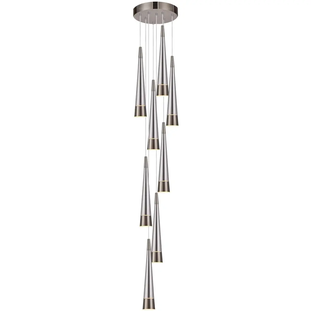 The Sunnyvale collection boasts a distinctive cone-shaped design adorned with metalwork on both the top and bottom, enveloping a captivating tea stain tinted center glass complimented with brushed brass framing. The pendant's exquisite craftsmanship and attention to detail result in a contemporary yet elegant aesthetic, making it a standout piece in any interior. With LED illumination seamlessly integrated throughout the glassware, the Sunnyvale collection not only delivers striking visual appeal but also provides efficient and ambient lighting. 9 light foyer model shown. (easily height adjustable) Brass finish / Dimmable / Integrated LED / ETL listed / Limited lifetime warranty / Sloped ceiling compatible / Room location: dining room. ,