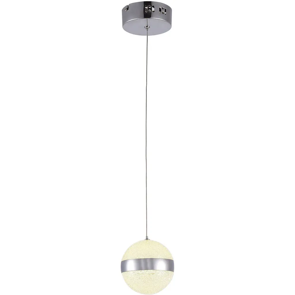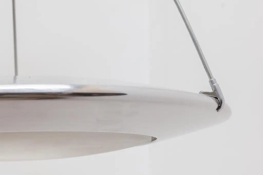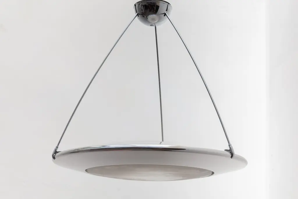 Vintage midcentury Arteluce saucer lamp.This Mira C Suspension provides diffused upward and downward light and features aluminum chrome lamp body finish a sandblasted, acid-etched glass diffuser. Body is supported by three chrome rods which in turn affix unit to a ceiling rose. Made in Italy. designed by Ezio Didone for Arteluce.