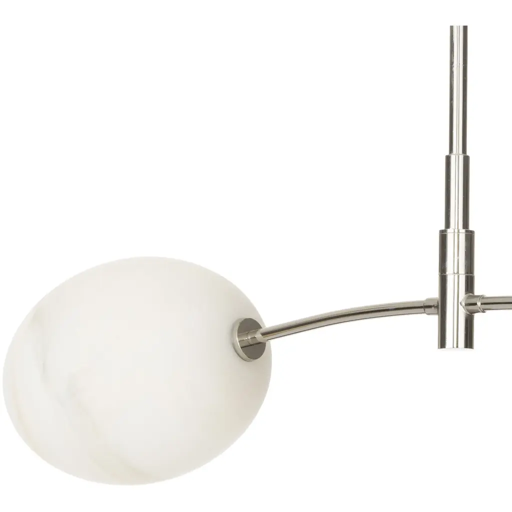 The Artemis Double Pendant masterfully balances simplicity with artisanal craftsmanship, featuring open-ended, alabaster like glass globes elegantly positioned at each end of its mobile-inspired, arched arm in polished nickel finish. This striking fixture exudes a modern vibe, making it a standout addition to any space.