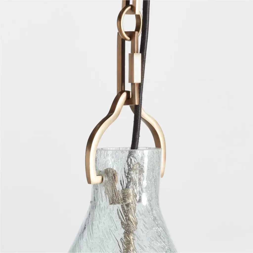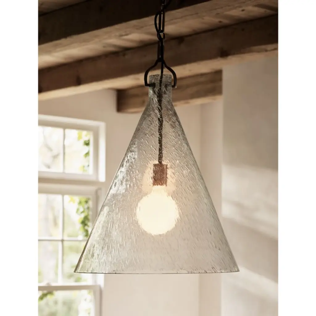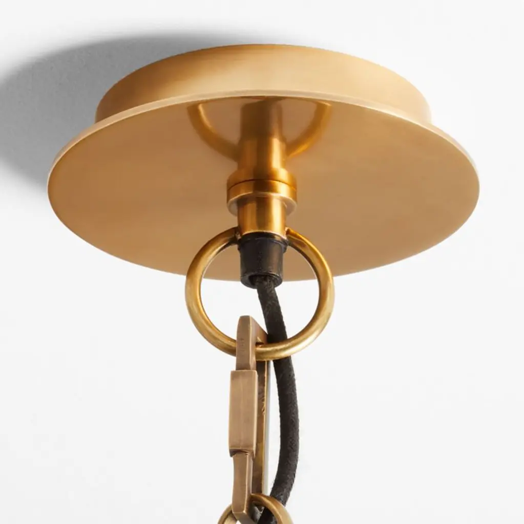 Inspired by vintage artisanal glass shades, our Artesa pendant showcases the fascination of seeded glass. This centuries-old process creates countless tiny bubbles in the oversized glass cone, resulting in a textural surface pattern reminiscent of seeds. Burnished brass finishings-linear socket, graceful arabesque bracket and unique squared-off chain links-harmonize with the vintage aesthetic while keeping the overall look clean and modern. We recommend hanging Artesa over a kitchen island, dining room buffet or bathtub where its subtleties can be fully appreciated.