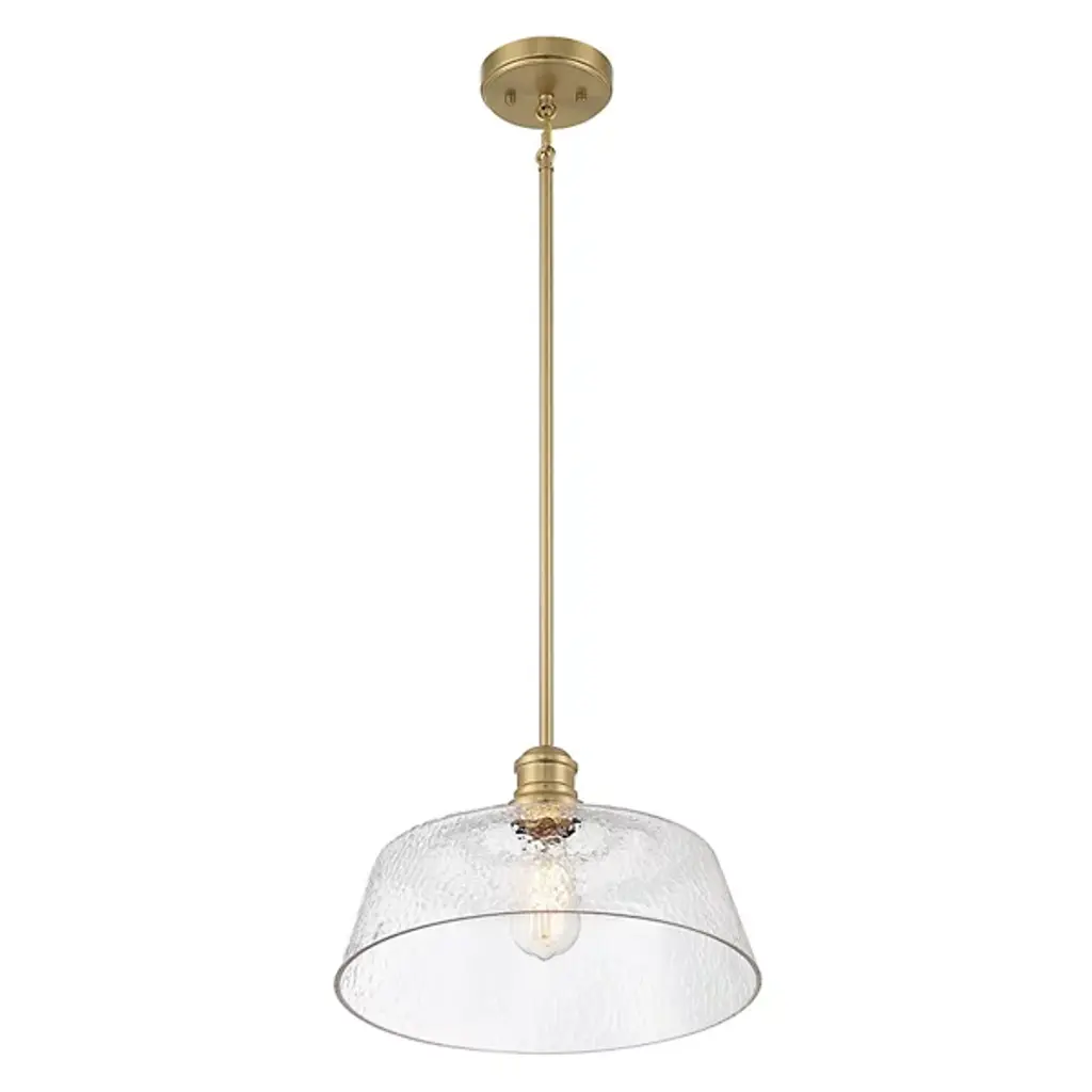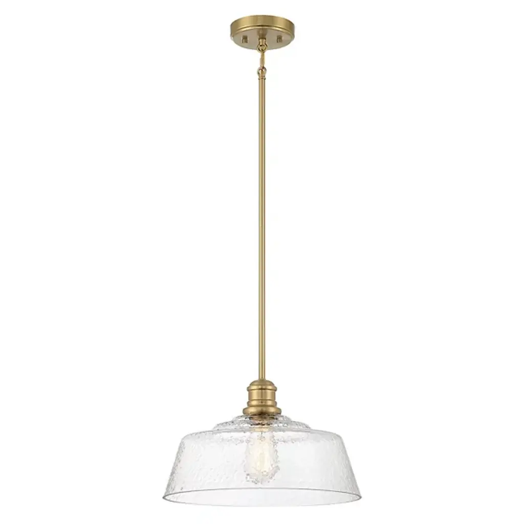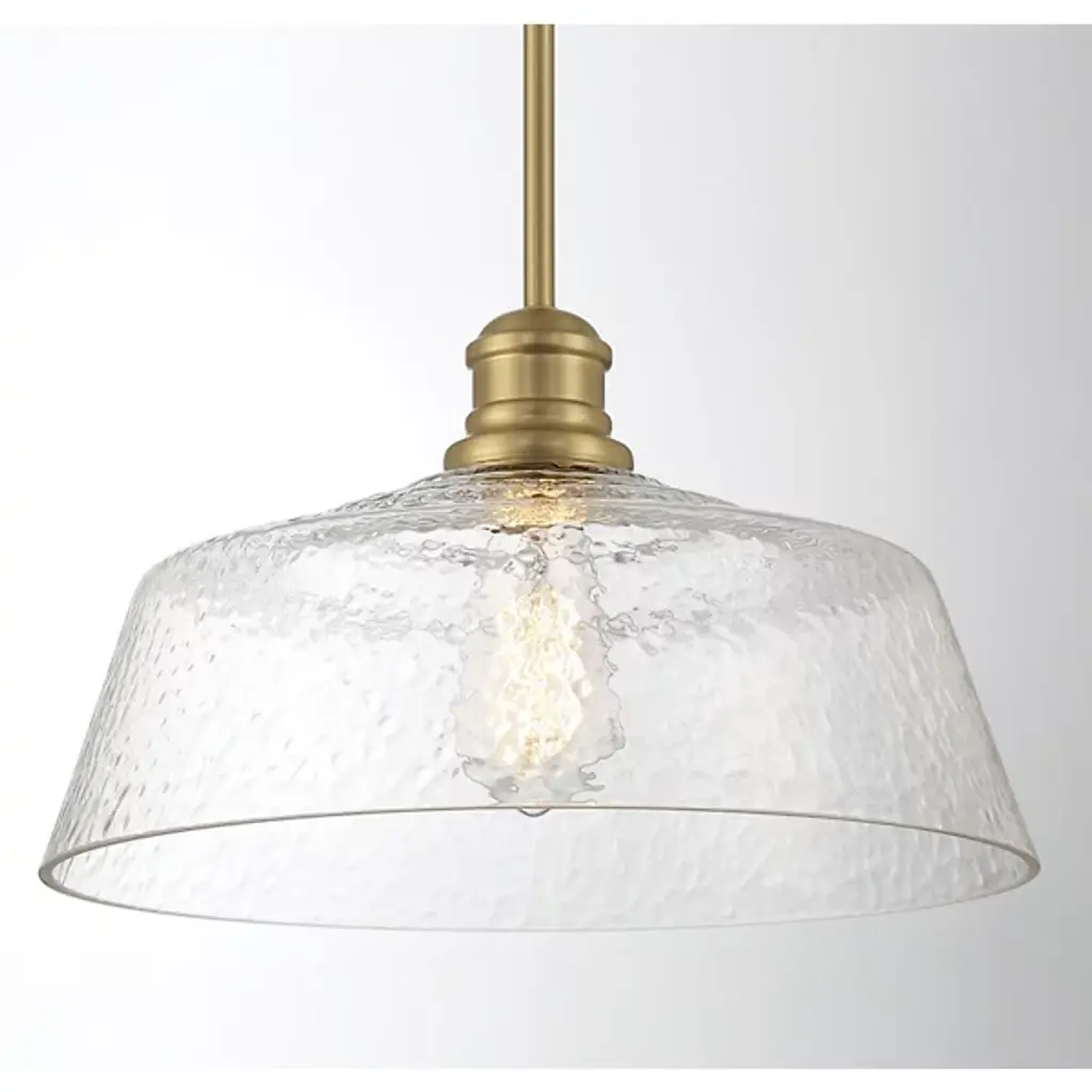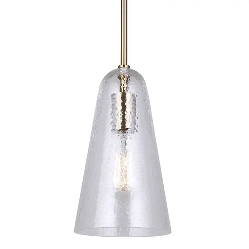 The Arthur Pendant from Alder & Ore is a transitional light fixture that brings visual interest to your space. It features a charming, intricately textured glass shade crowned with metal, which supports a brightly illuminated LED, allowing light to emanate from above. The pendant is secured by a downrod attached to a ceiling canopy, offering balance and stability. The subtle, rippled presentation at the top of the shade adds the final touch.