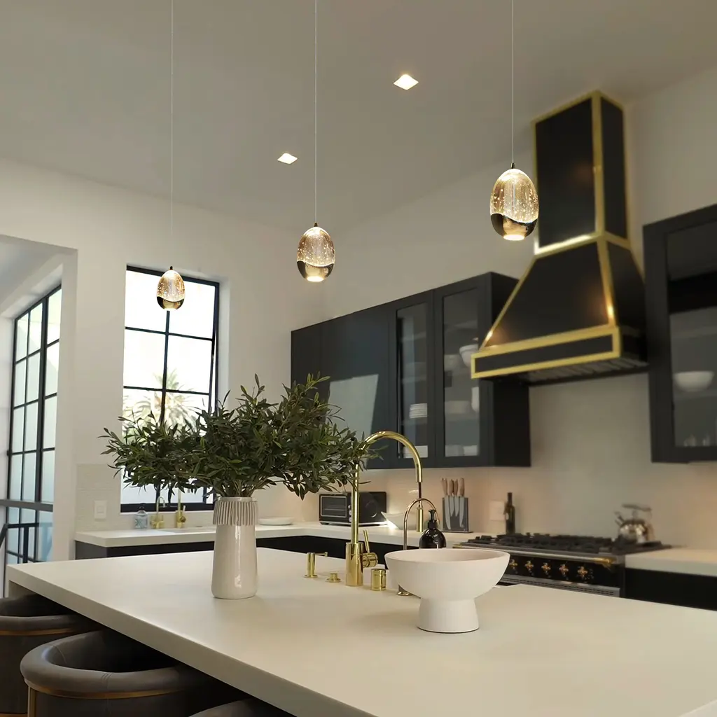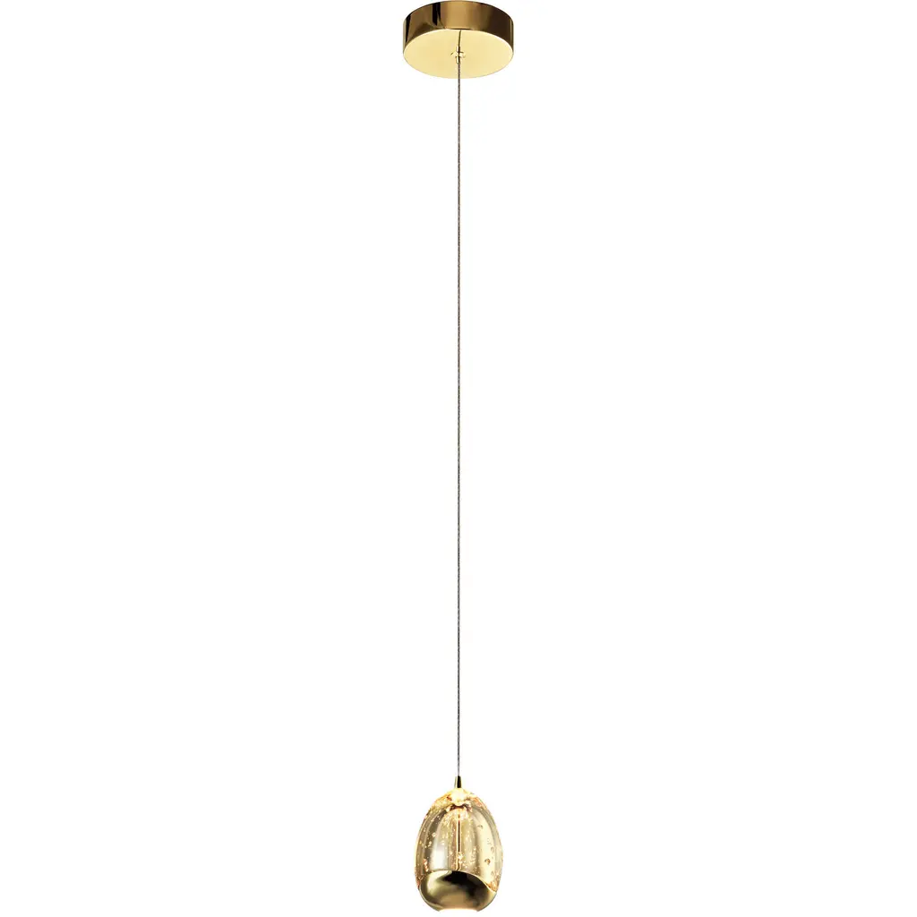 From VONN's Venezia Series, the VAP2201GL Integrated LED Pendant is a modern 3.5-inch fixture made from aluminum and glass, with a Gold aluminum canopy and an Integrated LED Shade. The shade consists of a Glass oval-shaped shade with Integrated LED and bubbles effect. Emitting a soft white ambient light at 3000 Kelvin, it offers adjustable height, dimmable functionality, and compatibility with sloped ceilings. With 288.4 Lumens brightness, an energy-efficient power consumption of 6.01 Watts, and CRI 90, this pendant combines style and efficiency for versatile and customizable illumination.