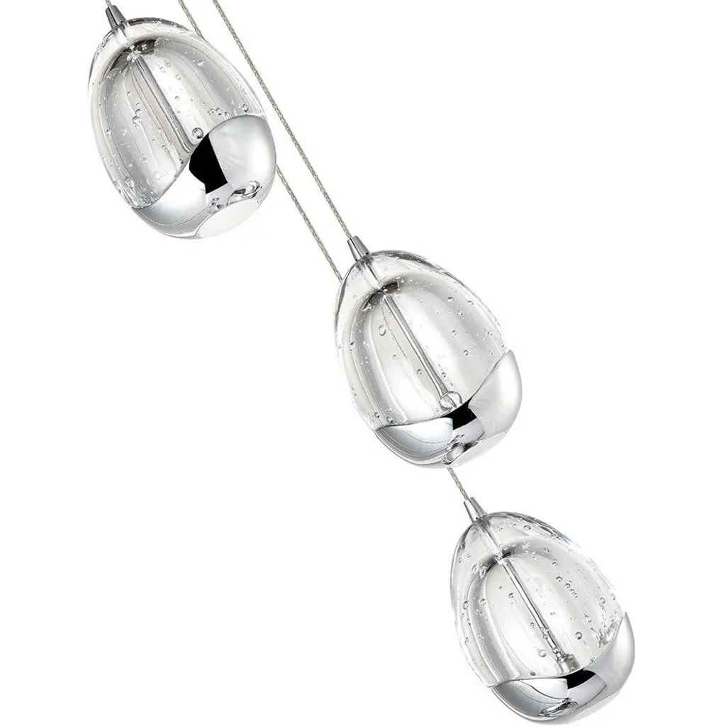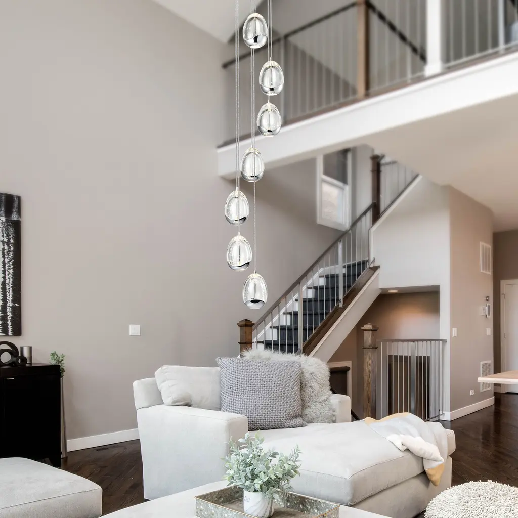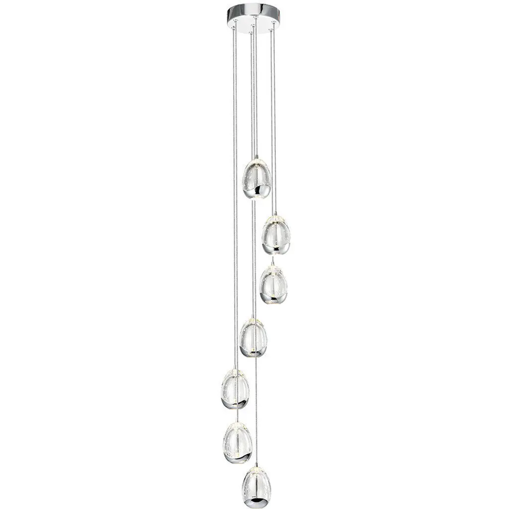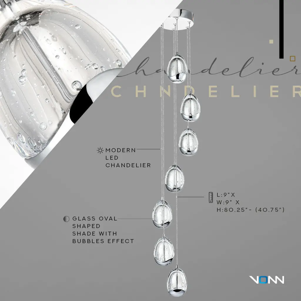 From VONN's Venezia Series, the VAC3207CH Integrated LED Chandelier is a modern fixture made from aluminum and glass, with a polished chrome canopy and 7, 3.5-inch oval-shaped glass shades. The glass shades are clear with a bubble accent and polished chrome bottom. Emitting a soft white ambient light at 3000 Kelvin, it offers adjustable height, dimmable functionality, and compatibility with sloped ceilings. With 2034.2 lumens brightness, an energy-efficient power consumption of 33.72 Watts, and CRI 90, this chandelier combines style and efficiency for versatile and customizable illumination.