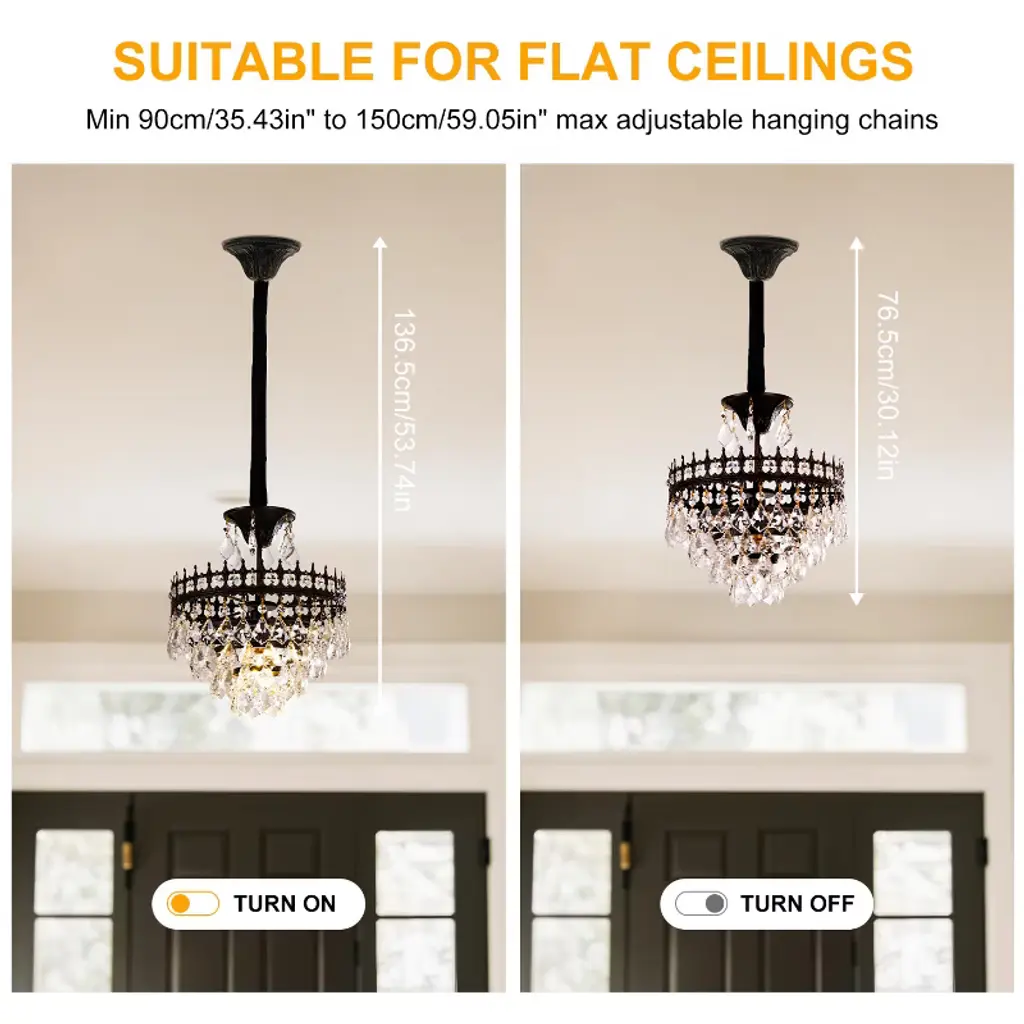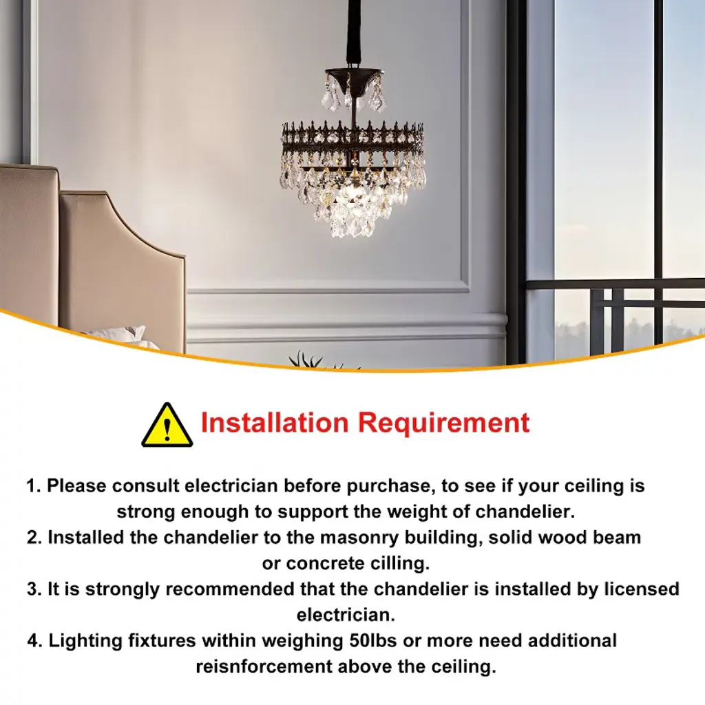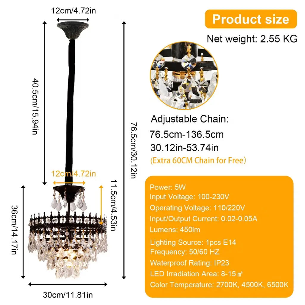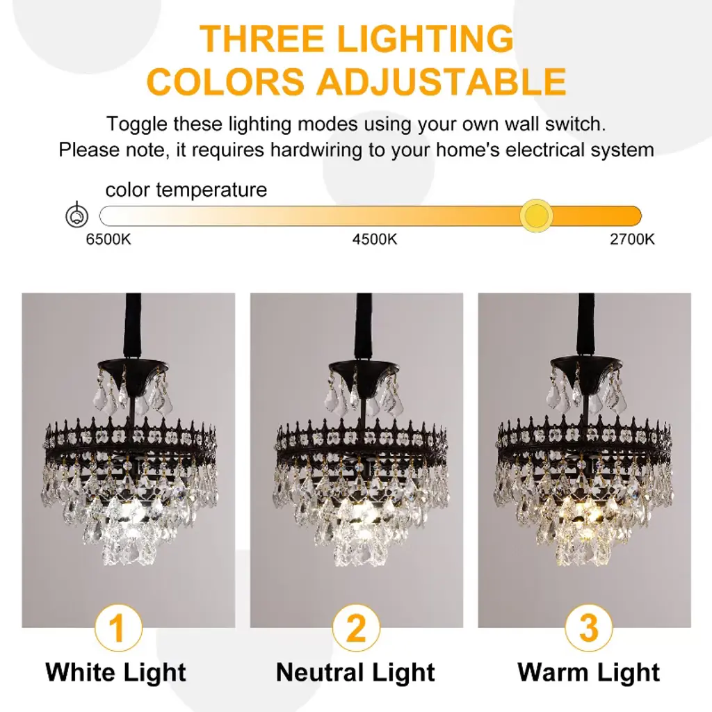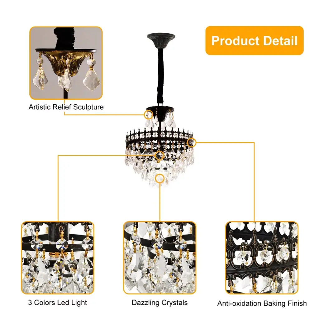 This chandelier features a meticulously hand-forged wrought iron frame, adorned with layers of precision-cut crystals that reflect the lights in dazzling brilliance. Comes with LED corn bulbs that emit three colors illumination, filling your space with a welcoming glow. Whether you're enjoying a family dinner or welcoming guests into your home, it adds sophistication and comfort in equal measure.