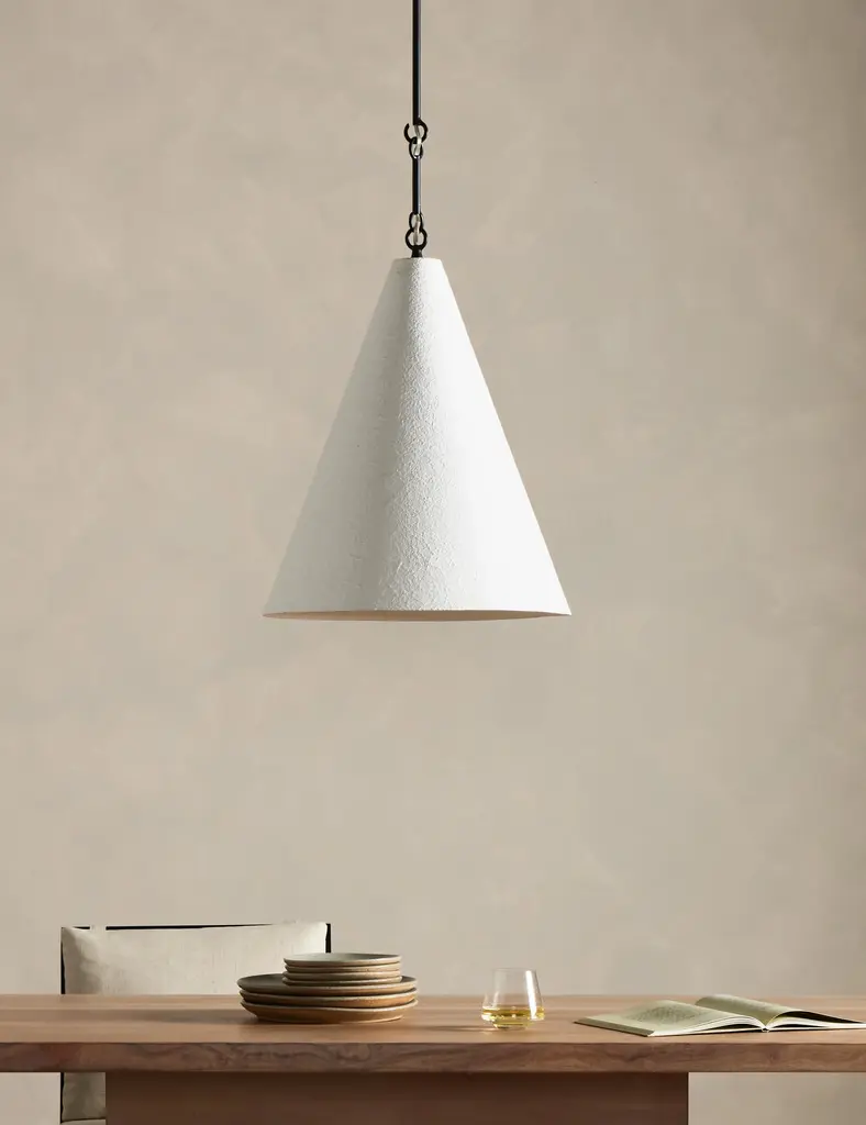 The Ashwin pendant light brings timeless texture to a sleek design with its plaster finish and antiqued iron hardware. This chic pendant is perfect over your dining room table or can be styled in multiples for a kitchen or lounge.