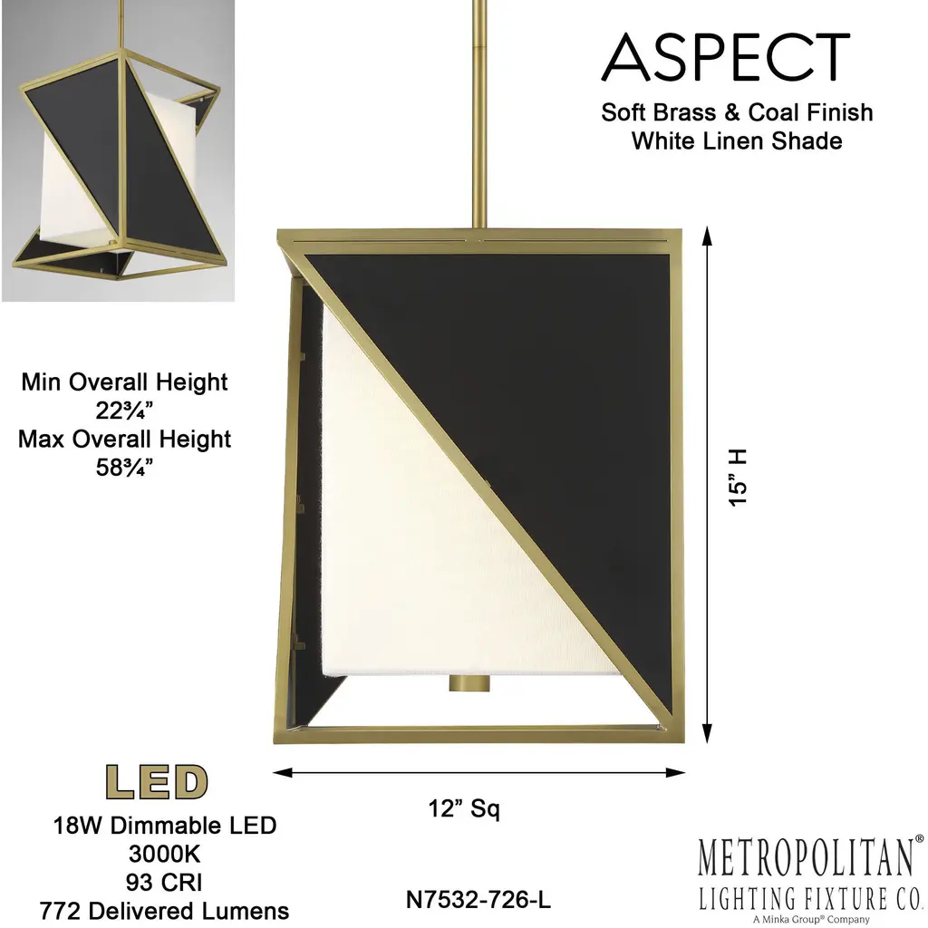 This 1 light Pendant from the Aspect collection by Metropolitan will enhance your home with a perfect mix of form and function. The features include a Coal And Soft Brass finish applied by experts. This item qualifies for free shipping!