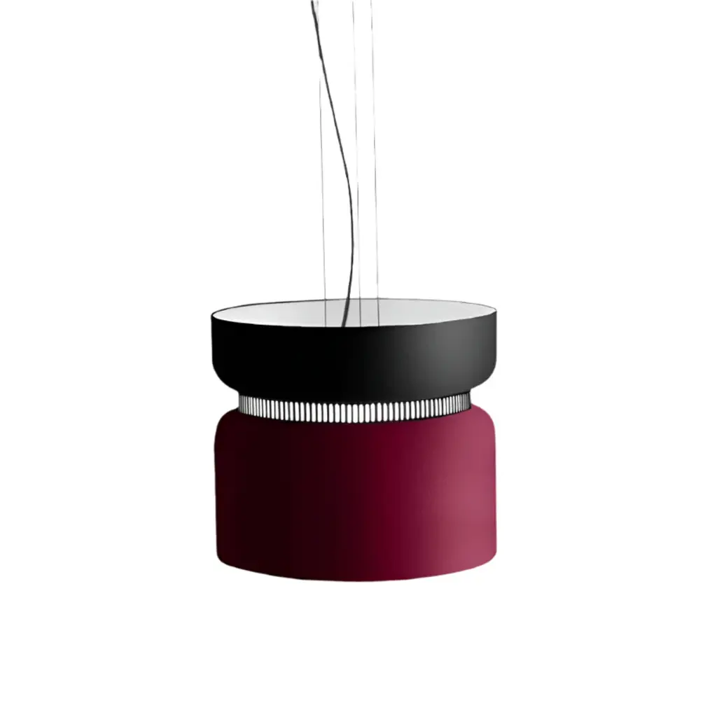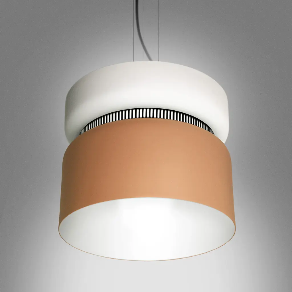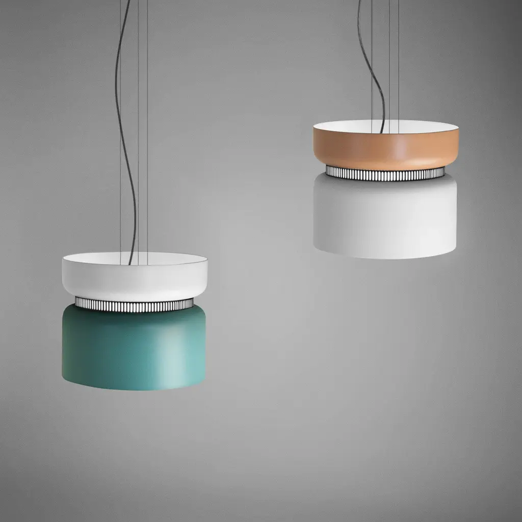 Suspension lamp with a dual aluminum shade. Available in several mattee lacquer finishes, which can be combined freely: Snow, Mango, Turquoise, Merlot, River, Sea, Rose, Limestone, Black, Brass. Features