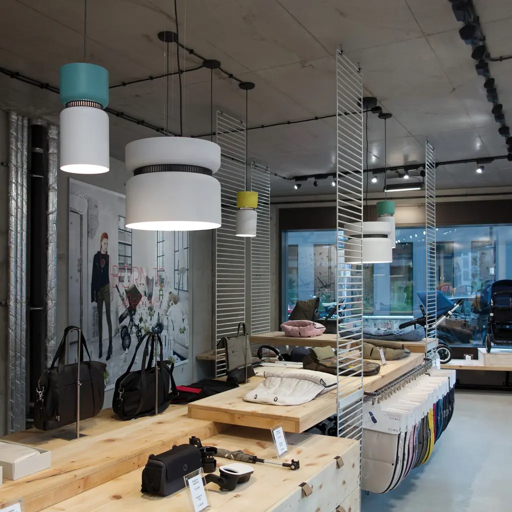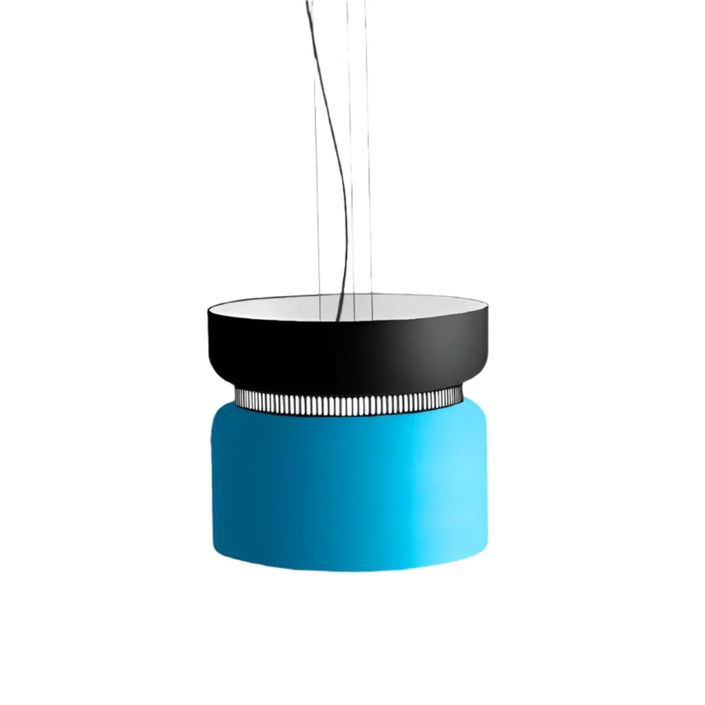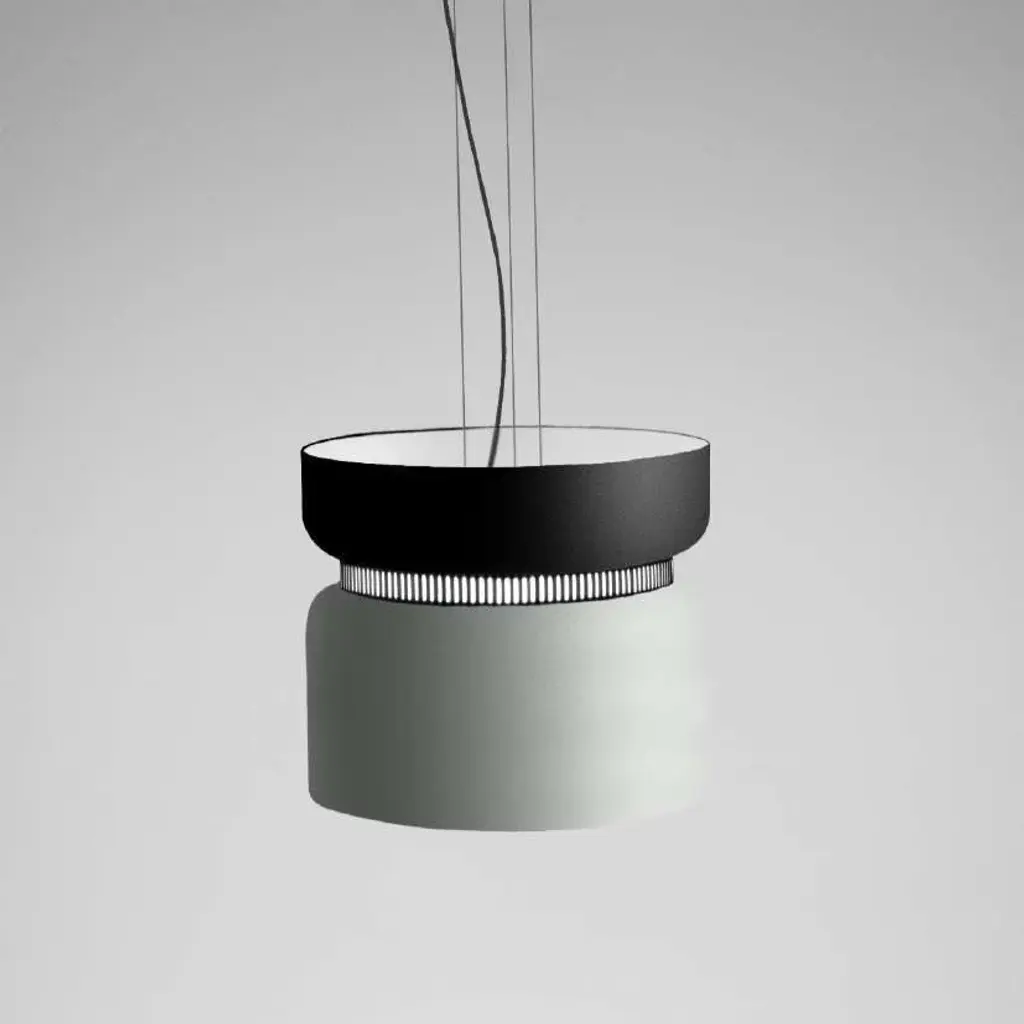 Suspension lamp with a dual aluminum shade. Available in several mattee lacquer finishes, which can be combined freely: Snow, Mango, Turquoise, Merlot, River, Sea, Rose, Limestone, Black, Brass. Features