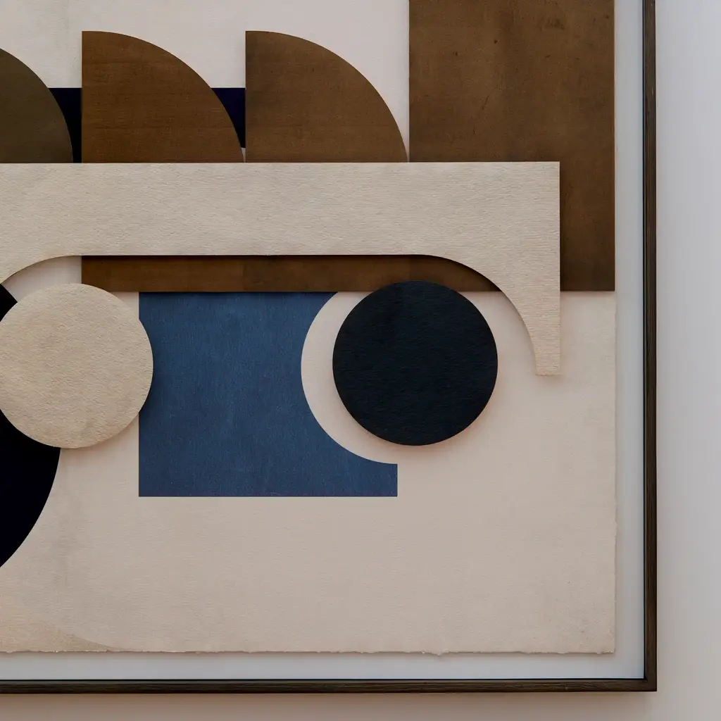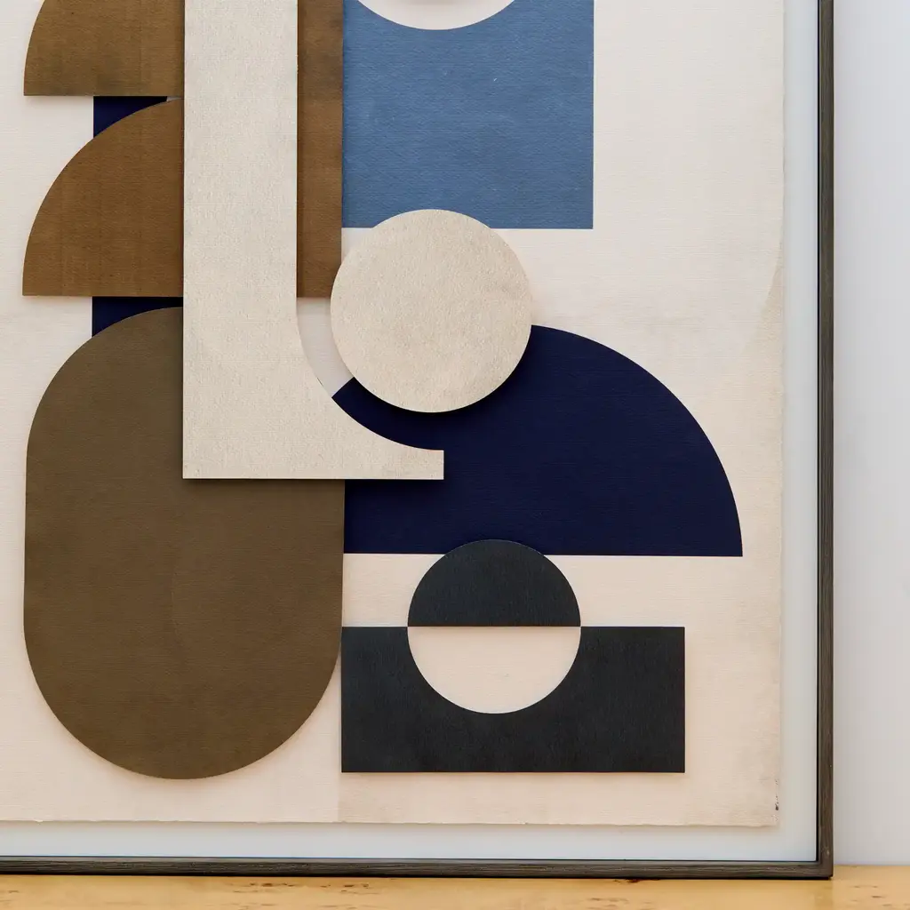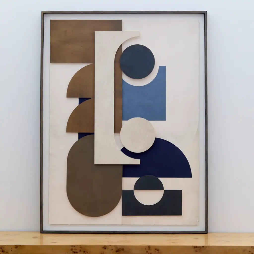 Assemblage Géométrique No. 4 is a layered study in proportion, color, and form. Composed of precision-cut and hand-colored paper, each shape is arranged in a deliberate interplay of overlap and alignment—inviting the eye to explore its shifting spatial relationships. The palette of umber, cream, navy, and cobalt reflects the refined restraint of mid-century European design, while the composition itself nods to the Bauhaus school’s experiments in form and color theory.Float-mounted within a shadow box frame without acrylic cover, the piece retains the tactile presence of the materials—allowing the surface textures and subtle shadows to remain alive to changing light. At 30” x 40”, its scale and dimensional depth command attention, making it equally suited to a modern gallery wall or as a standalone focal point.