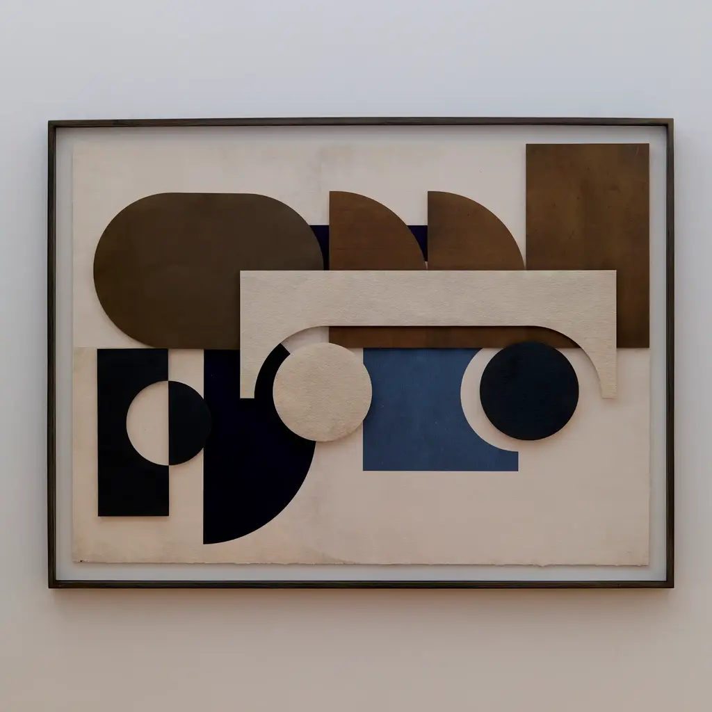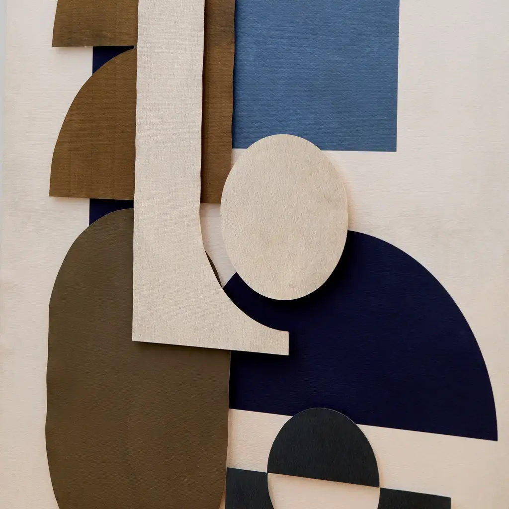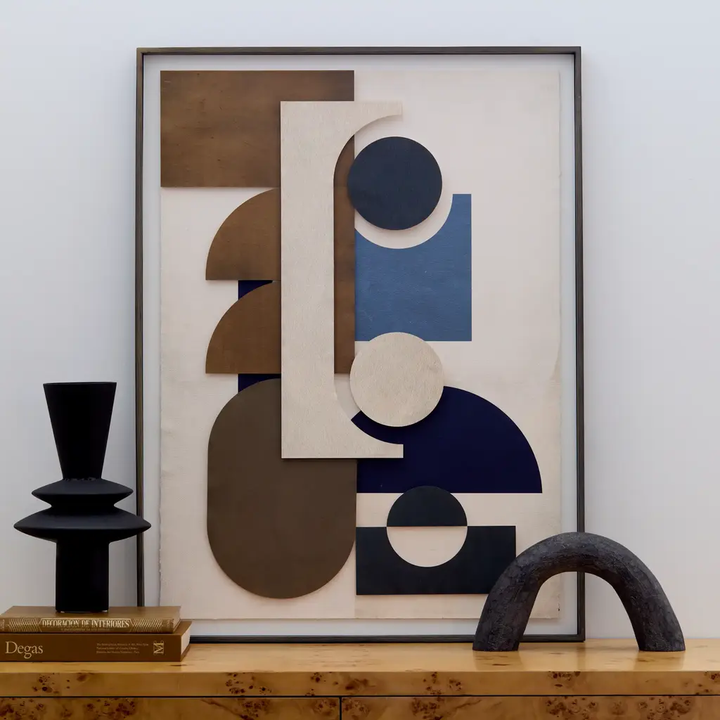 Assemblage Géométrique No. 4 is a layered study in proportion, color, and form. Composed of precision-cut and hand-colored paper, each shape is arranged in a deliberate interplay of overlap and alignment—inviting the eye to explore its shifting spatial relationships. The palette of umber, cream, navy, and cobalt reflects the refined restraint of mid-century European design, while the composition itself nods to the Bauhaus school’s experiments in form and color theory.Float-mounted within a shadow box frame without acrylic cover, the piece retains the tactile presence of the materials—allowing the surface textures and subtle shadows to remain alive to changing light. At 30” x 40”, its scale and dimensional depth command attention, making it equally suited to a modern gallery wall or as a standalone focal point.