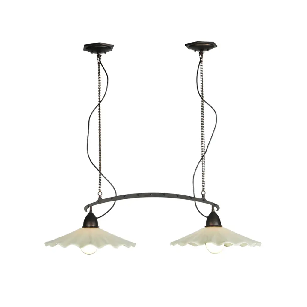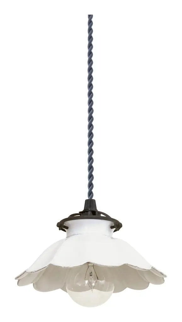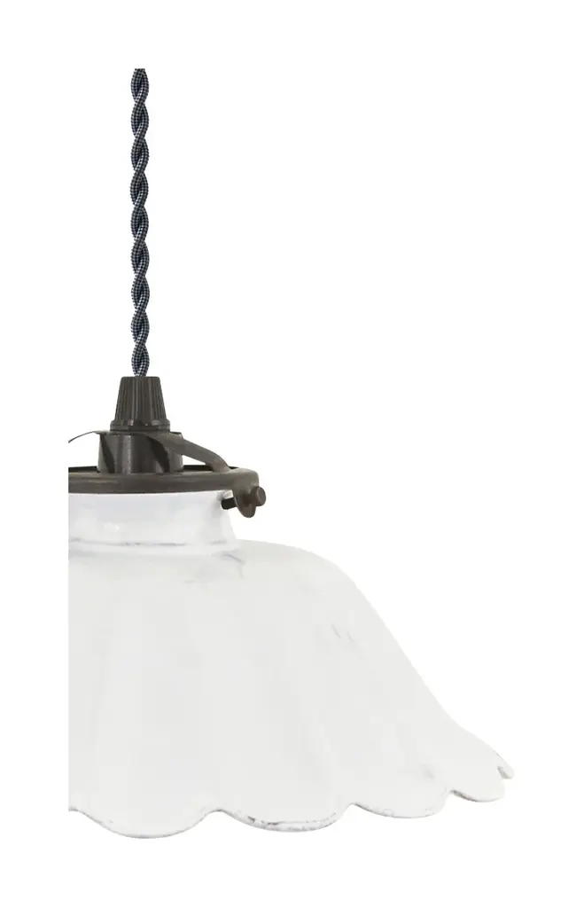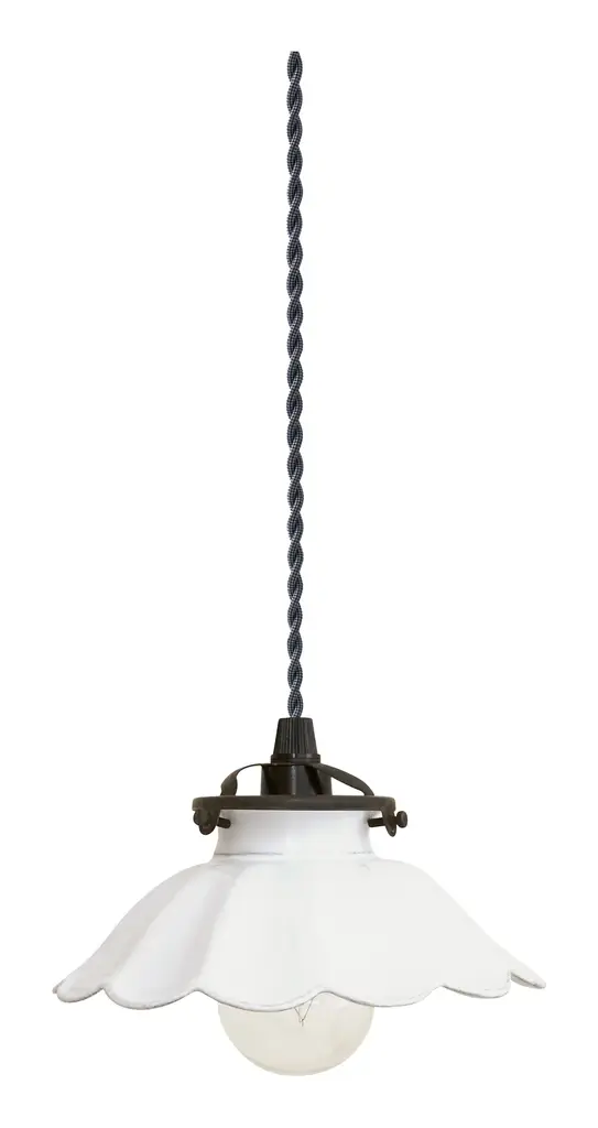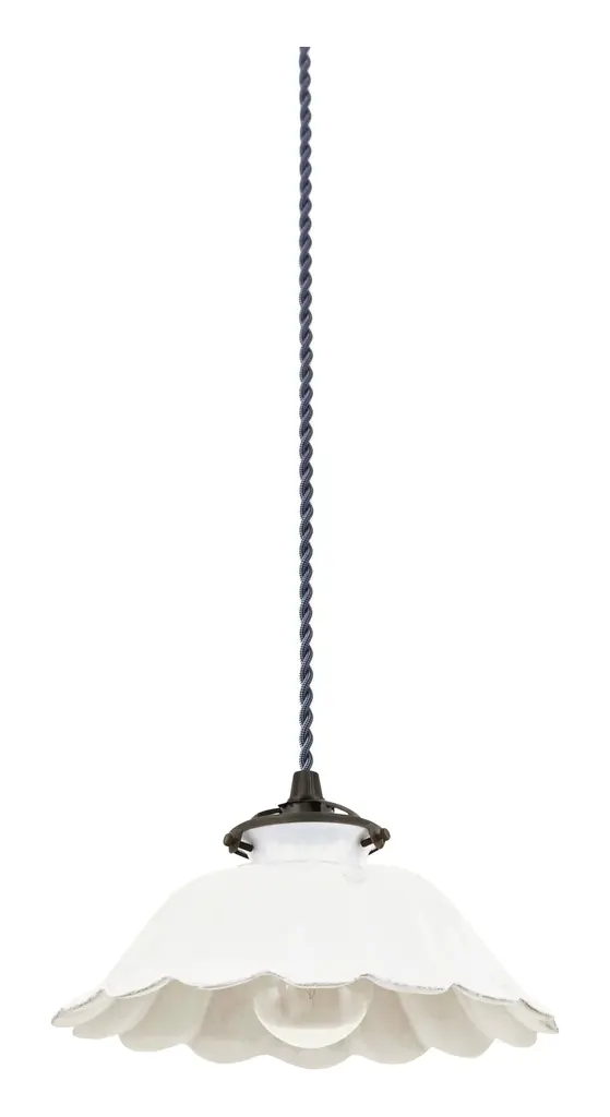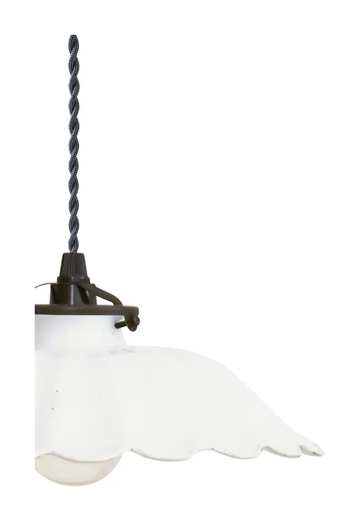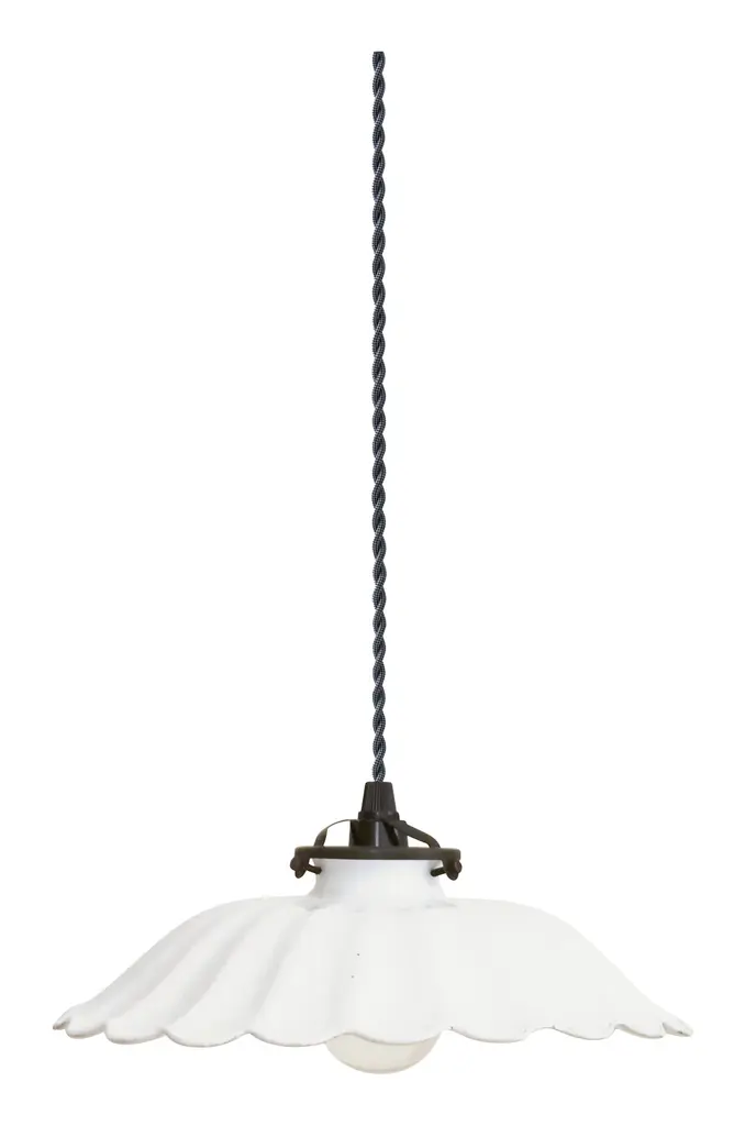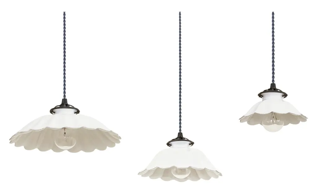 Brighten up your space with our antique-inspired Marguerite Pendants. Named for the French for “daisy,” these petite pendant lights come to us from the historic Paris workshop of Astier de Villatte, housed in what was once the atelier of Napoleon’s own silversmith. There, each delicate shade was handcrafted from black terracotta clay following traditional methods passed down for generations and finished with the brand’s signature milky white glaze. Each one is paired with a simple twisted black and white rayon cord and a matching ceramic canopy. With scalloped edges and a flower-like silhouette, we love our sweet Marguerite Pendants for a pop of Provencal style just about anywhere. Perfect as a single or hung in multiples at varying heights. •black terracotta clay •white glaze •astier de villatte•black and white twisted rayon cord •glazed terracotta canopy •requires 40W max/type E12 candelabra bulb•handmade in paris•each is unique •hardwire Dimensions: •small: 6" diameter x 2.5"H•medium: 7.75" diameter x 3.5"H•large: 9.5" diameter x 3"H•canopy: 4" diameter x 1.75"H•cord: 118" long