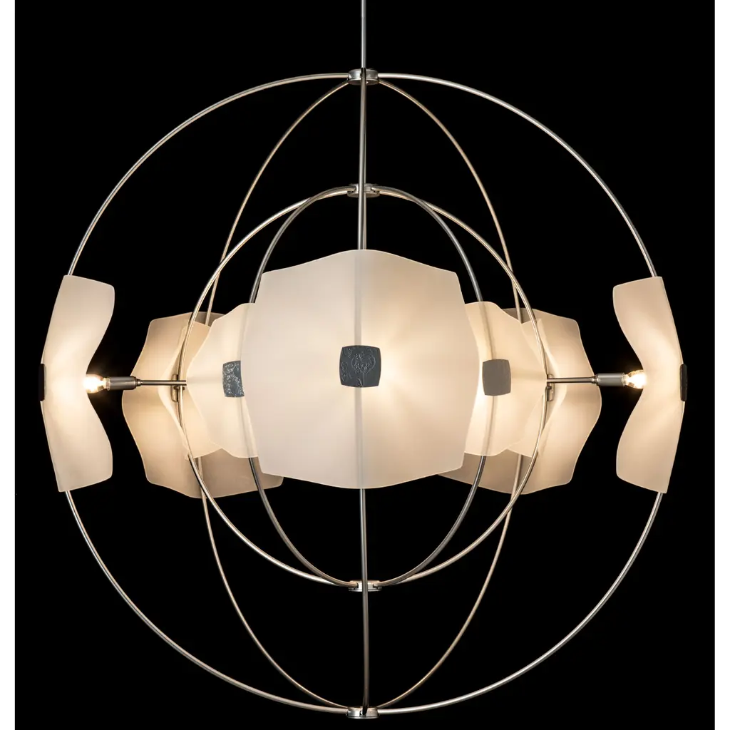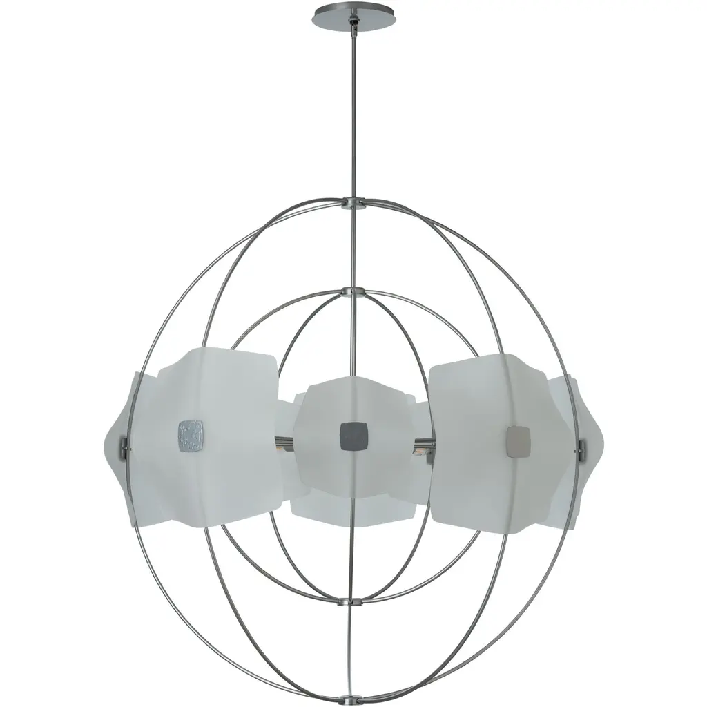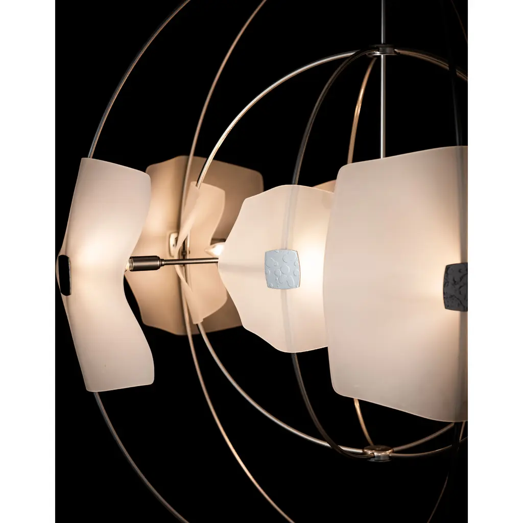 At over 4 ft in diameter, the Astra Orb Large Pendant offers both scale and light, with an open-structure providing an airy, contemporary feel. Handmade, gently slumped art glass in two sizes complements each arm of this spherical fixture. A beautiful, hand-forged metal medallion holds the glass panel in place while adding a sophisticated geometric detail. And, our makers thought of everything - this fixture's "hoops" knock down for easy shipping