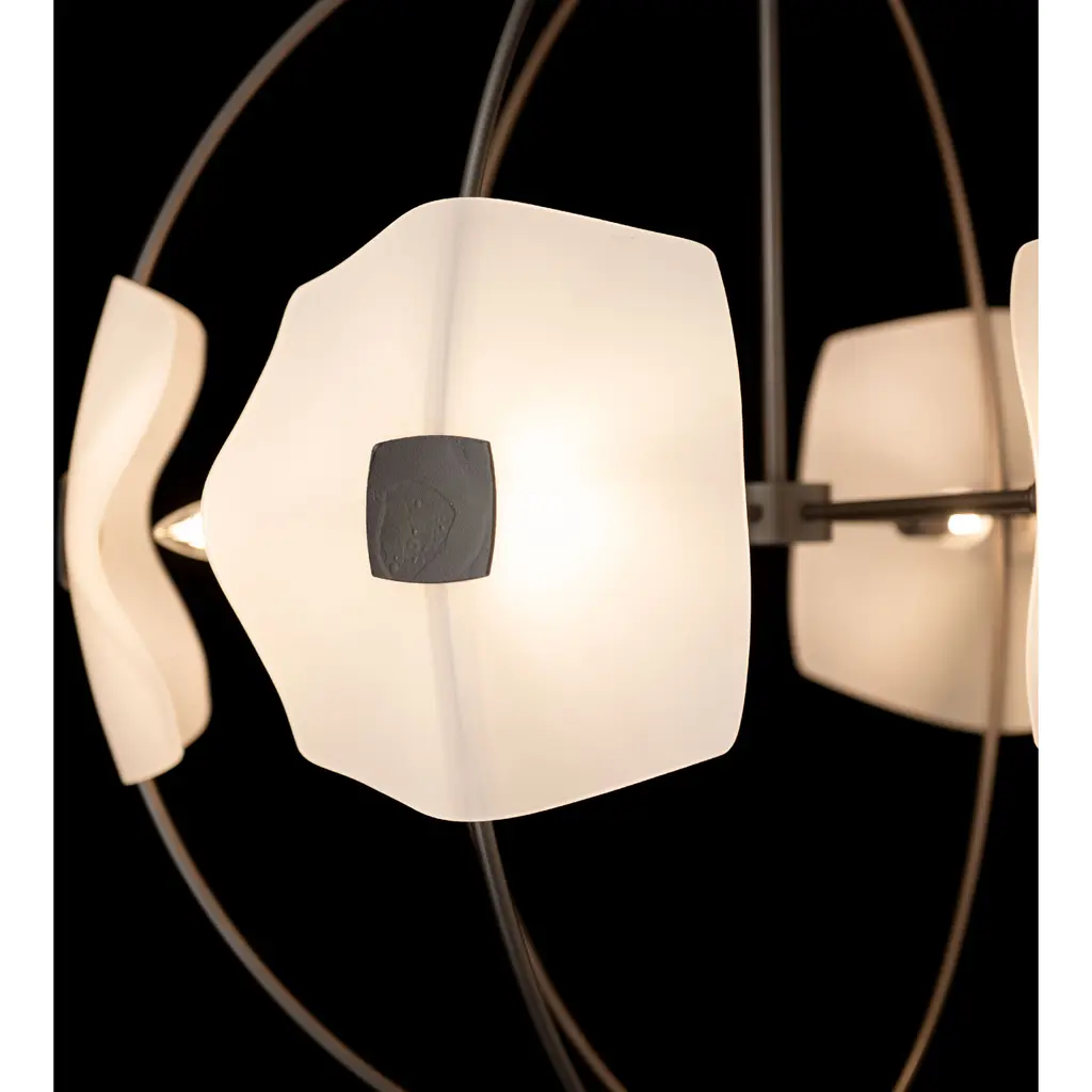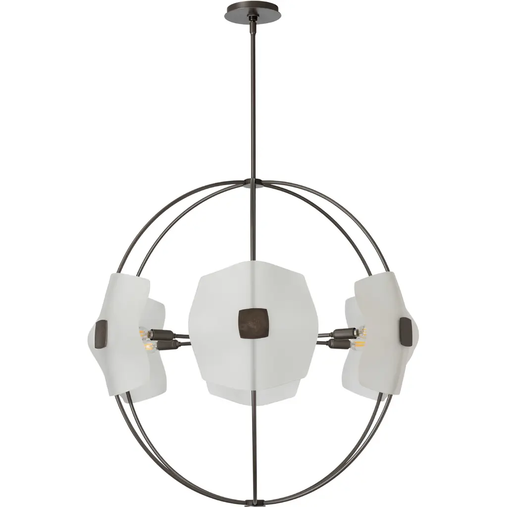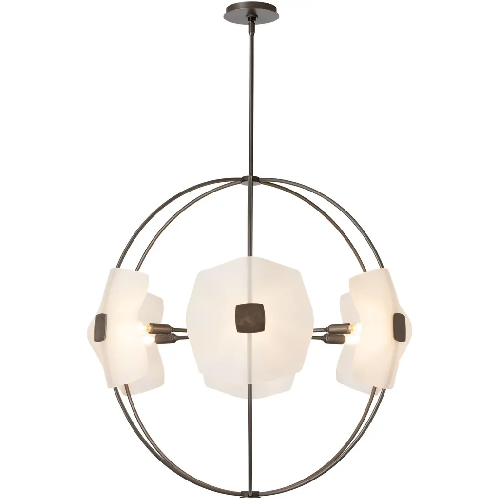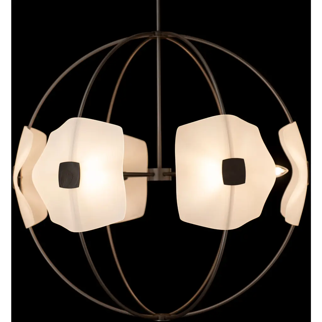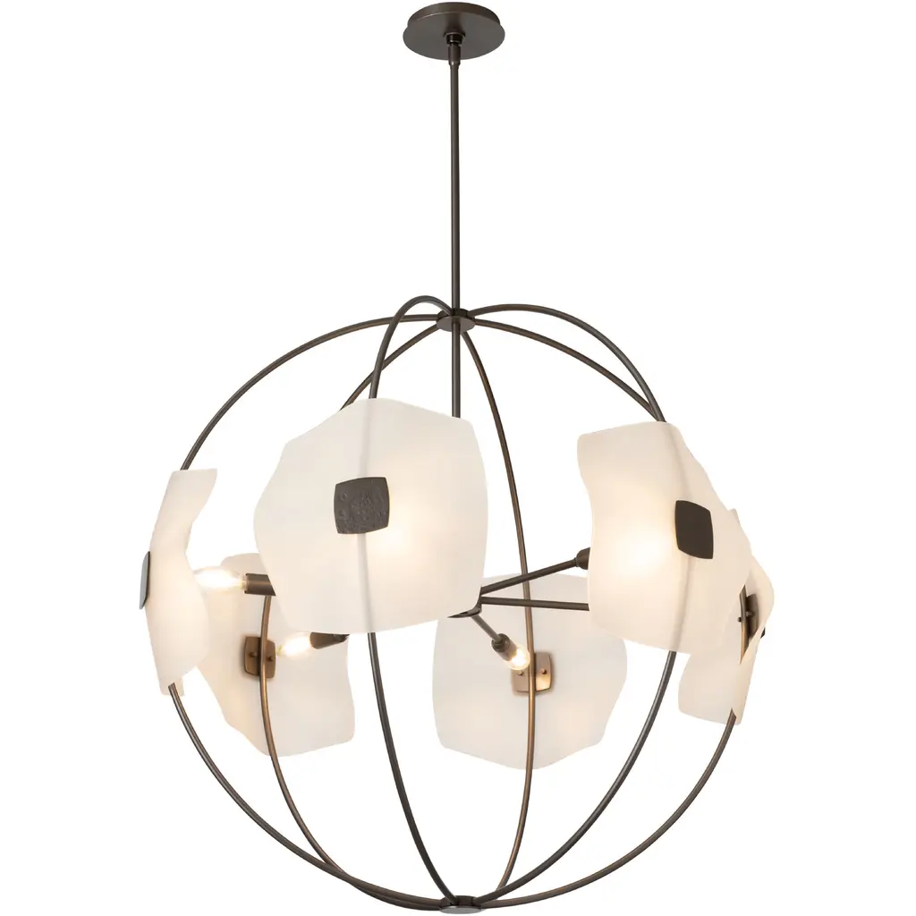 The six light Astra Orb Small Pendant features gently slumped handmade glass, complementing each curved metal arm of the fixture. Each stunning piece of glass is held in place by a hand-forged medallion for a sophisticated look.