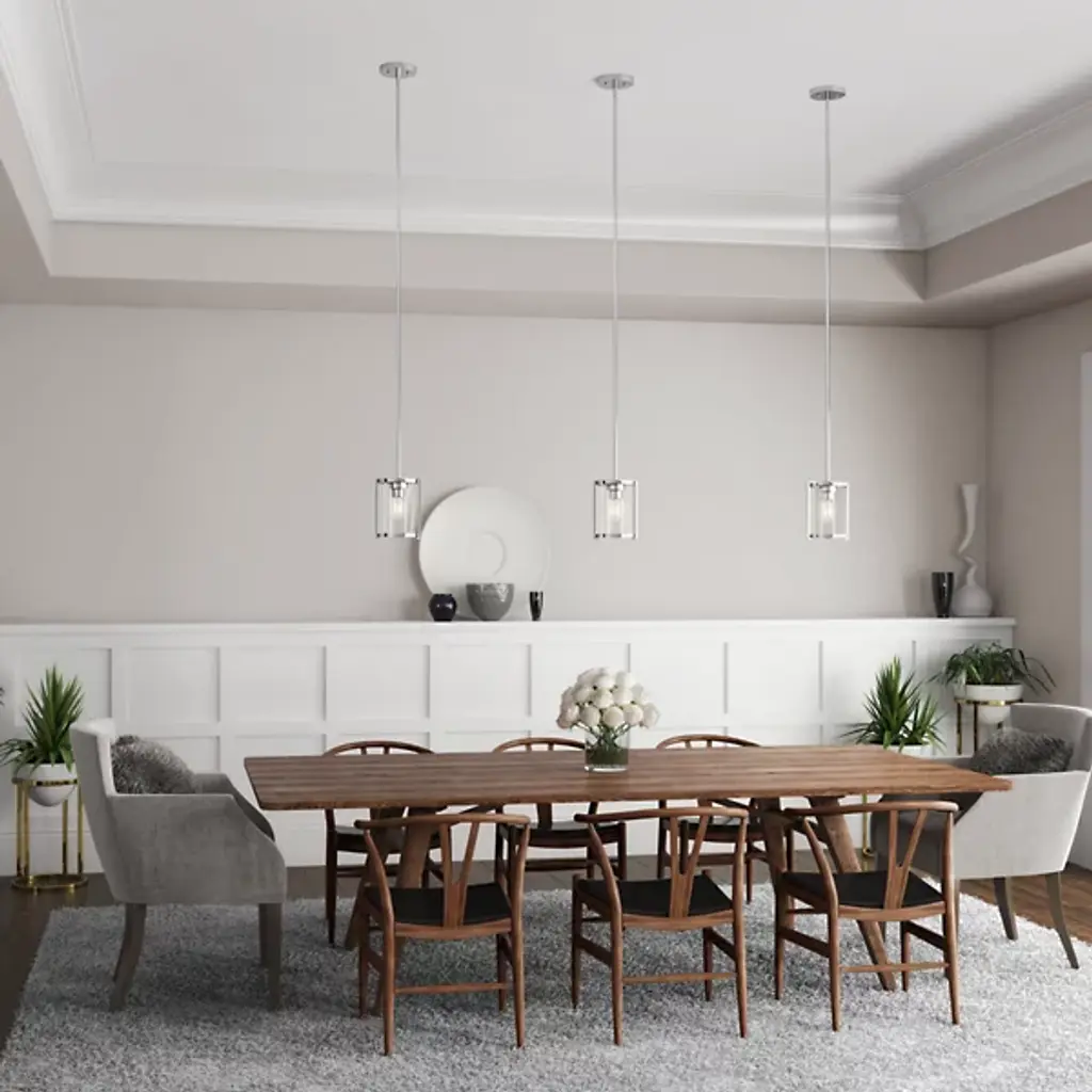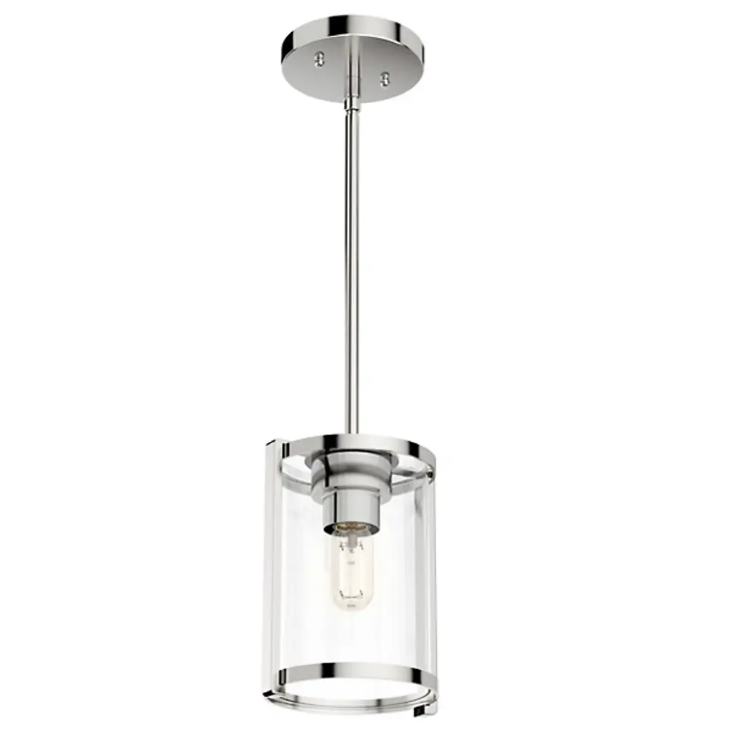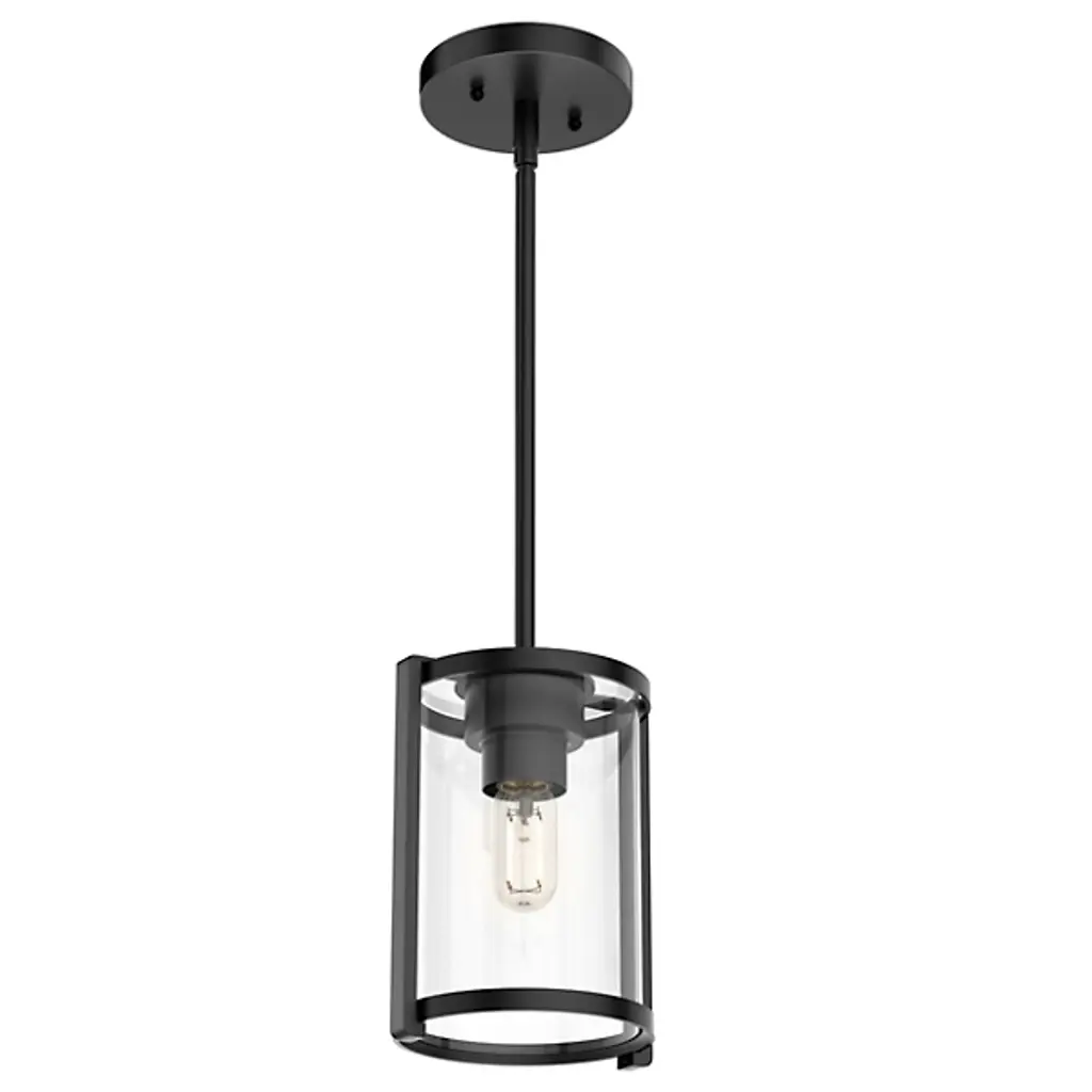 Elevate the look of a modern home with the simple elegance of the Astwood Mini Pendant by Hunter Fans. Clean metal lines form its circular framing, surrounding a single incandescent bulb at its center. The framework supports a clear glass shade that forms a clean cylinder around the lamping and allows for easy, glare-free illumination. Dropped by a slender metal downrod from a circular canopy, this piece is perfect when used in evenly spaced multiples over a kitchen island or dining table.