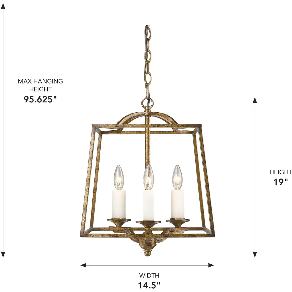 Bring an air of classic sophistication into your home with the Golden Lighting Athena 3-light Pendant. Featuring an opulent Grecian Gold finish and an elegant lantern shape, it enriches your decor with a touch of luxury. This pendant's refined design emphasizes classic candelabra elements without a shade, allowing the beautiful glow of light to shine through. The richly detailed finish combines a warm gold base with a dark bronze patina, offering a treasure-like appearance that radiates warmth. Ideal for dry locations, this fixture enhances kitchens, dining rooms, and entryways, providing focused yet decorative illumination. Sloped-ceiling compatibility allows for versatile installation options, and its adjustable height ranges from 23.625" to 95.625". Dimensions measure 14.5"W x 19"H x 14.5"D, requiring 3 E12 candelabra base bulbs (not included) with a maximum wattage of 60 per bulb. Elevate your interiors with the signature style and quality that Golden Lighting delivers in every piece.