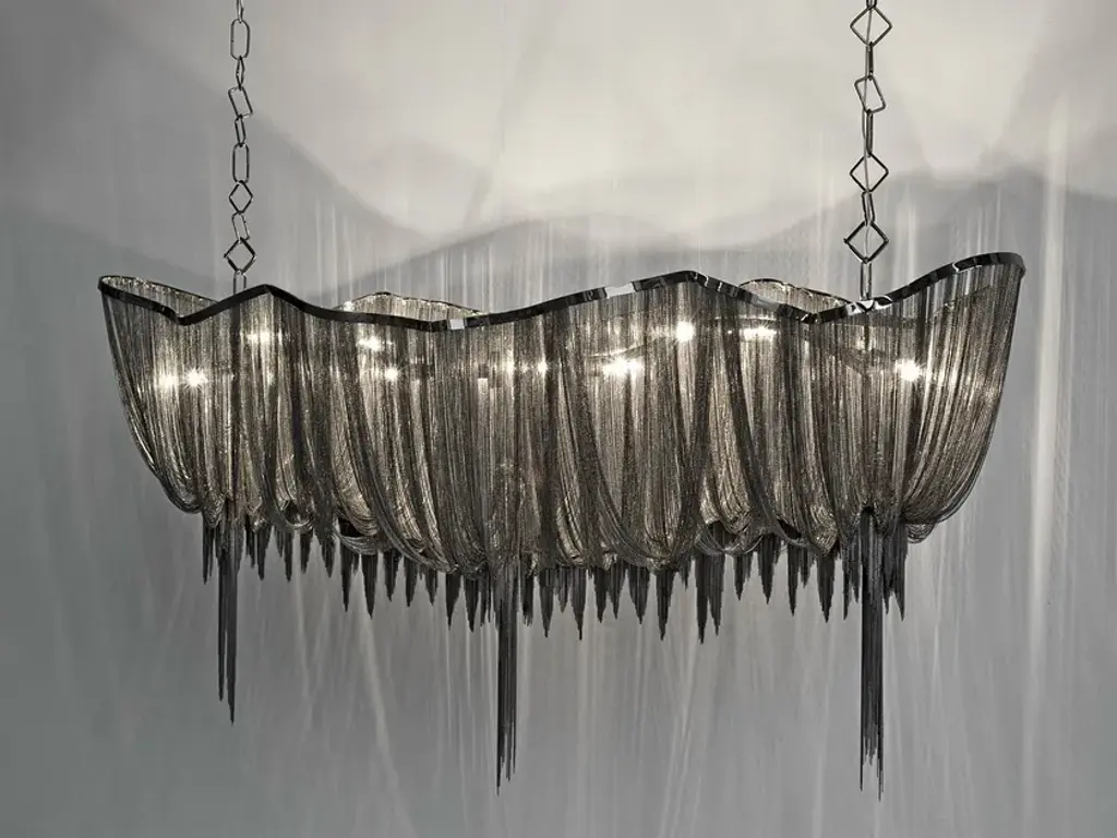 Drawing from the wealth of knowledge and experience of Terzani craftsmen, Precious Project truly elevates light to an art form. Using a unique combination of precious materials, artisan craftsmanship, respect for tradition and cutting edge technology, Precious Project includes unique, luxurious heritage pieces that define a new period of Italian craftsmanship.Seemingly alive, Atlantis shimmering light creates a vibrant source of energy. Its mesmerizing, organic effect is created by hundreds of illuminated lengths of draped, nickel chain. Like water in the ocean, Atlantis chains appear liquid, cascading over its gloss nickel bands and falling down towards the abyss before turning back into itself. Atlantis is composed of almost three miles of chain, meticulously hand-crafted by master Italian artisans.Available in the champagne new finish.