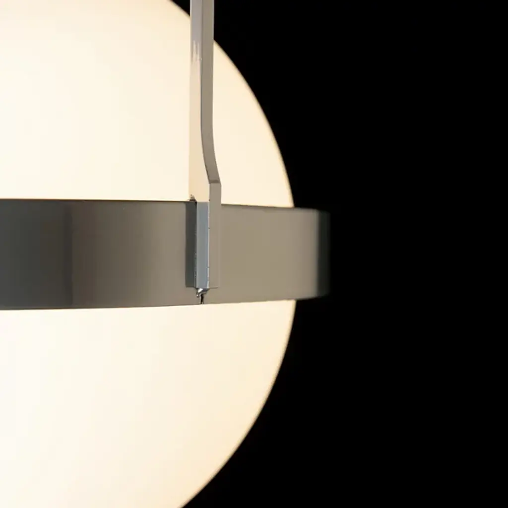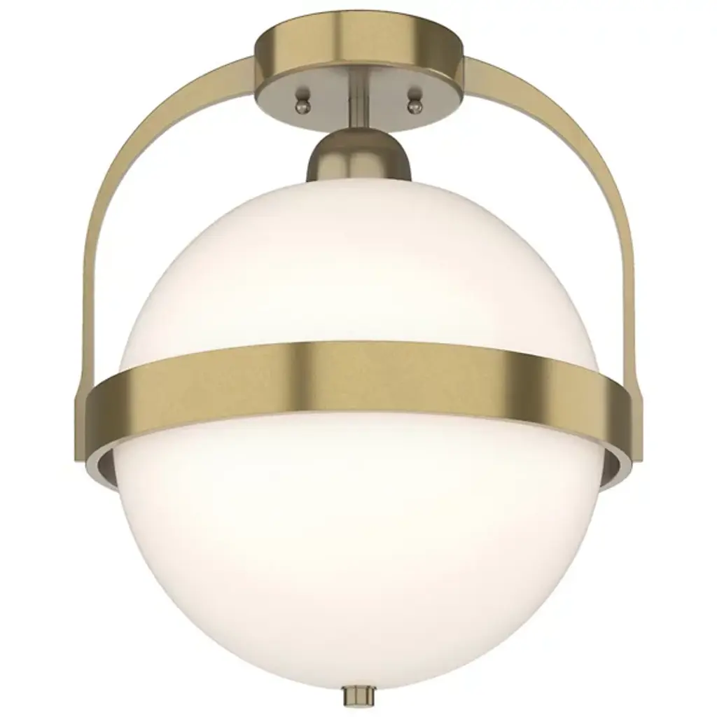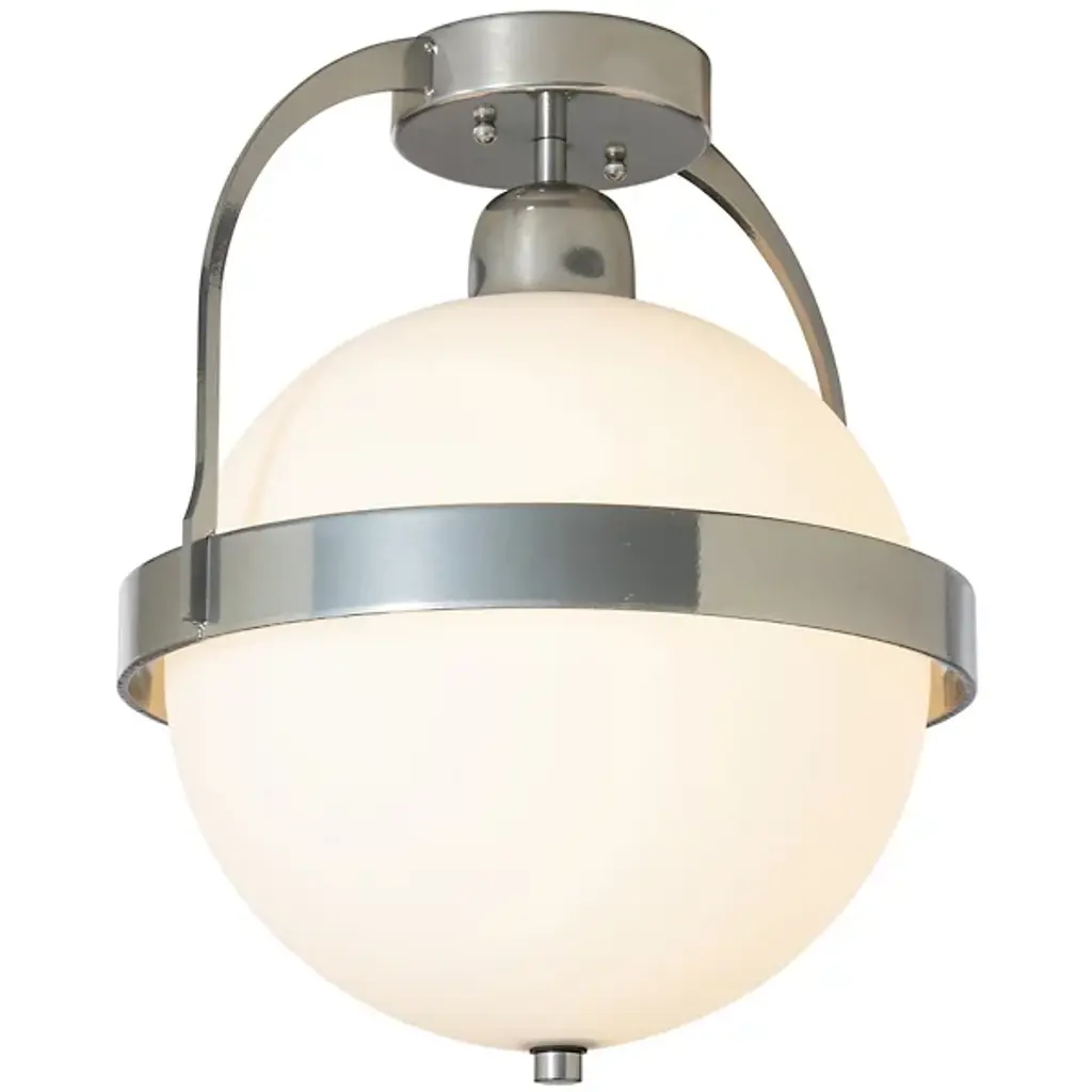 The Hubbardton Forge Atlas Semi-Flushmount plays on spherical design, using circles and half domes as focal points. Clean and simple steel lines add extra dimension and stability to the semi-flush mount. In our semi-flush full sphere pendant, a round base sits against the ceiling attached to a short linear rod that extends down to cup the top of the globe. A slim band wraps around the sphere's center point, attached to two curved rods that extend upward and fuse. Hang this semi-flush mount light in your hallway to reveal an outpour of warm light.