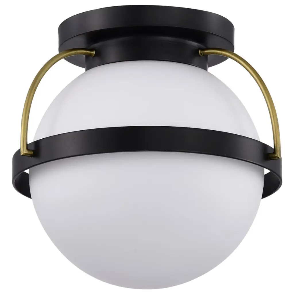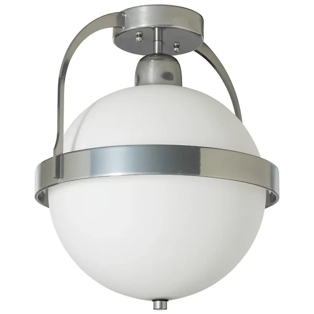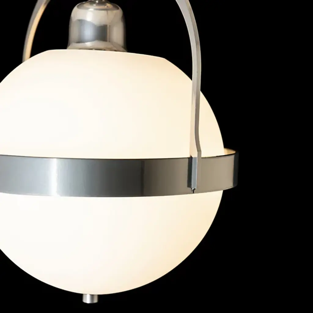 The Hubbardton Forge Atlas Semi-Flushmount plays on spherical design, using circles and half domes as focal points. Clean and simple steel lines add extra dimension and stability to the semi-flush mount. In our semi-flush full sphere pendant, a round base sits against the ceiling attached to a short linear rod that extends down to cup the top of the globe. A slim band wraps around the sphere's center point, attached to two curved rods that extend upward and fuse. Hang this semi-flush mount light in your hallway to reveal an outpour of warm light.