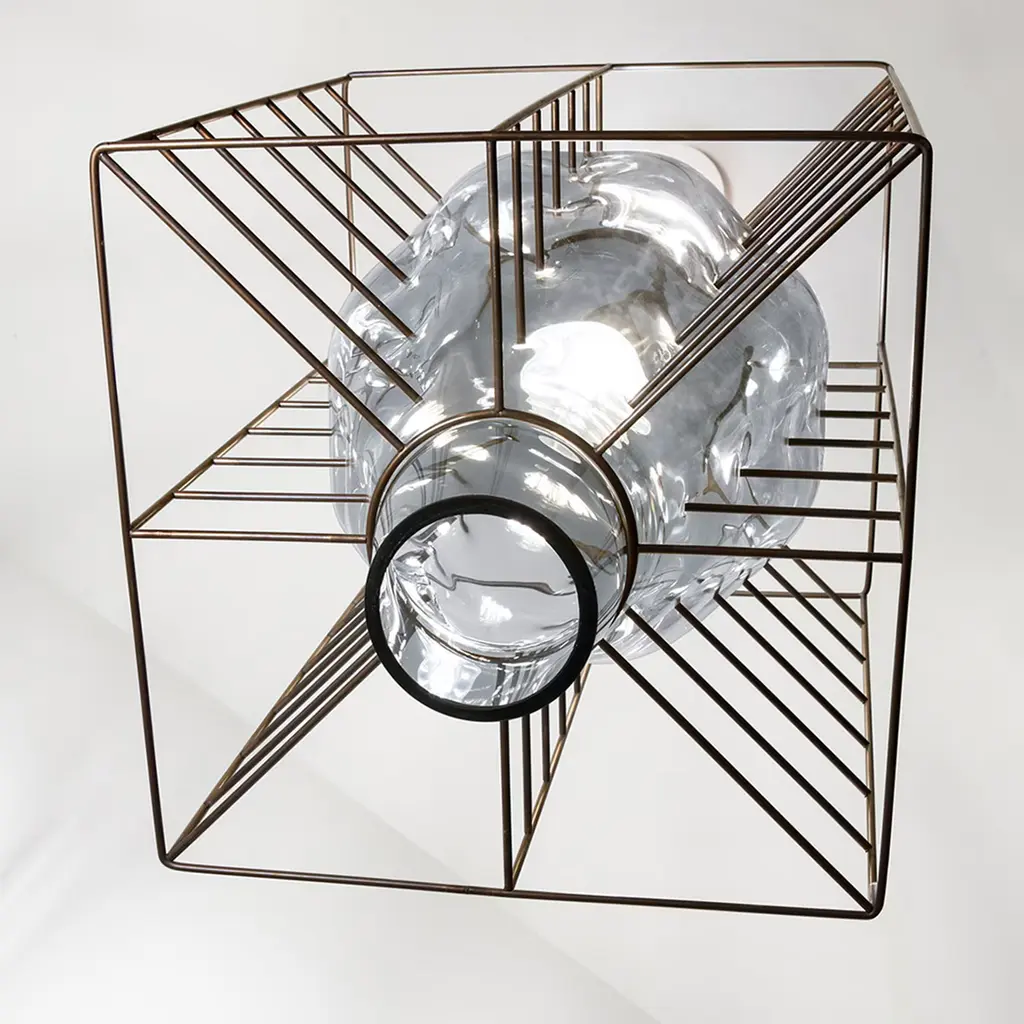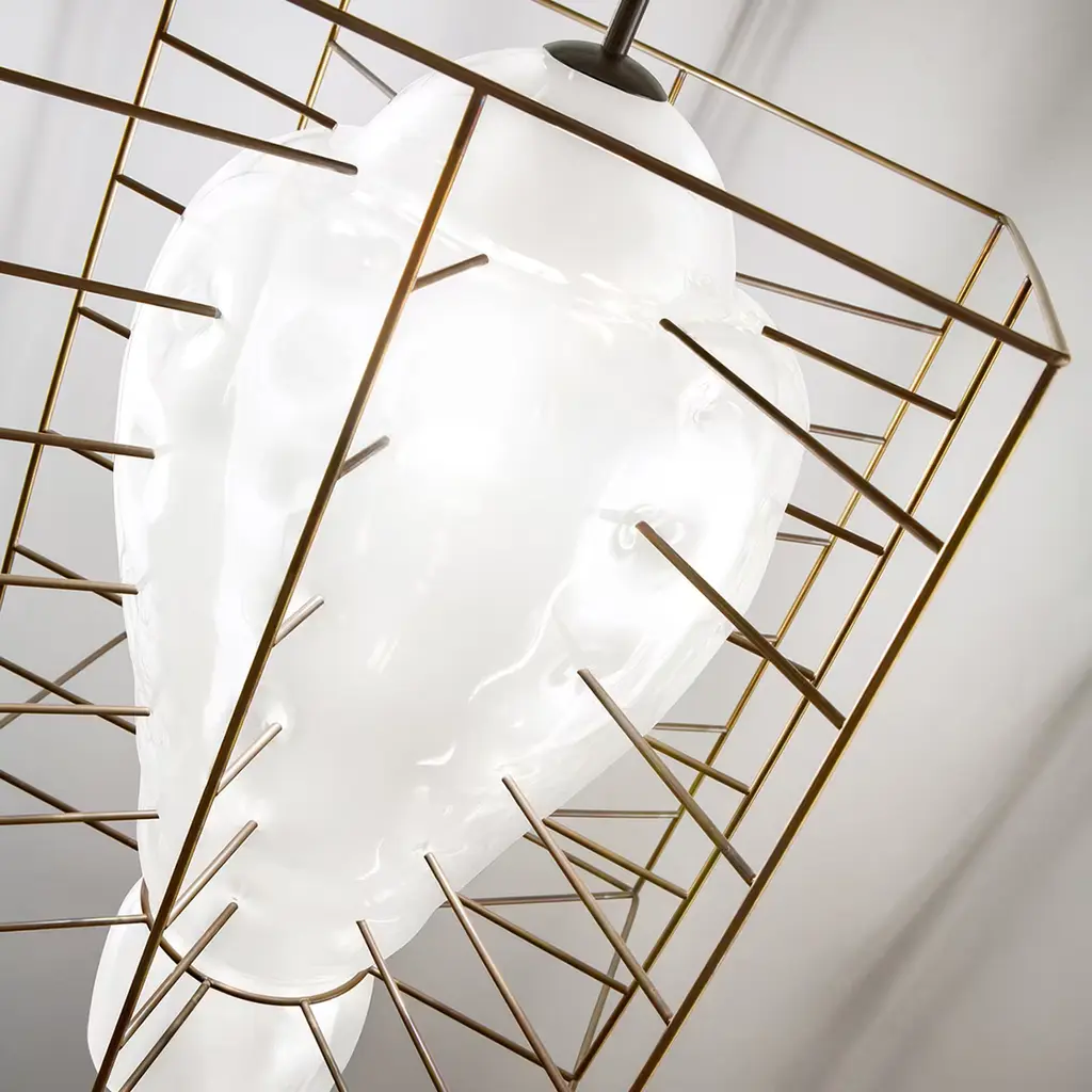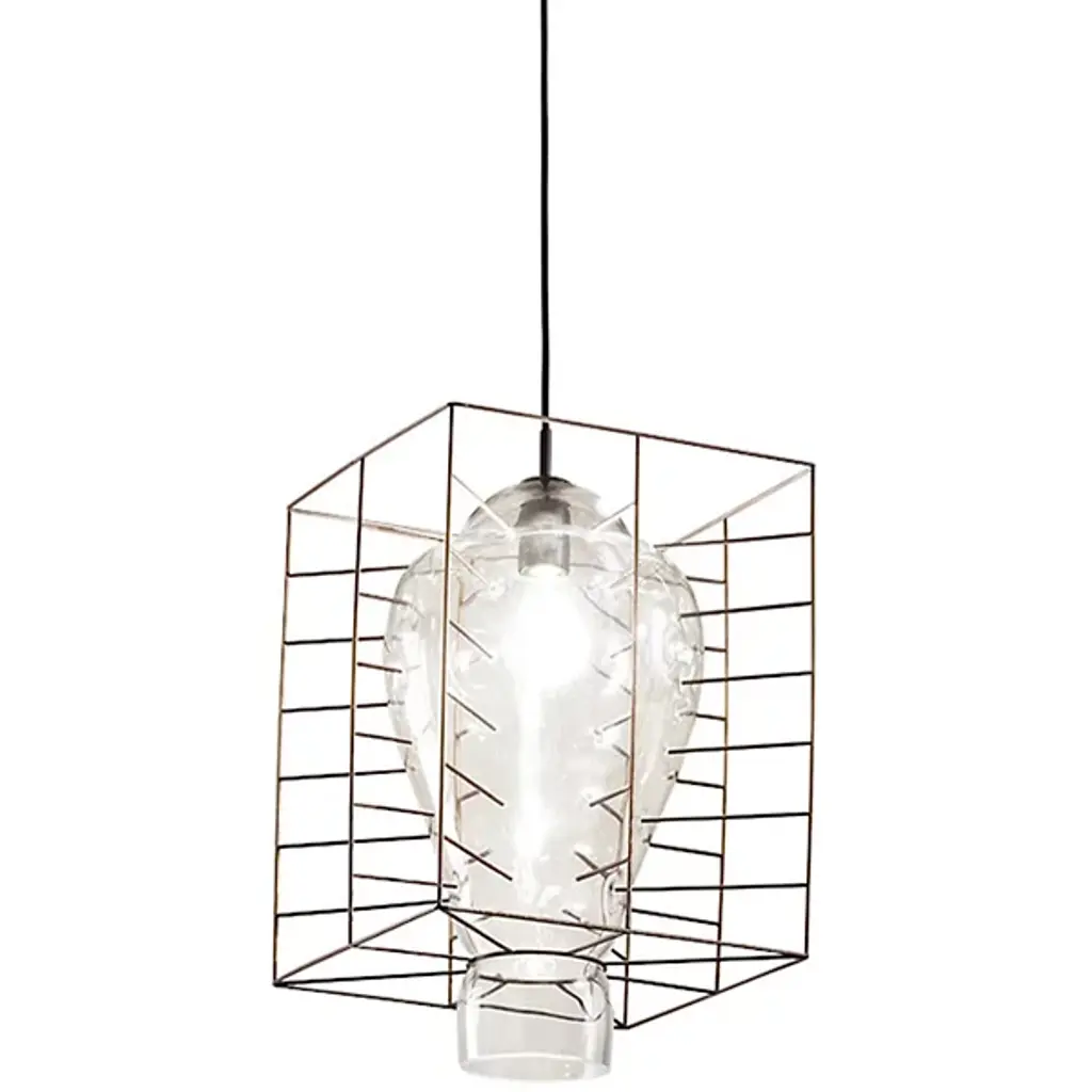 A bud-like diffuser crafted of clear glass and encased in a sculpted steel cage defines the sculptural design of this superb pendant lamp, ideally suspended over entryways or dining tables Thin needles, incorporated in the cage, caress the glass shade creating soft dimples on its surface that splendidly amplify the already bright reflections caused by the light emitted from within. Table variants are also available upon request to the Concierge. The product includes a white ceiling canopy. It is possible to request the ceiling canopy in different colors.