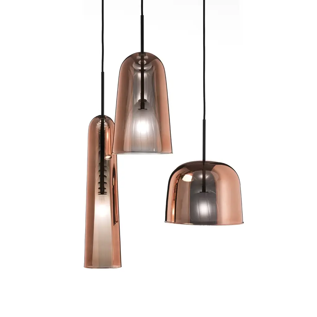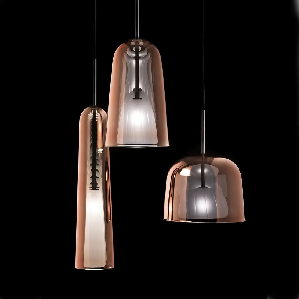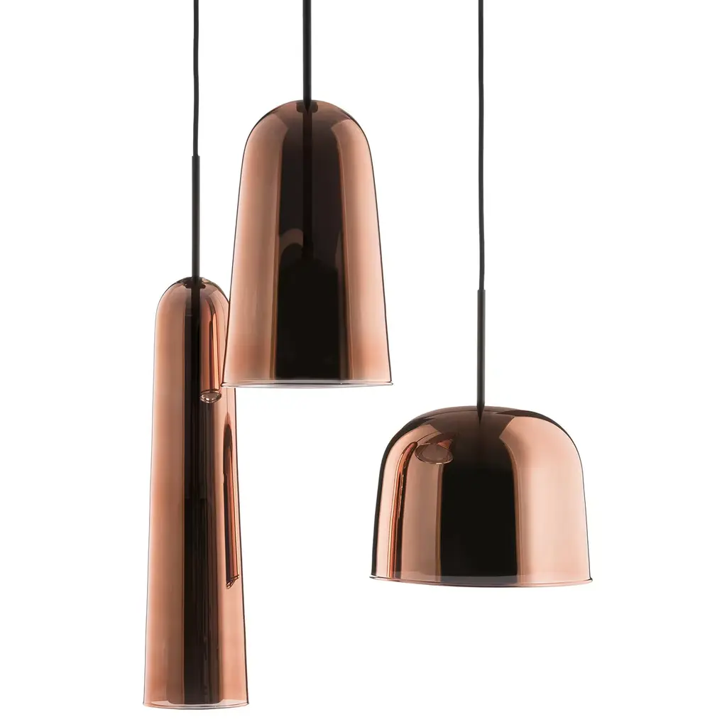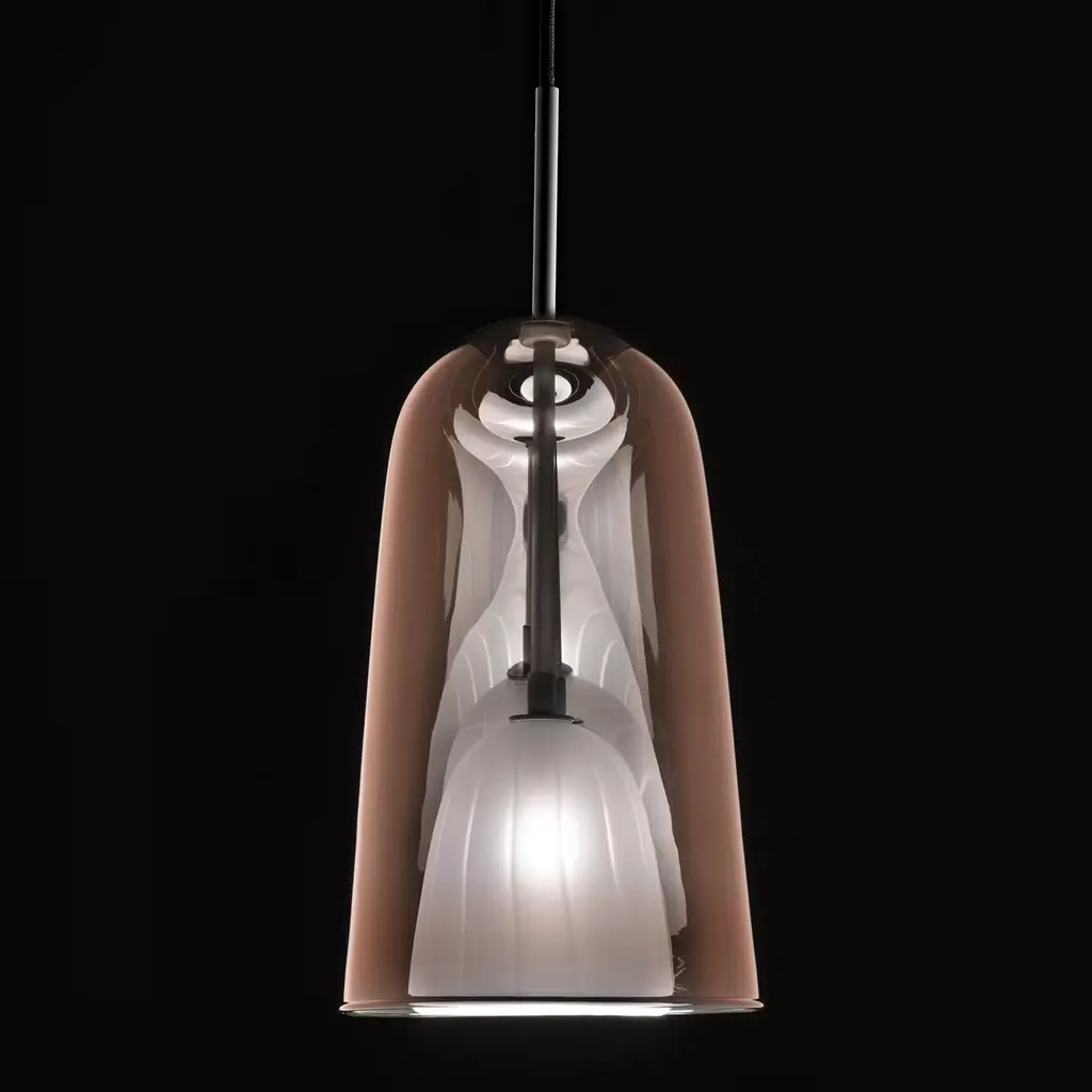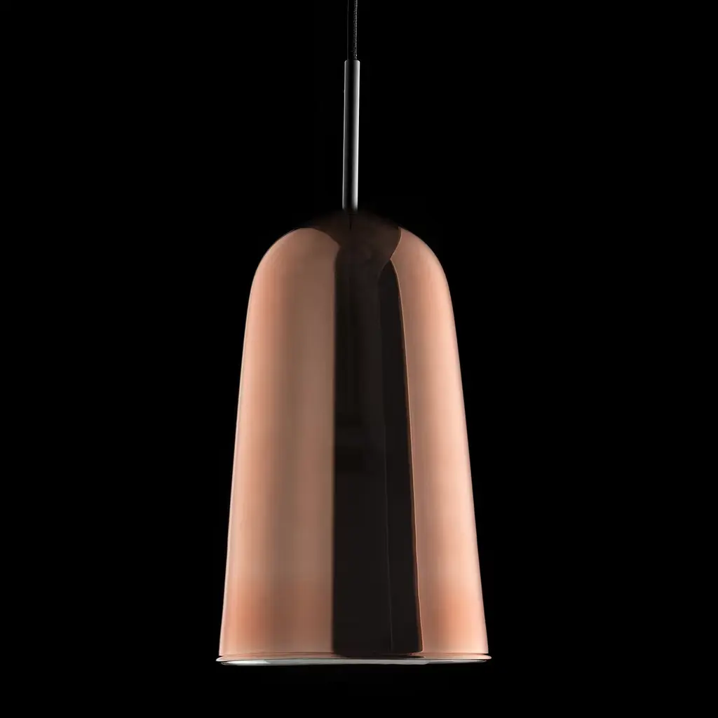 This ceiling lamp has a double-domed shape, featuring an external structure in copper metalized glass, which gives it the look of high-end, haute-cuisine cookware. Inside, it hides the second shade in a ridged, frosted-white glass. Available in three sizes, with different heights and diameters. Handmade in Italy by master artisanal craftsmen. Light source: 1xG9 LED, max 6 watts.