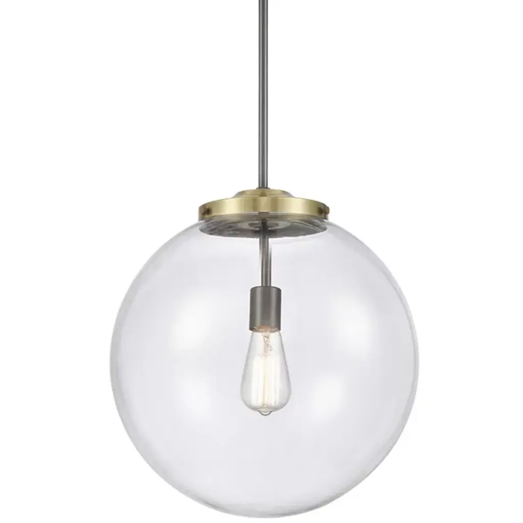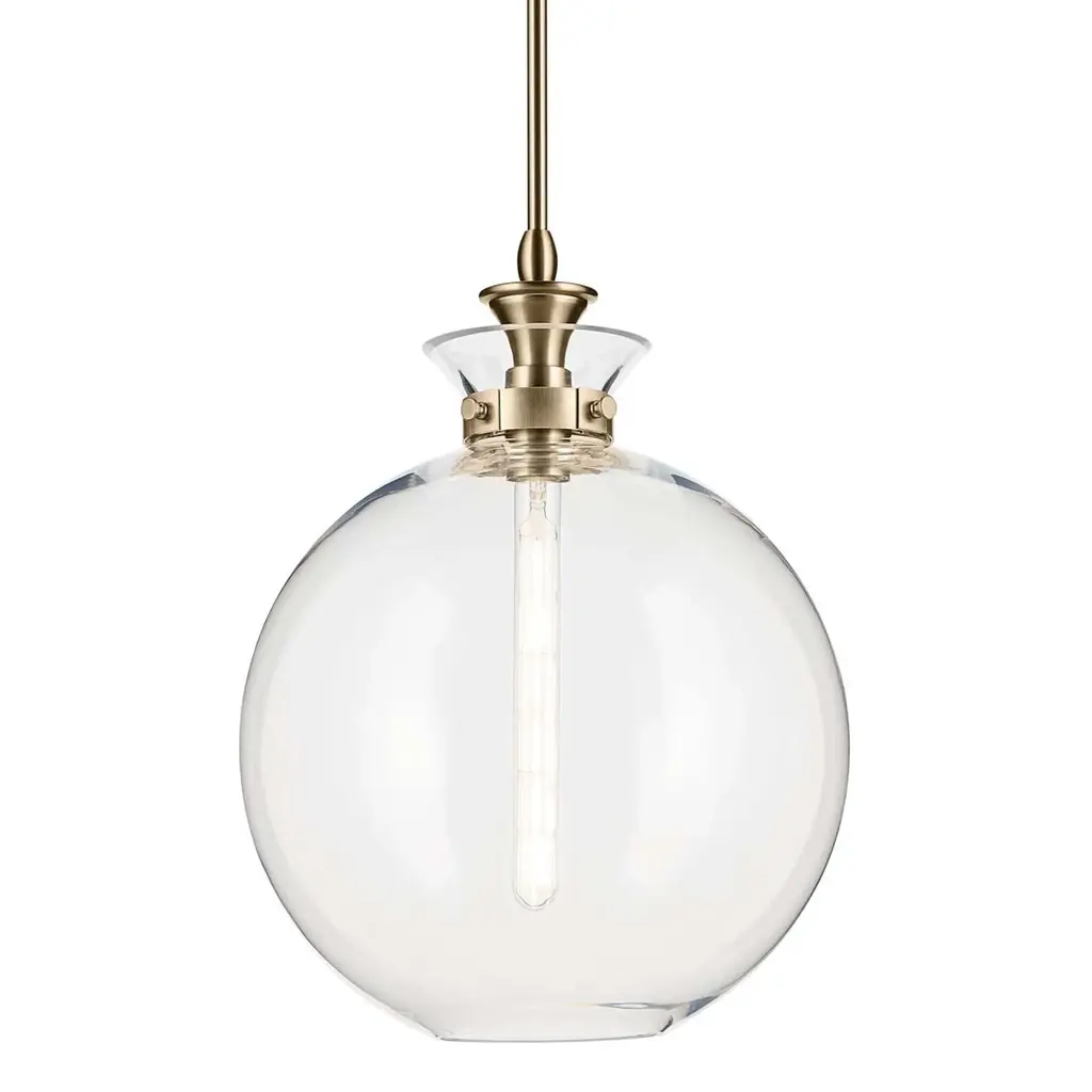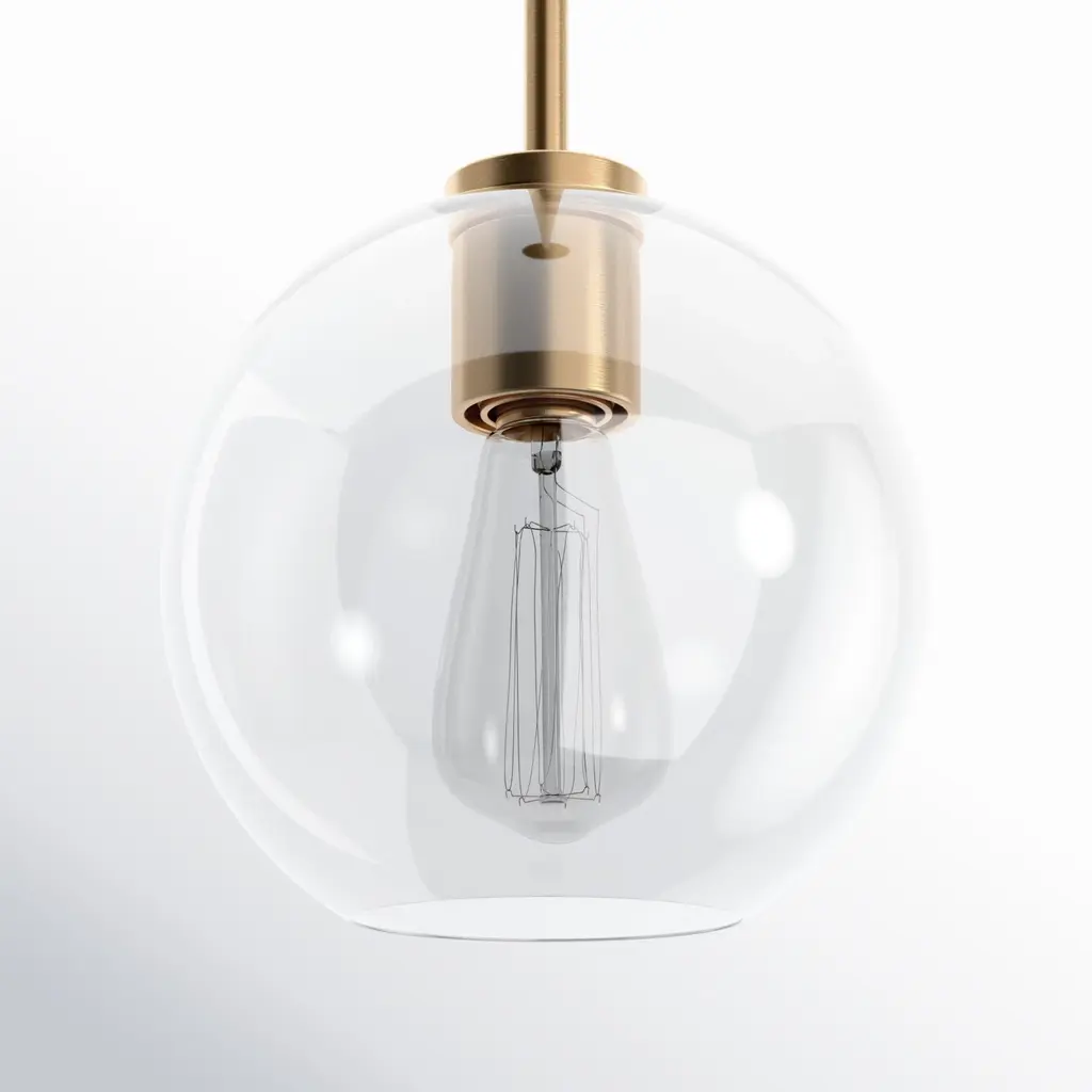 A light source glows from within a clear glass globe shade that fosters a soft and enduring design. The metal cap and light base are coated in a beautiful brushed bronze finish that accentuates the hanging light's modern aesthetic.