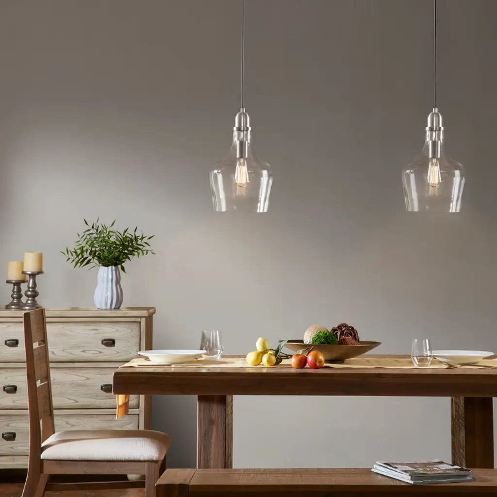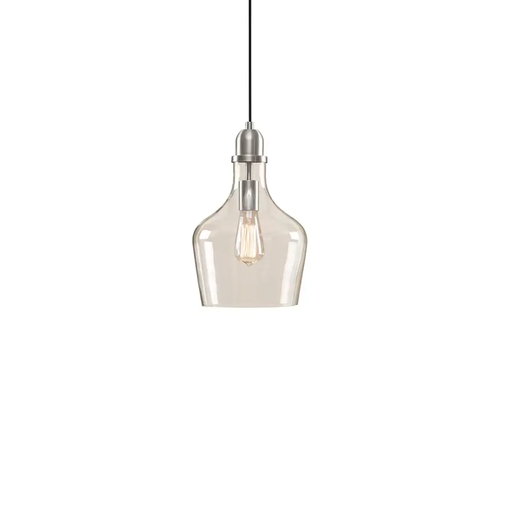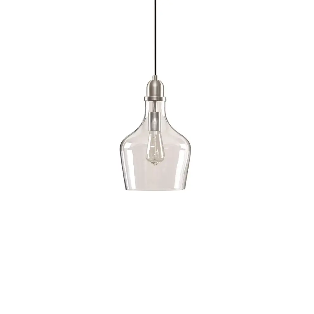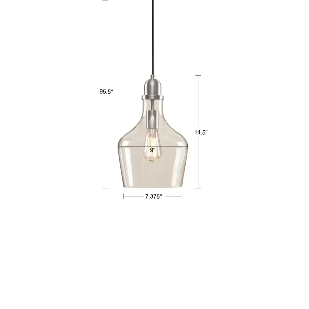 Description Illuminate your home decor with the simple, industrial style of the Hampton Hill Auburn Bell Shaped Glass Pendant. Featuring a bell-shaped glass shade this ceiling pendant could be mounted on vaulted or angled ceilings. A metal finish completes the look and complements a variety of kitchens and entryways. Comes with a 2 year limited warranty. Professional installation and assembly is required. 1 Type-A light bulb is needed and NOT included. Spot clean only. Product Details See below 1 Pendant:9in Dia x 95.5inH Body Size:9in Dia x 14.5inH Shade Size:7.375in Dia x 9in Dia x 11inH Socket Size:1.5in Dia x 2.5inH Cord Length:80in Canopy Pendants:5in Dia x 1inH Number of Bulbs Needed:1 Material Material: 70% glass, 25% iron, 5% cord Base Material: Iron Base Finish: Silver Shade Material: Glass