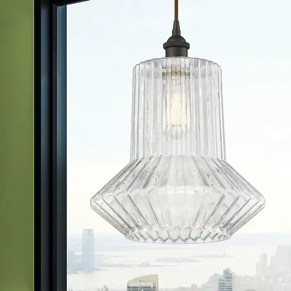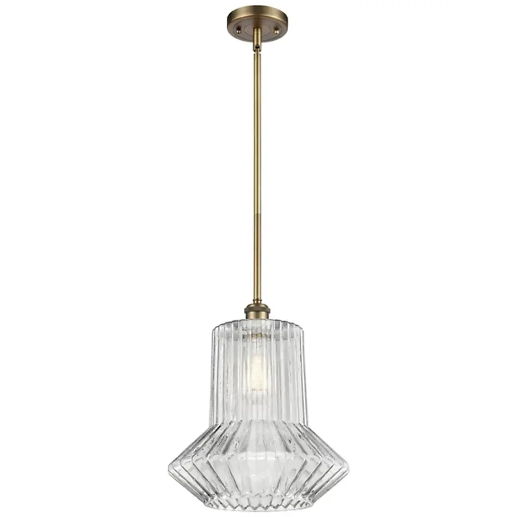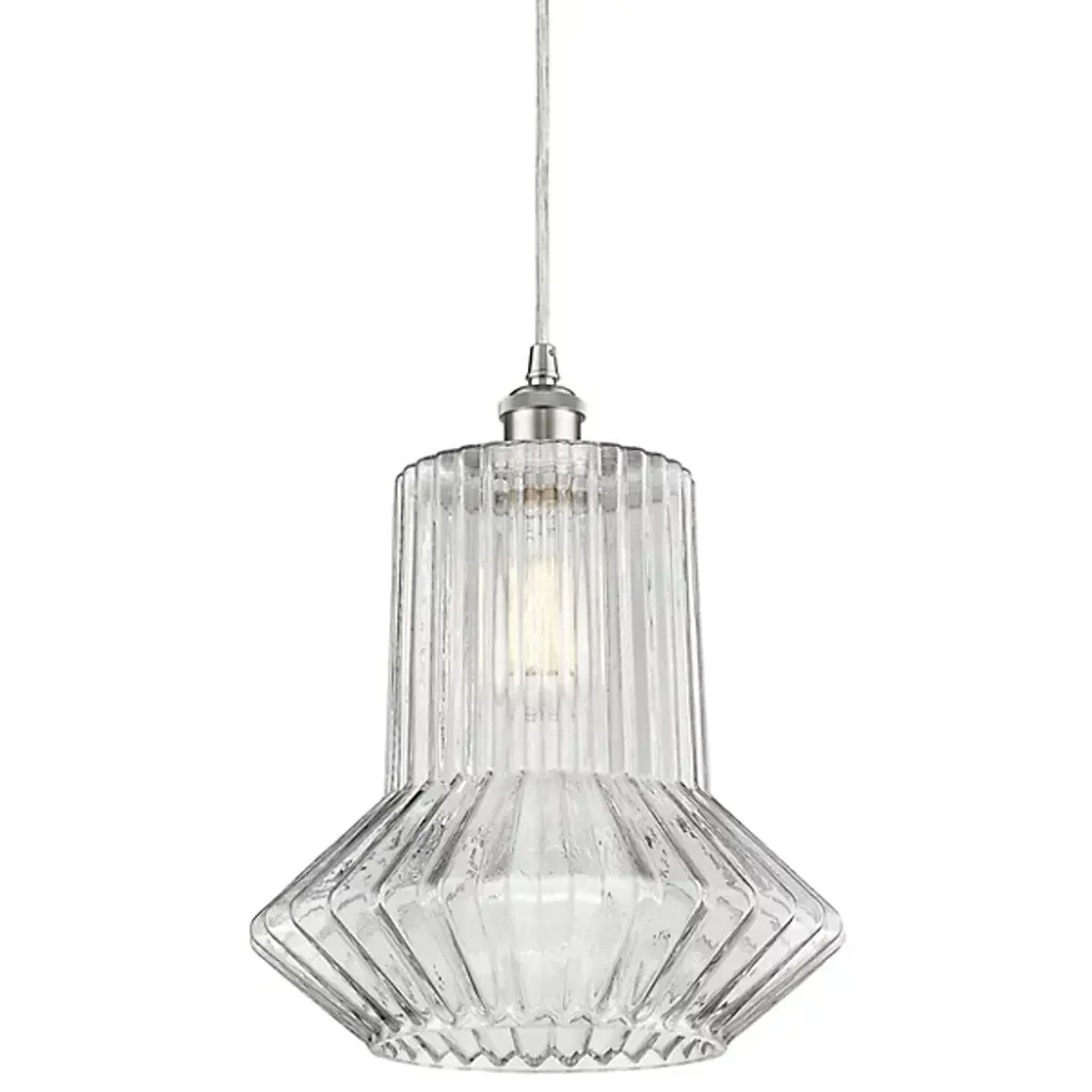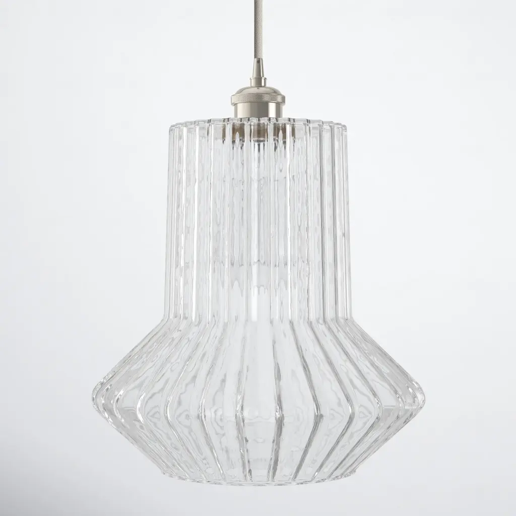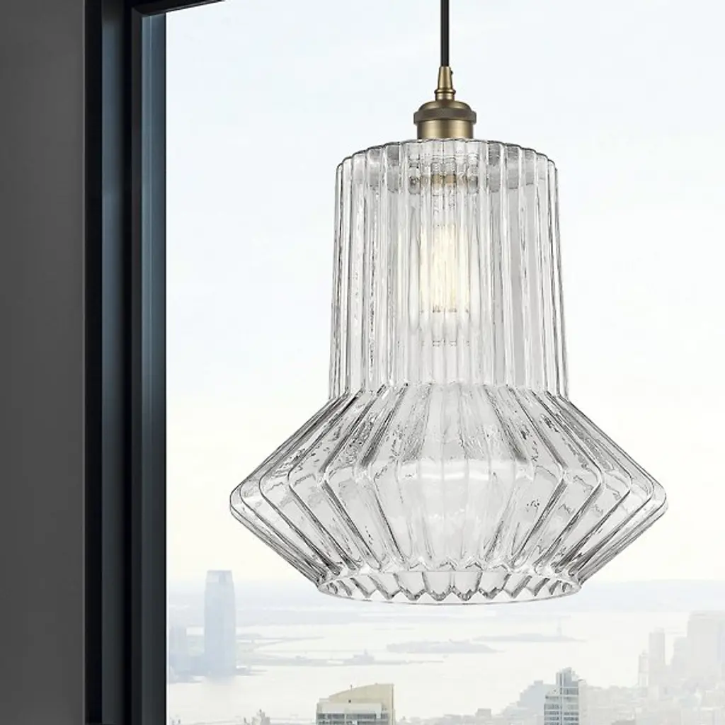 The Audan Mini Pendant by Alder & Ore brings beauty and ambient lighting to home or office lighting. Starting with the round cast brass ceiling plate, the pendant light showcases an industrial-style socket complete with knurled details. Stealing the show is the art deco-style fluted glass shade. When lit the pendant emits a warm ambient glow, with some reflective light play. This indoor pendant light complements many design styles and will elevate the lighting in a kitchen eating space, entryway, and dining room.