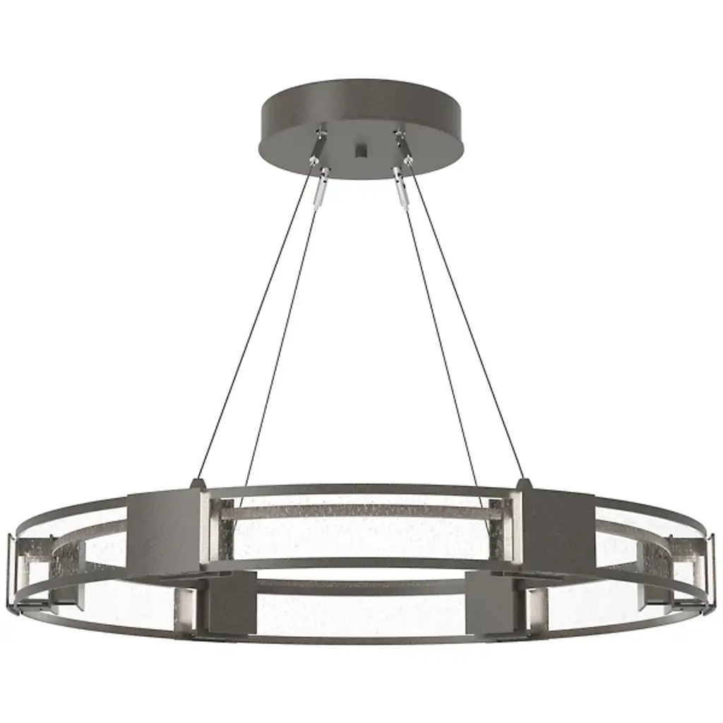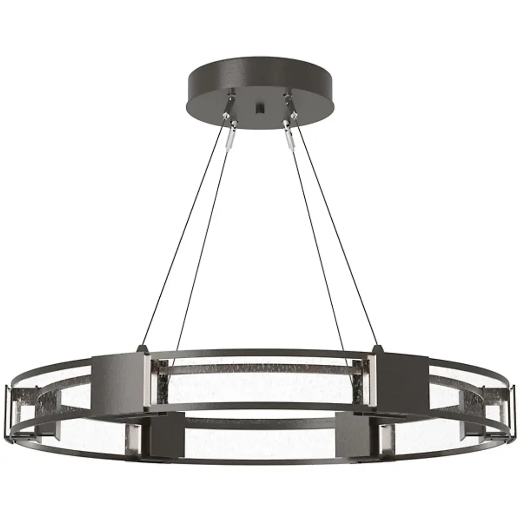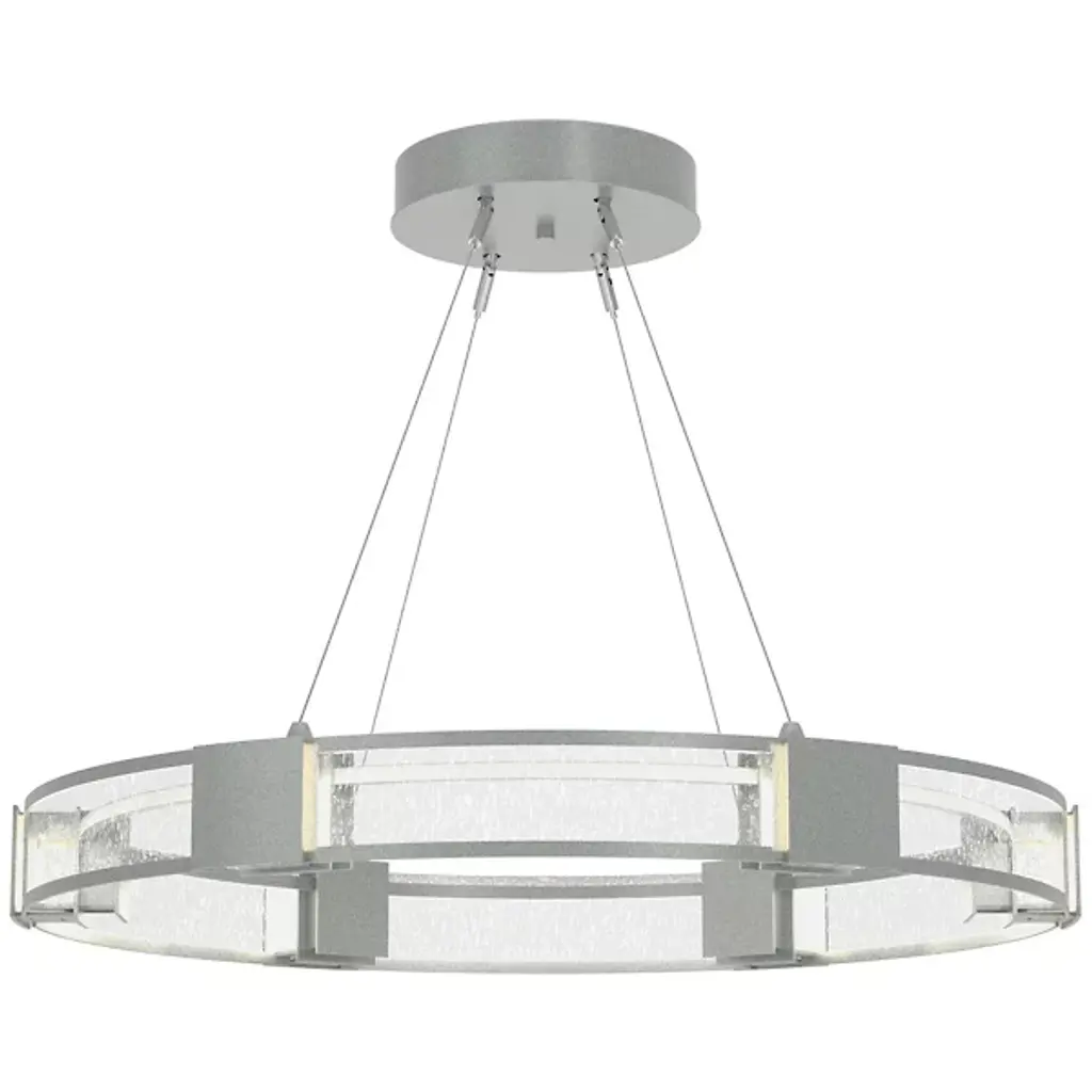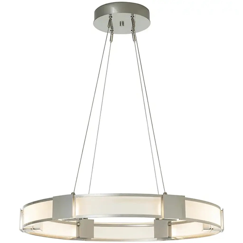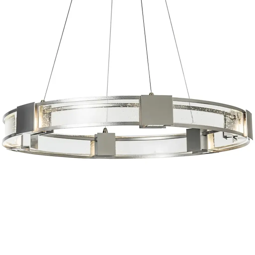 Modern lighting design that disperses a heavenly halo of ambience. The Aura Glass Pendant by Hubbardton Forge does so via 6 curves of glass, which are connected to form a ring shape and accented by sleek steel supports. The steel squares also discreetly house the lightbulbs and direct the light they produce all around the ring of glass. Use this pendant light to add functionality and be the contemporary centerpiece you need in a dining room or tall entryway.