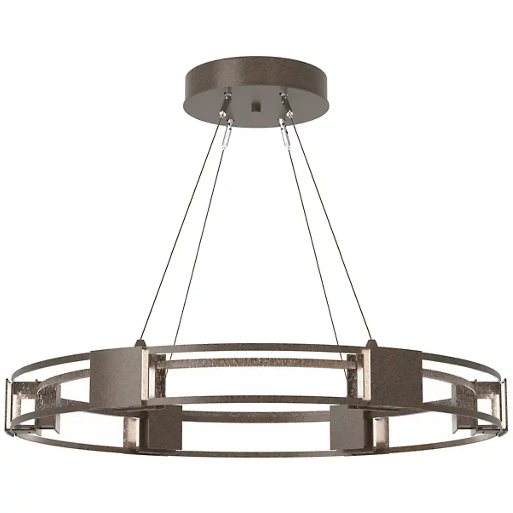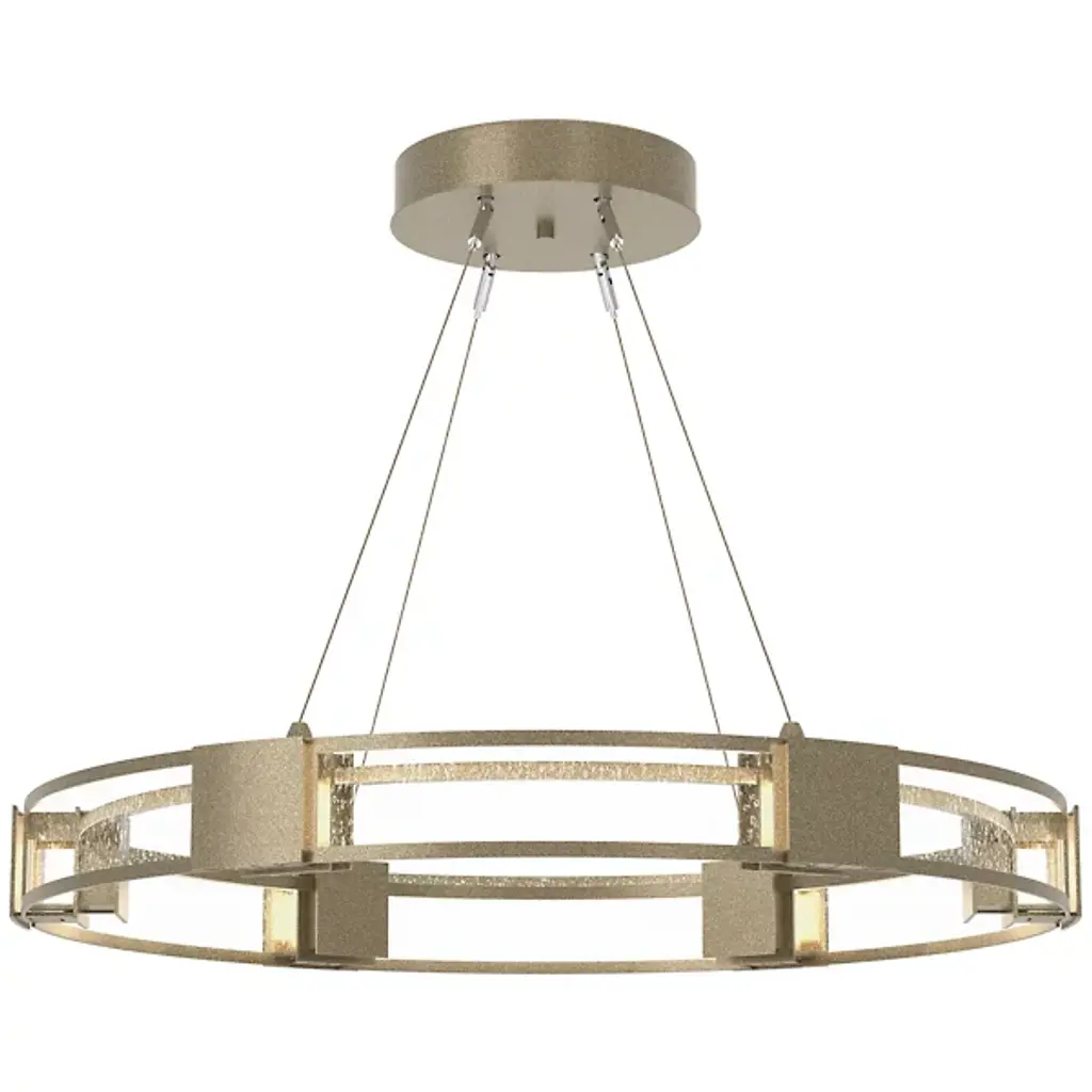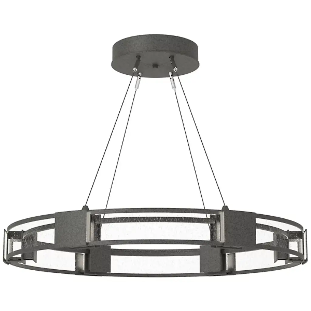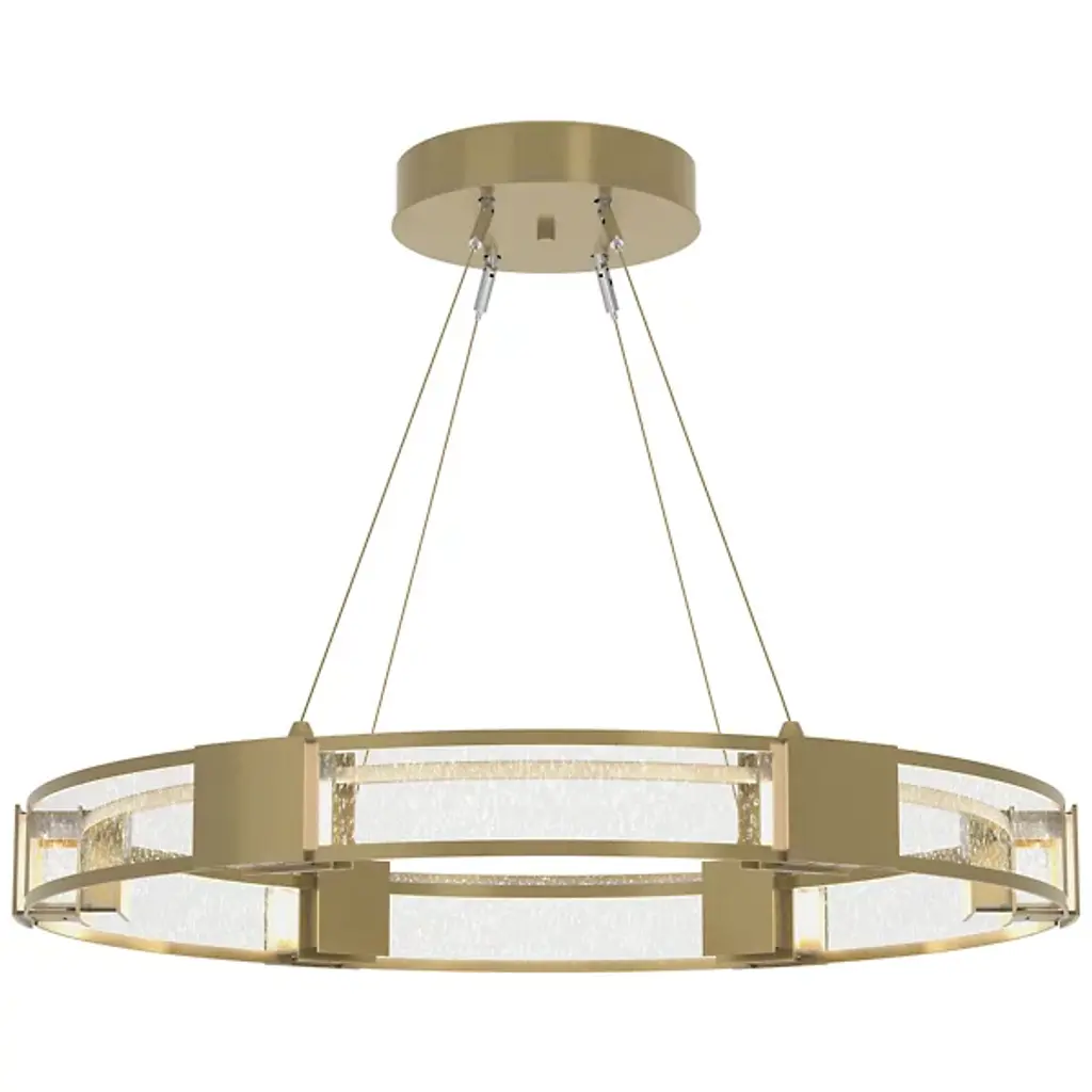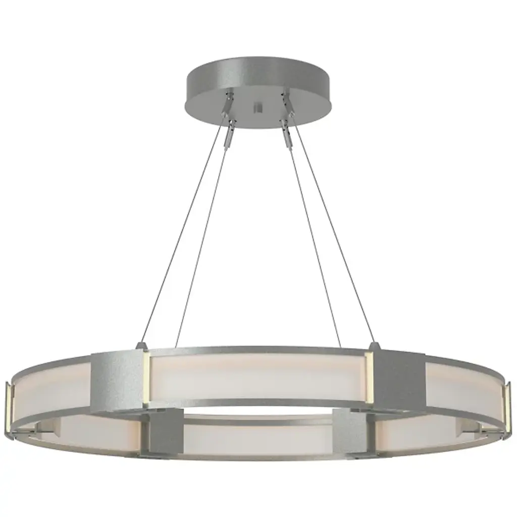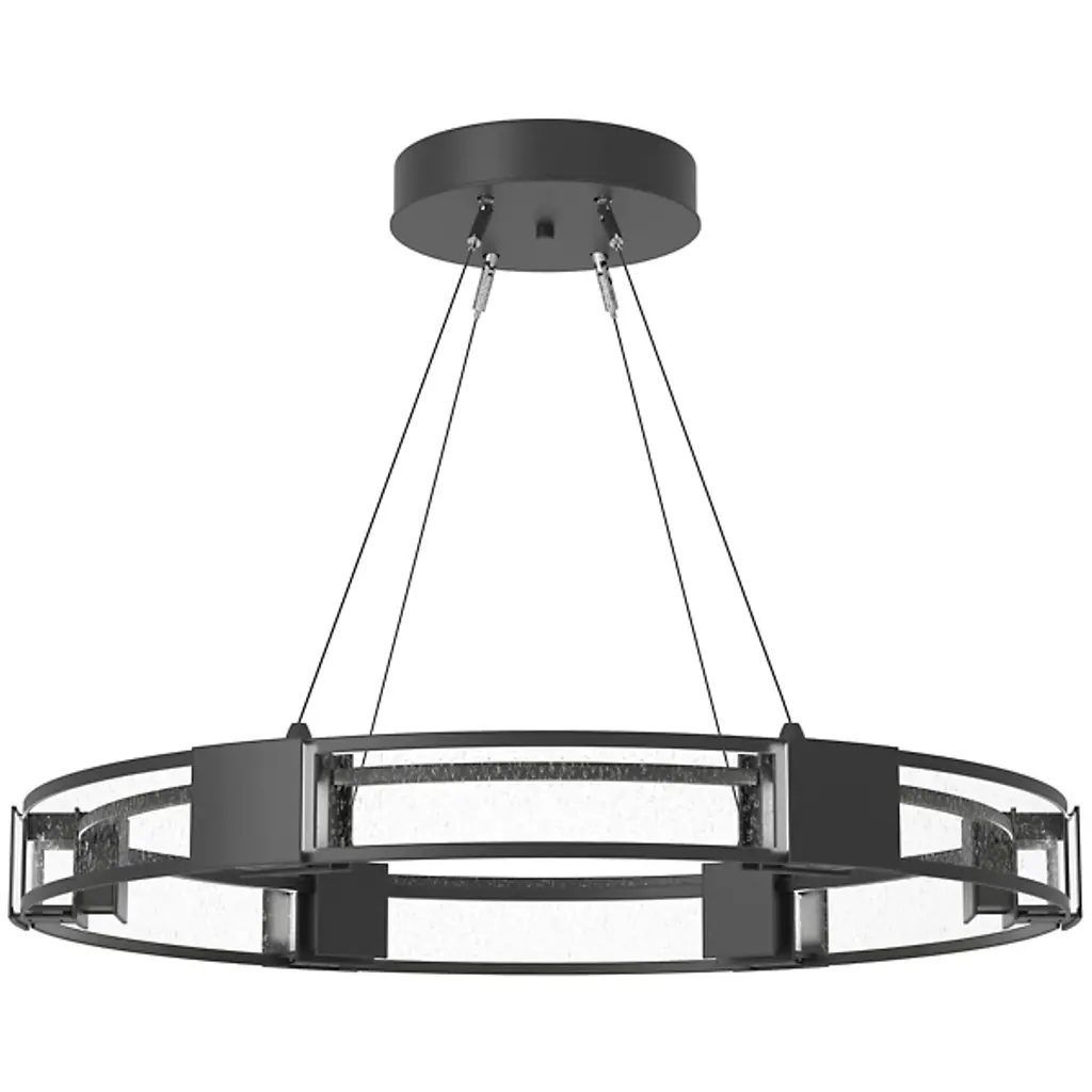 Modern lighting design that disperses a heavenly halo of ambience. The Aura Glass Pendant by Hubbardton Forge does so via 6 curves of glass, which are connected to form a ring shape and accented by sleek steel supports. The steel squares also discreetly house the lightbulbs and direct the light they produce all around the ring of glass. Use this pendant light to add functionality and be the contemporary centerpiece you need in a dining room or tall entryway.