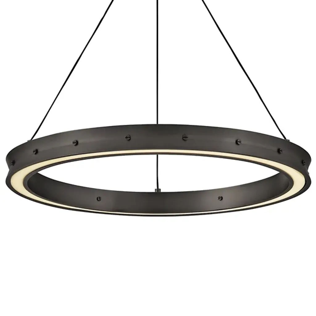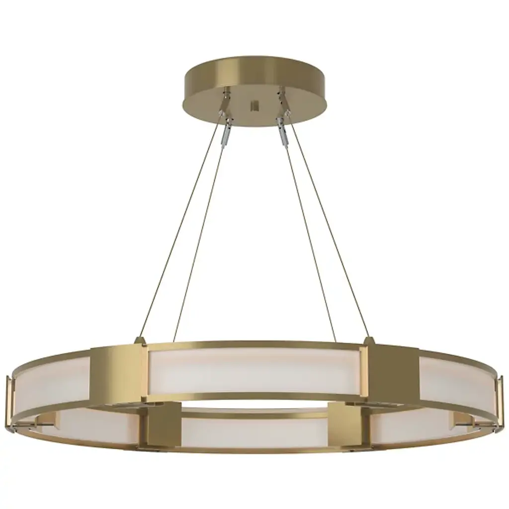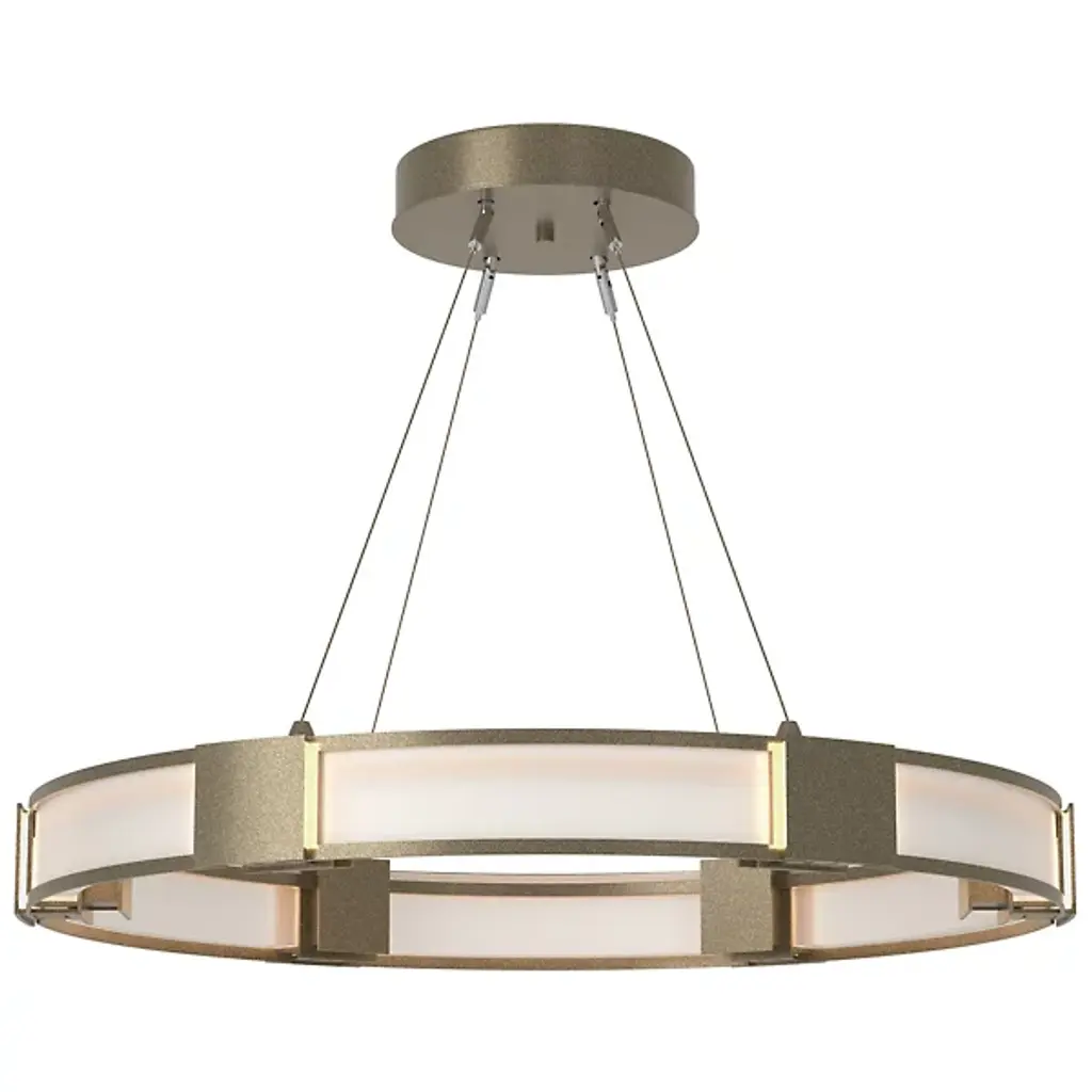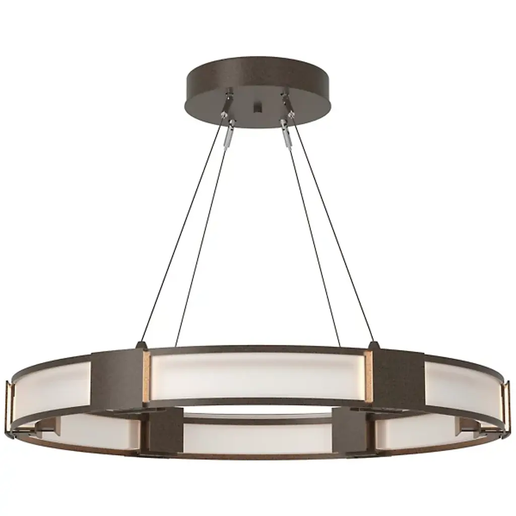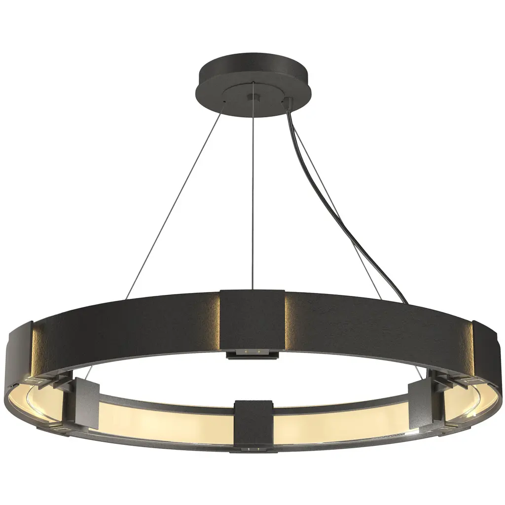 Modern lighting design that disperses a heavenly halo of ambience. The Aura Glass Pendant by Hubbardton Forge does so via 6 curves of glass, which are connected to form a ring shape and accented by sleek steel supports. The steel squares also discreetly house the lightbulbs and direct the light they produce all around the ring of glass. Use this pendant light to add functionality and be the contemporary centerpiece you need in a dining room or tall entryway.