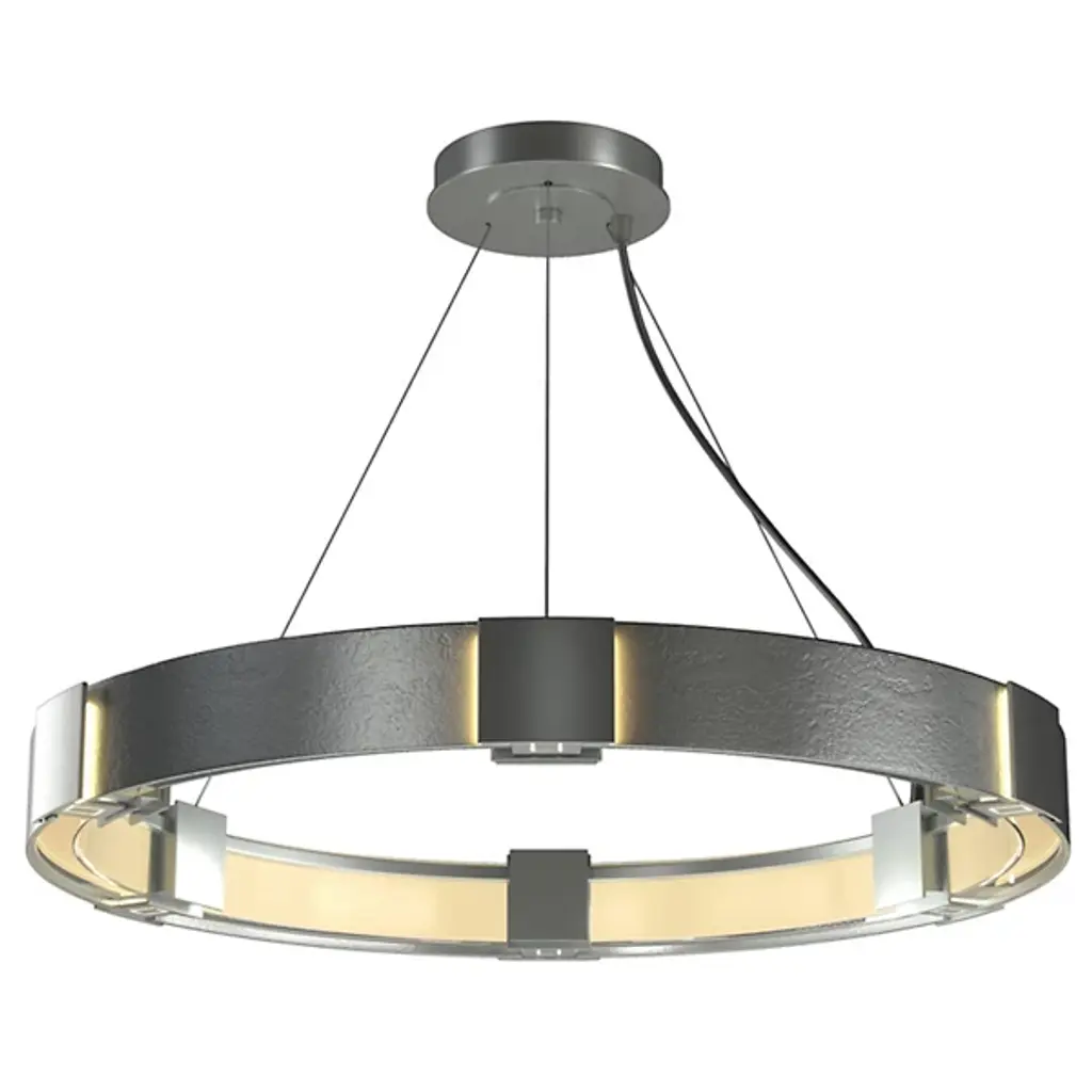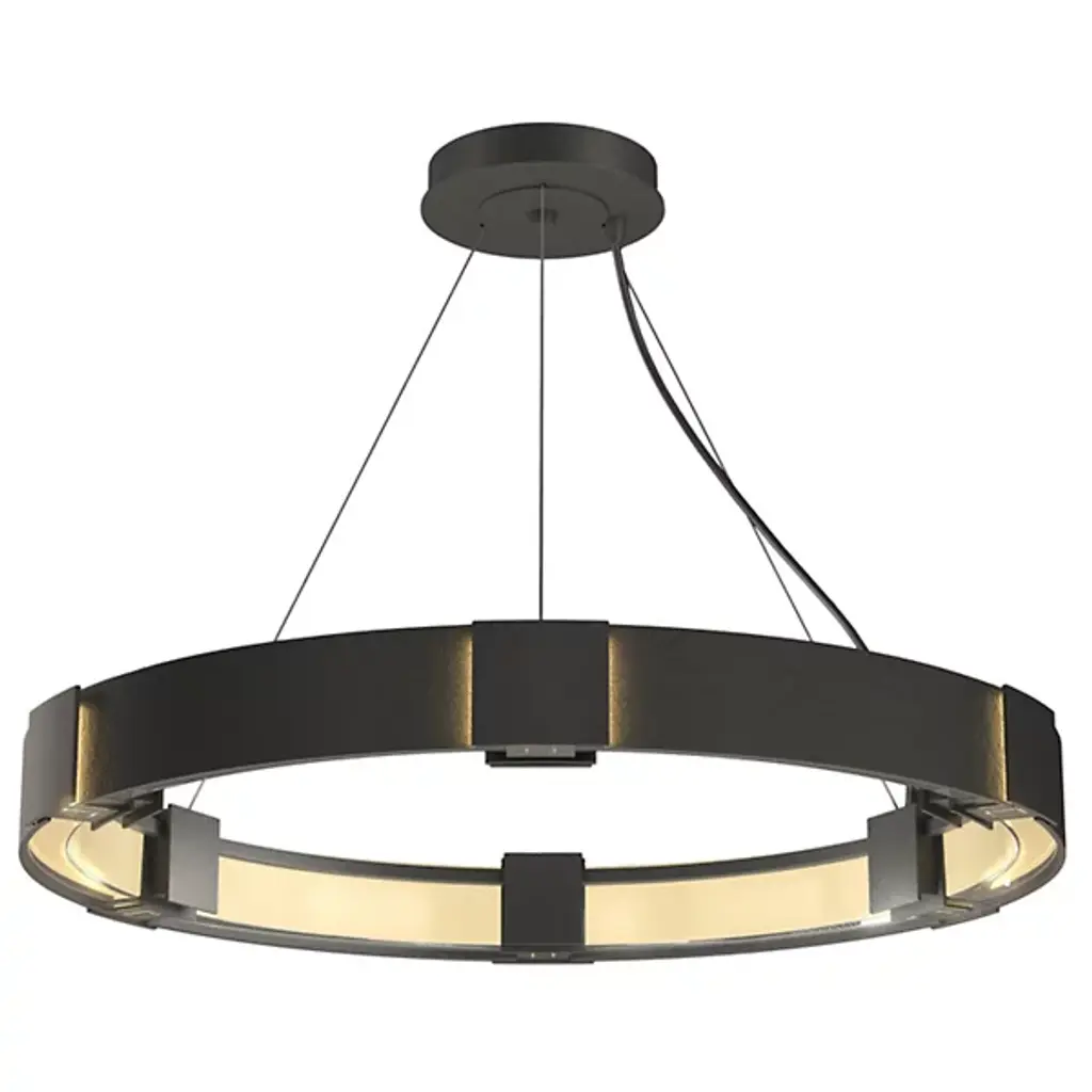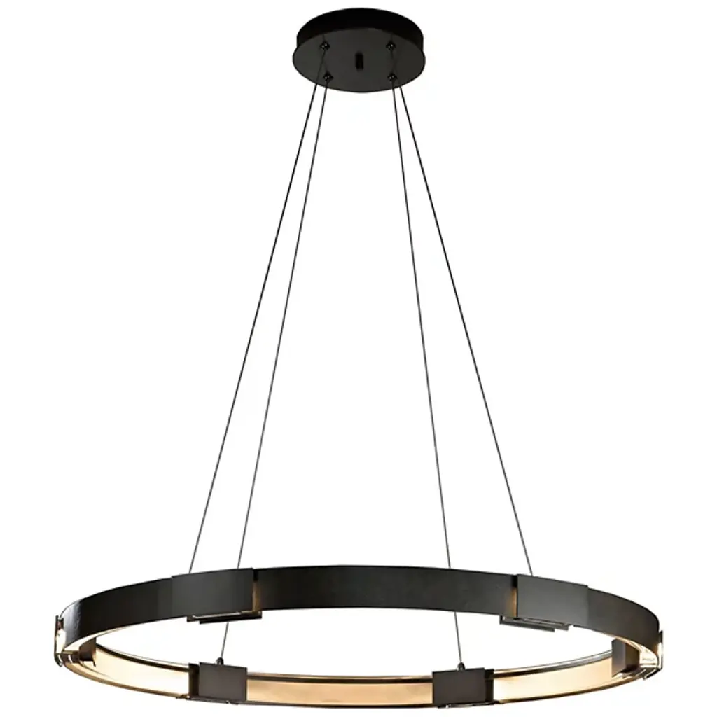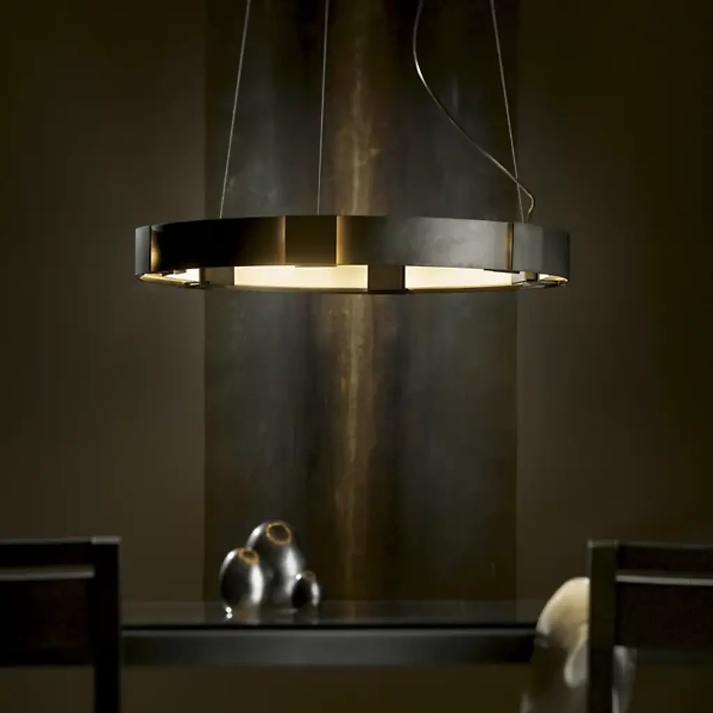 A soft contemporary piece, the Hubbardton Forge Aura Pendant is a handsome piece that complements a variety of design schemes. Its rounded hand-forged frame acts as a halo of light, a result of light shining through solid clear-cut glass blocks with frosted backs.