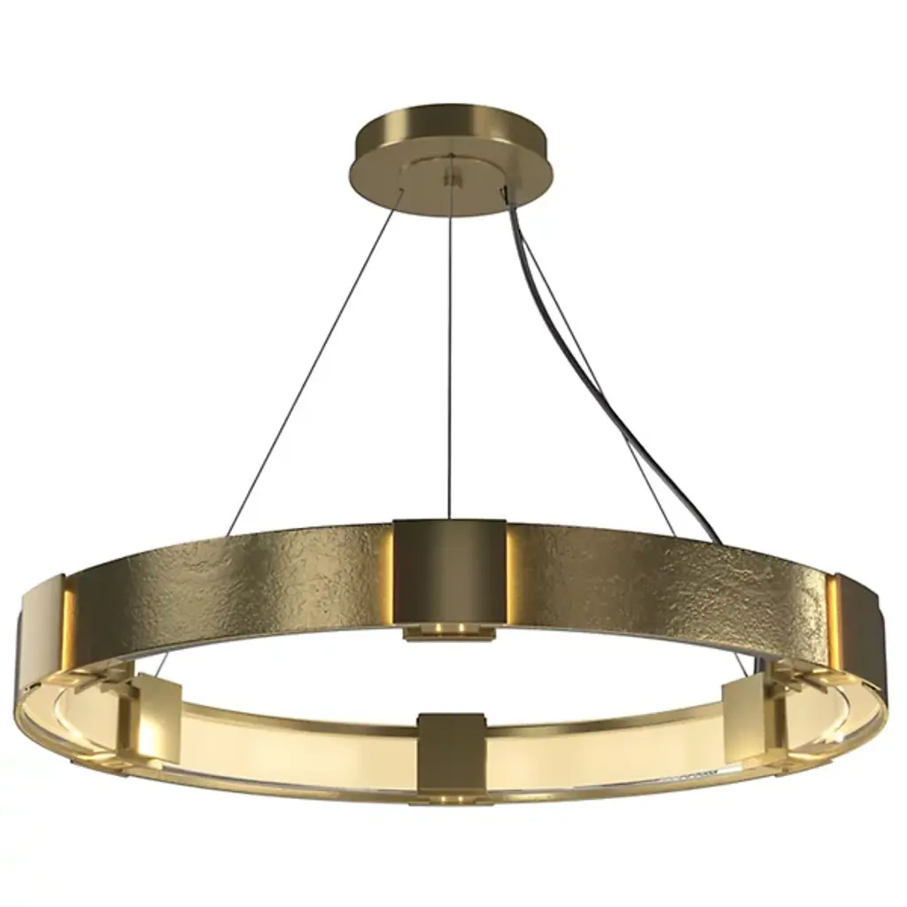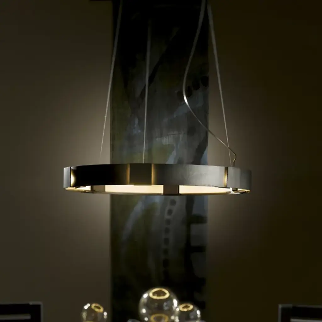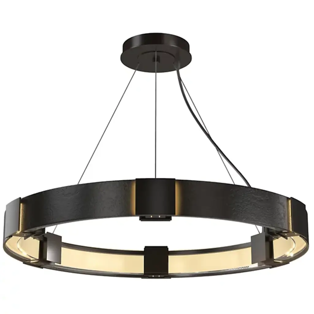 A soft contemporary piece, the Hubbardton Forge Aura Pendant is a handsome piece that complements a variety of design schemes. Its rounded hand-forged frame acts as a halo of light, a result of light shining through solid clear-cut glass blocks with frosted backs.