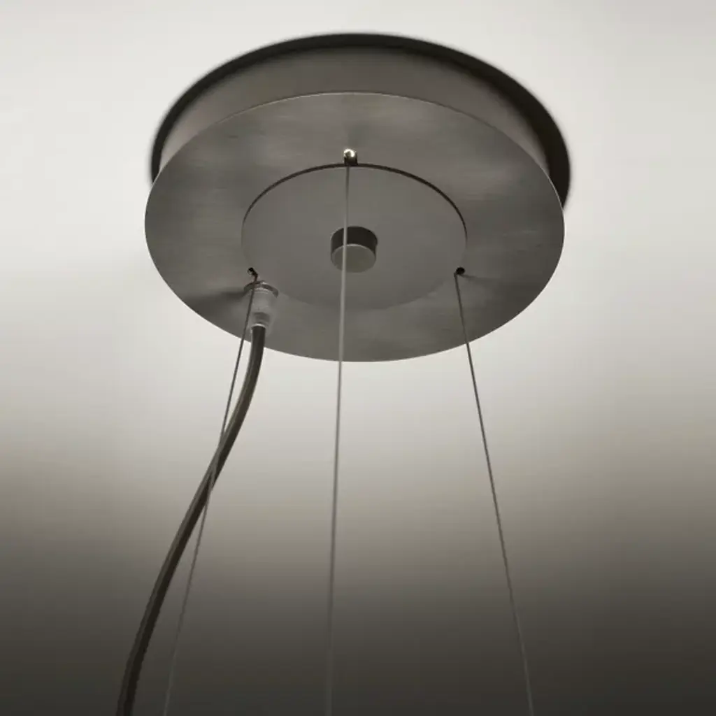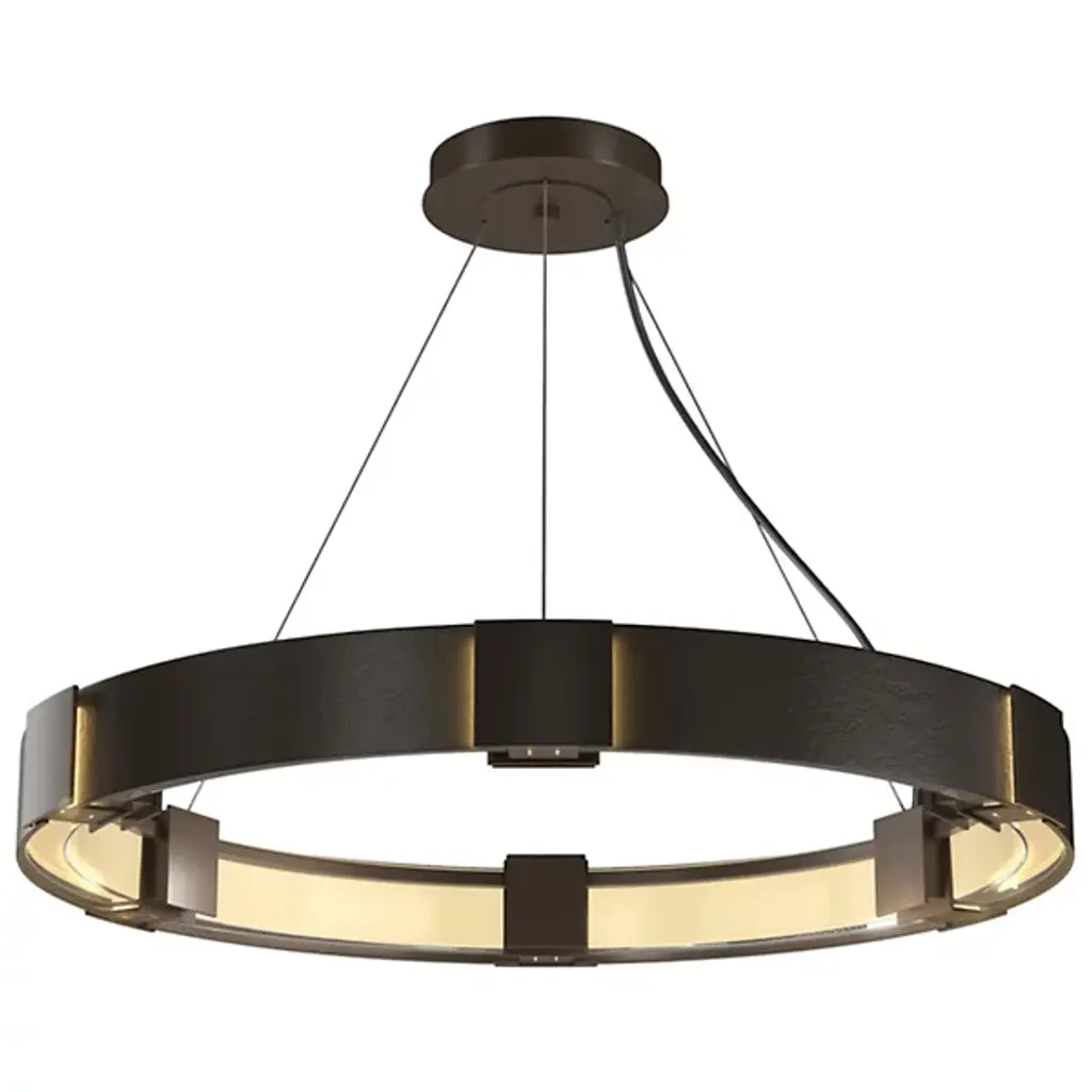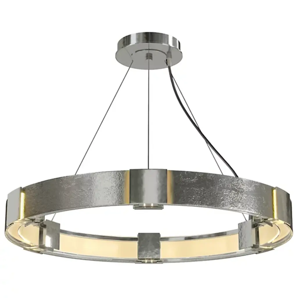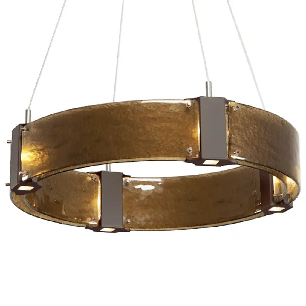 A soft contemporary piece, the Hubbardton Forge Aura Pendant is a handsome piece that complements a variety of design schemes. Its rounded hand-forged frame acts as a halo of light, a result of light shining through solid clear-cut glass blocks with frosted backs.