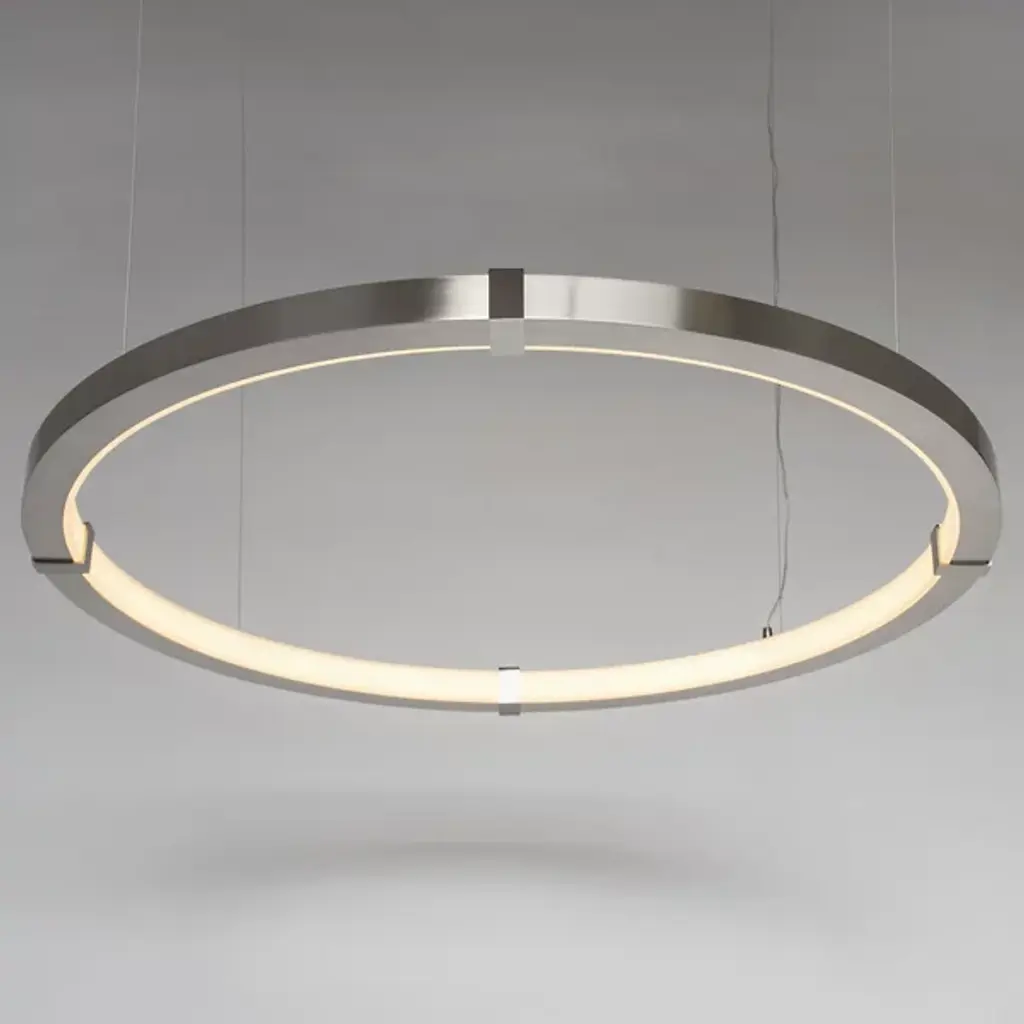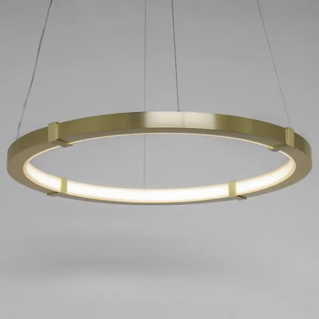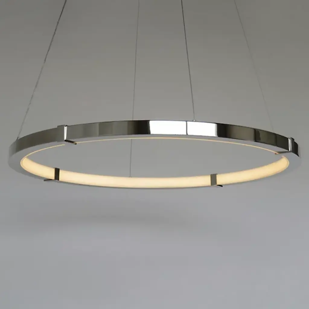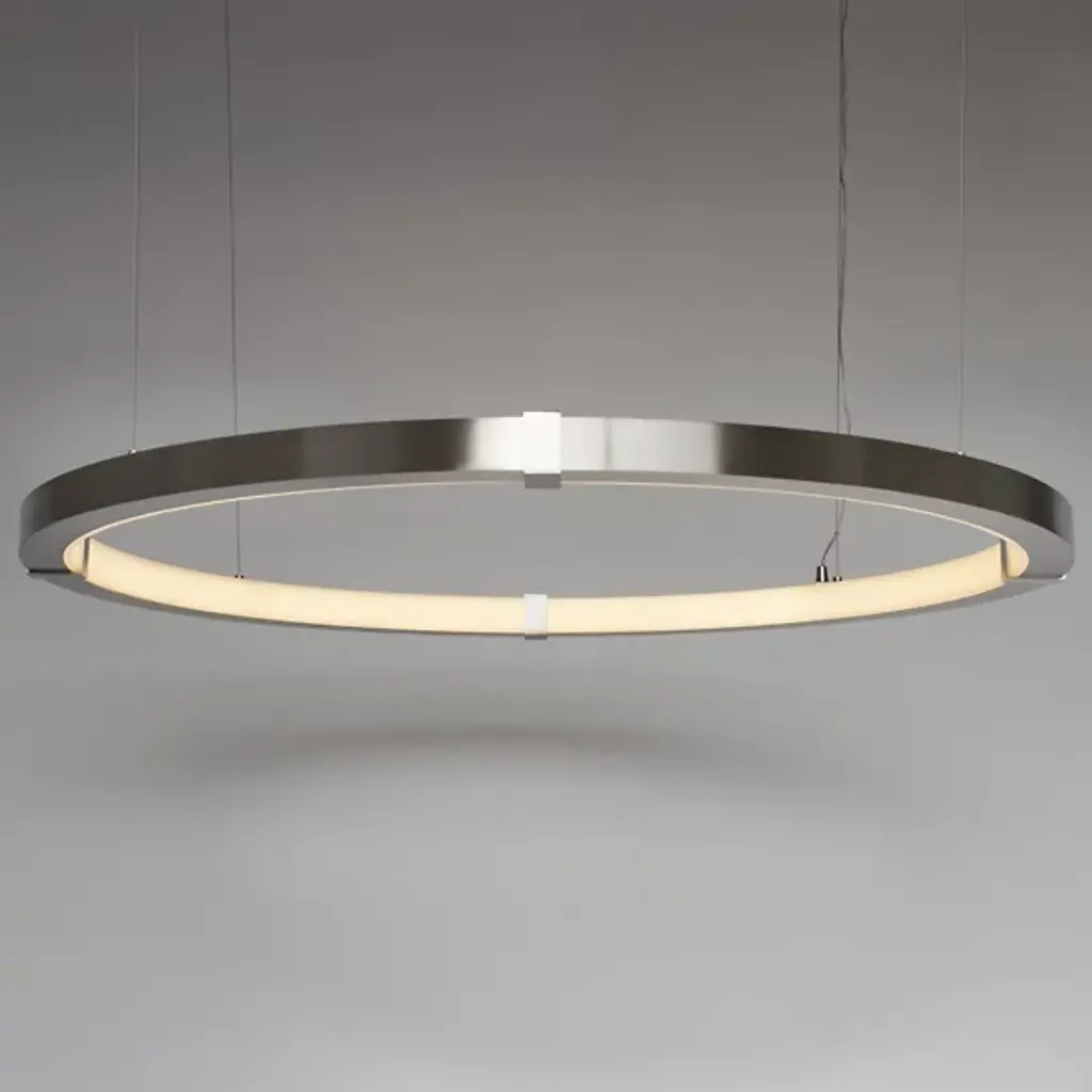 Streamline your kitchen, dining area or living space with an Aura Slim Pendant by Ridgley Studio. The slender ring of cold rolled steel suspended from thin cables brings sleek minimalism to contemporary interiors. It's available in a wide array of chic metal finishes for stylishly cohesive décor. With a satin acrylic diffuser and an LED strip, this ceiling fixture produces warm white light and is compatible with a dimmer for the perfect atmosphere.