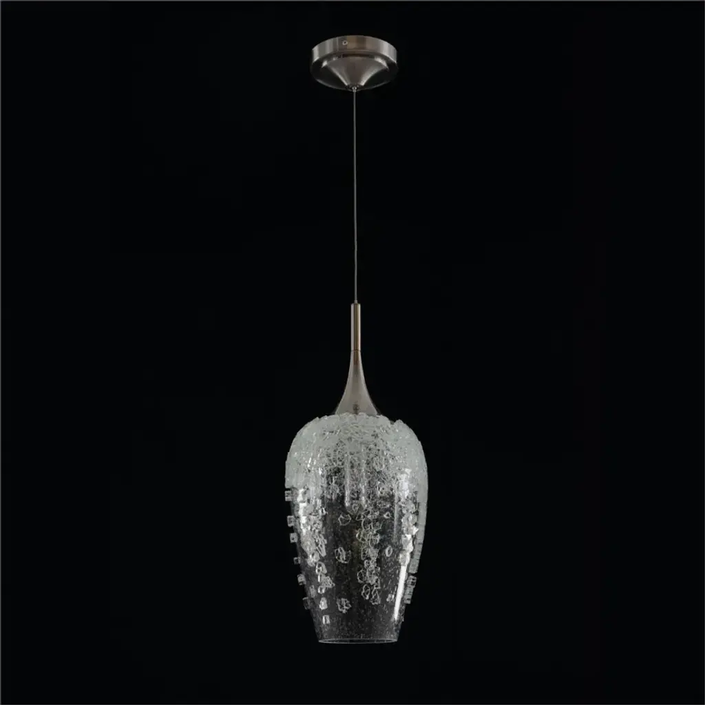 This single-light pendant with a finish of brushed nickel has a handblown seeded glass globe with embedded glass nuggets.