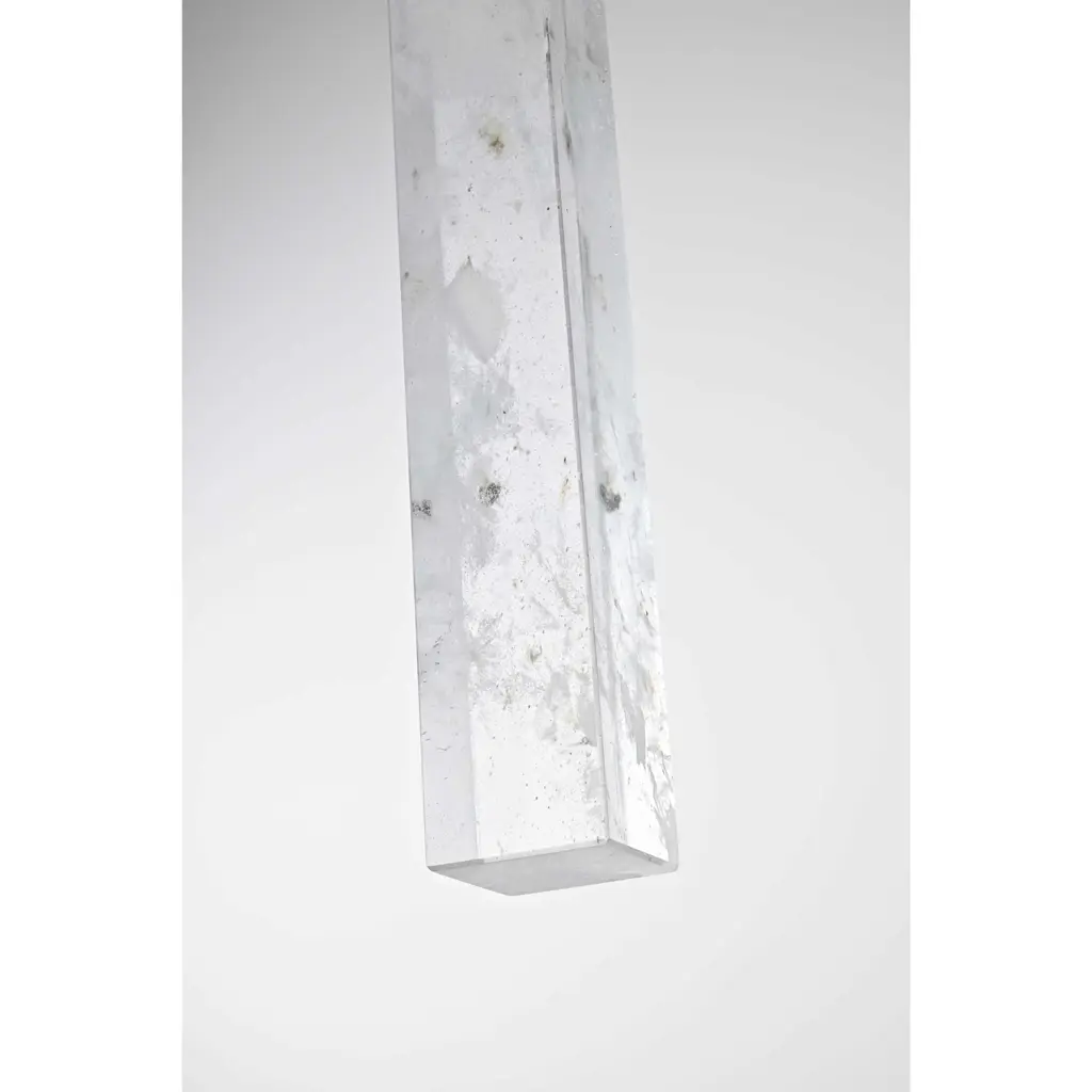Immerse yourself in the captivating allure of our natural crystal pendant, a stunning piece that embodies the true artistry of nature. Each crystal tells a unique story, with ethereal white clouds and mysterious black specks forming a mesmerizing dance of elements within its clear surface. These wispy inclusions create a serene, dreamlike landscape that evokes both wonder and tranquility. Meticulously crafted over millennia, no two crystals are alike, making each pendant a one-of-a-kind masterpiece. Whether enhancing a modern minimalist space or adding elegance to a classic interior, this versatile lighting piece complements any style with its natural beauty. Suspended by an adjustable 144-inch cord and illuminating with a warm 3000K light at 480 lumens, it brings both sophistication and a calming ambiance to any room.