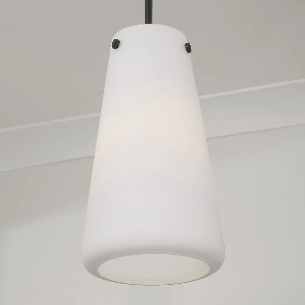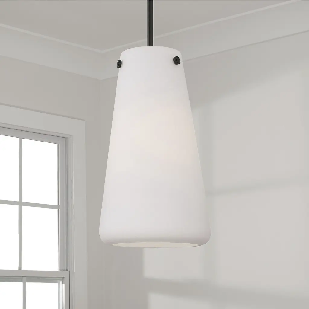 The Averitt Pendant delivers elegant transitional style with grand scale. The exposed rivet details and unique rounded, recessed bottom add high design to the elongated Soft White glass tapered shade, while the Matte Black finish creates sophisticated contrast.
