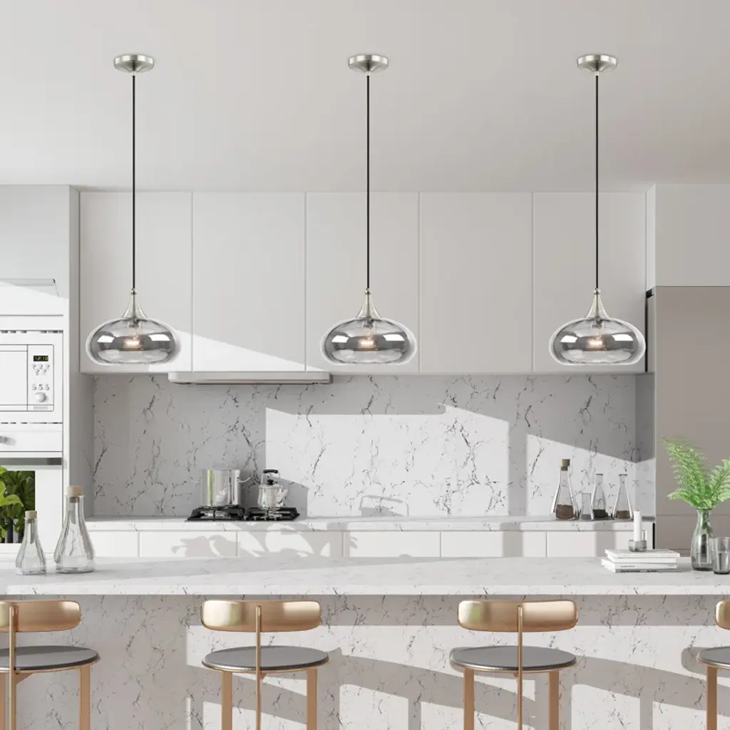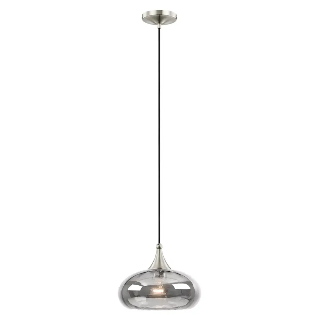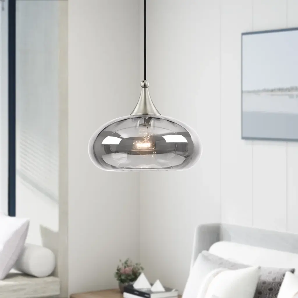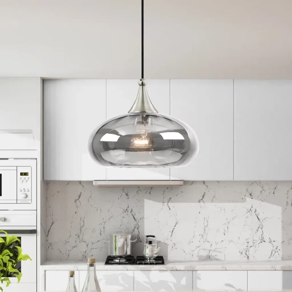 A beacon of vintage-inspired industry, this 1-light pendant features a teardrop silhouette that adds a hint of elegance to your space. The hand-blown, smoke-tinted glass shade casts a warm, ambient glow that's ideal for illuminating your kitchen island, dining area, or living room. The brushed nickel finish of the steel fixture complements a variety of decor styles. Compatible with sloped ceilings, this pendant light is also rated for damp locations, making it versatile enough even in high-moisture environments. Complete the look with a 100W max bulb (sold separately): We think a filament bulb looks best here.