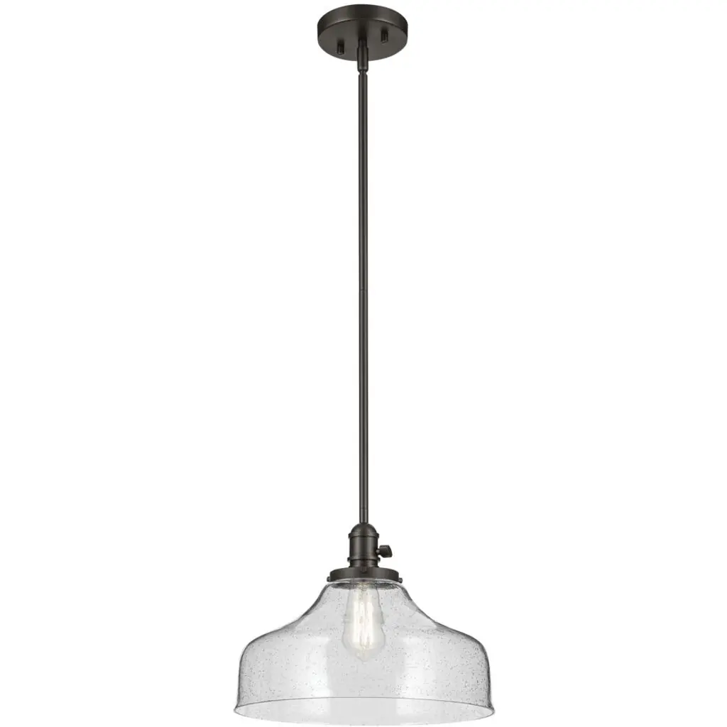 Offering convenience and ease in coordinating with other lighting options, the Avery 1 light bell pendant is truly as versatile as it is beautiful. Avery's on-trend black finish creates a classic yet dramatic statement to any space while it complements a variety of decor, including industrial aesthetics. Its clear seeded glass adds to its charm by providing a beautiful, ambient lighting to the entire room and is easy to remove for convenience and ease of cleaning and replacement. A stem with a functional on/off switch on its socket completes the look.