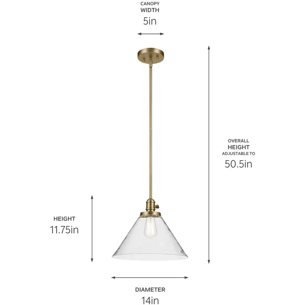 Offering convenience and ease in coordinating with other lighting options, the Avery 1 Light Cone Pendant is truly as versatile as it is beautiful. Avery's on-trend natural brass finish creates a classic yet dramatic statement to any space while it complements a variety of decor, including industrial aesthetics. Its clear seeded glass adds to its charm by providing a beautiful, ambient lighting to the entire room and is easy to remove for convenience and ease of cleaning and replacement. A stem with a functional on/off switch on its socket completes the look.