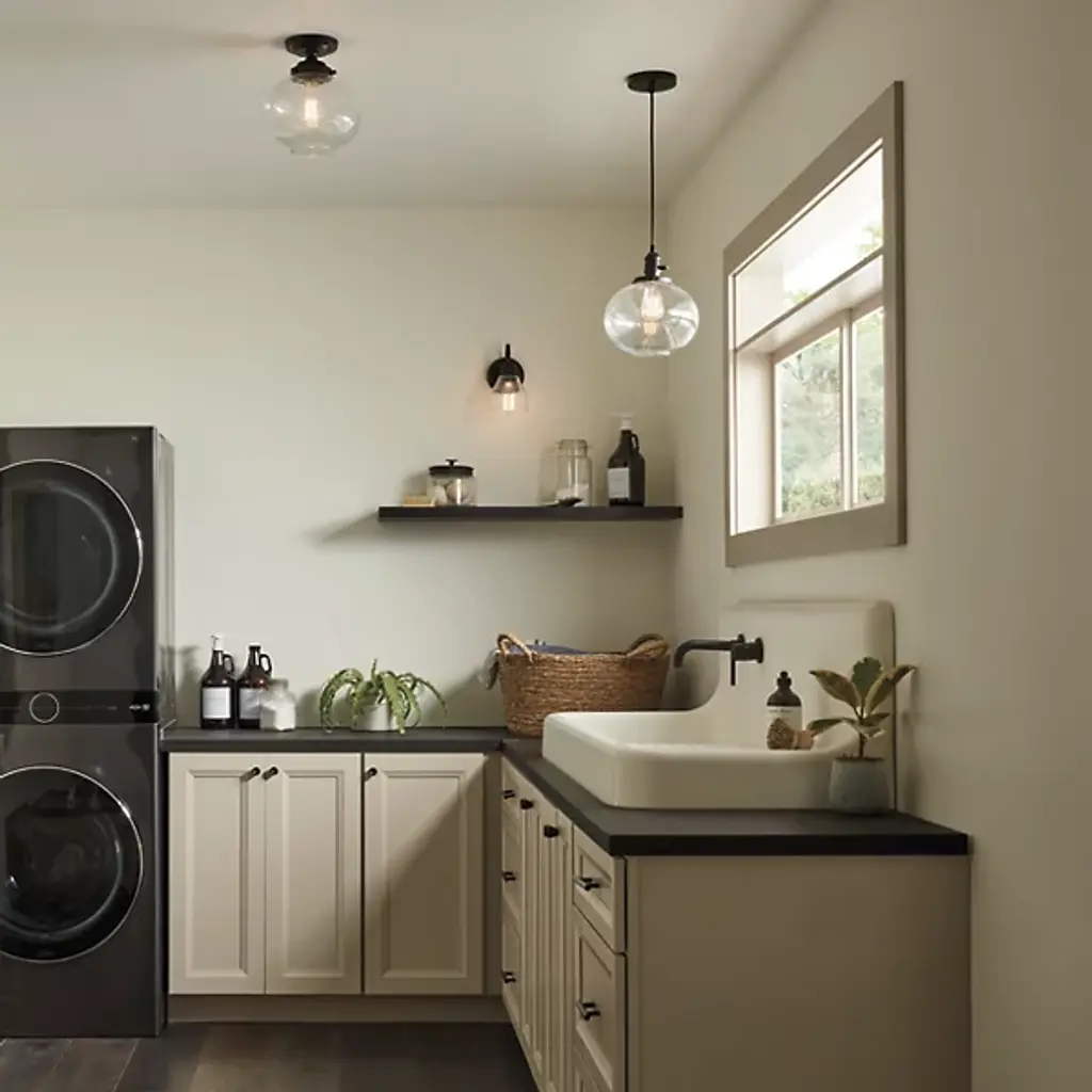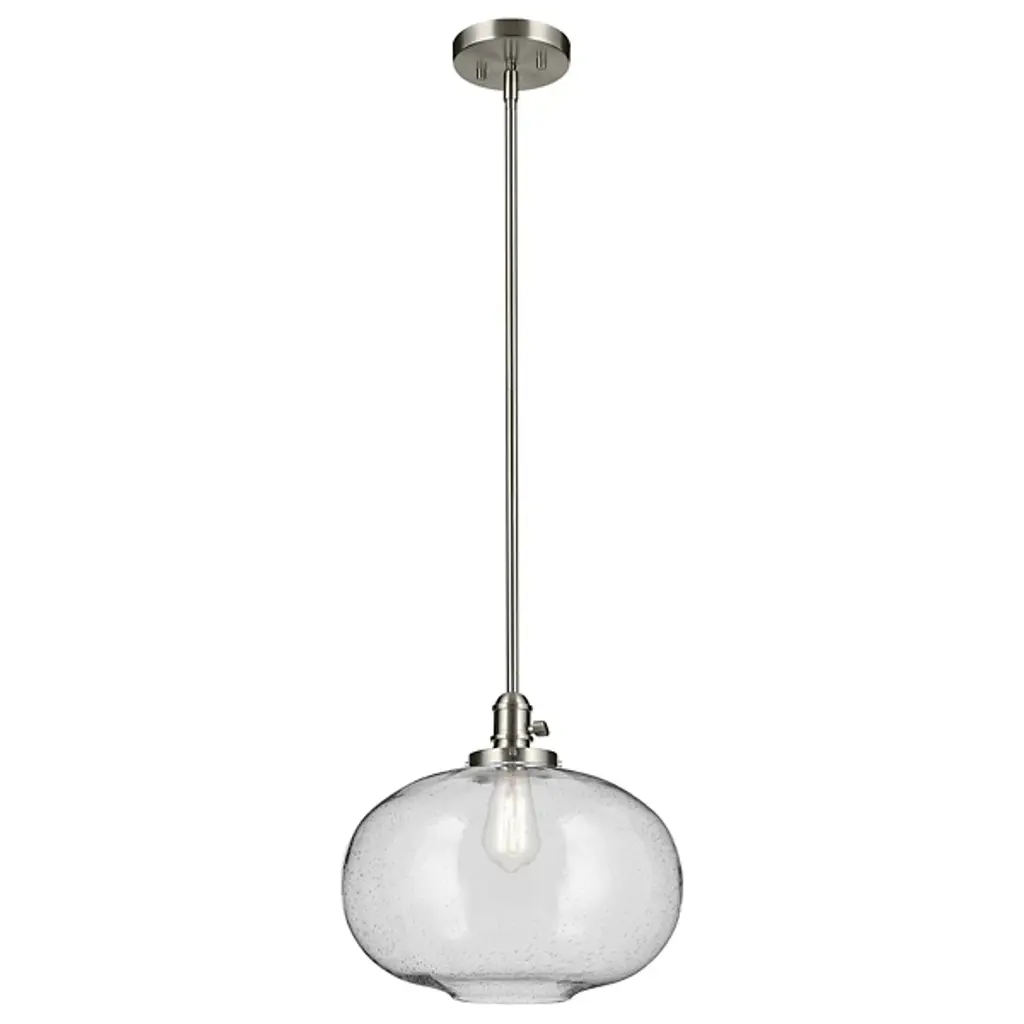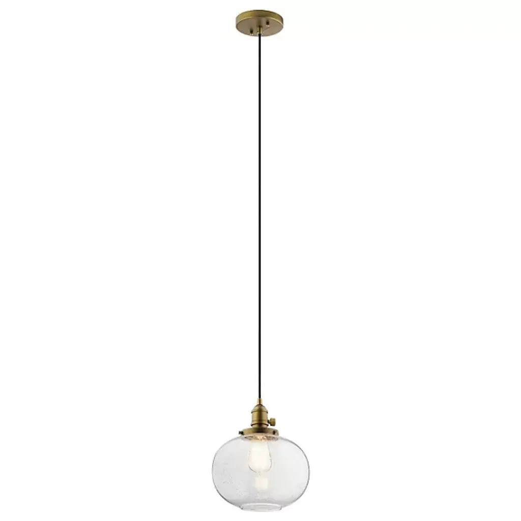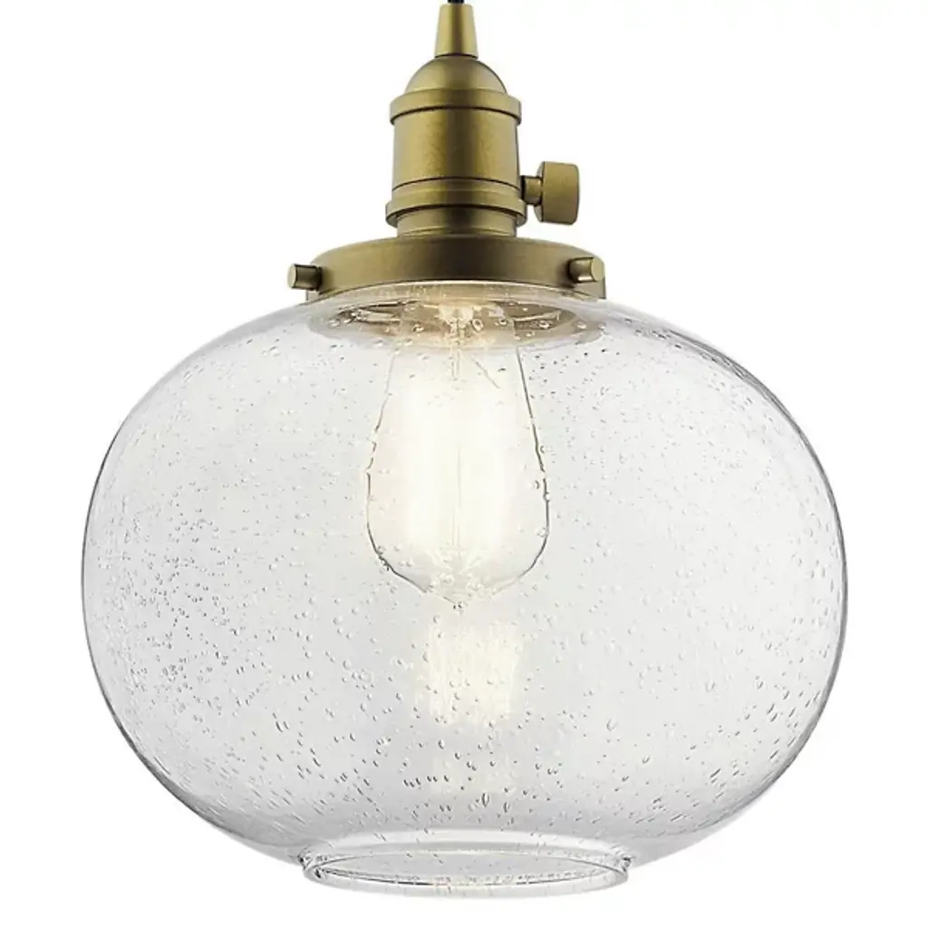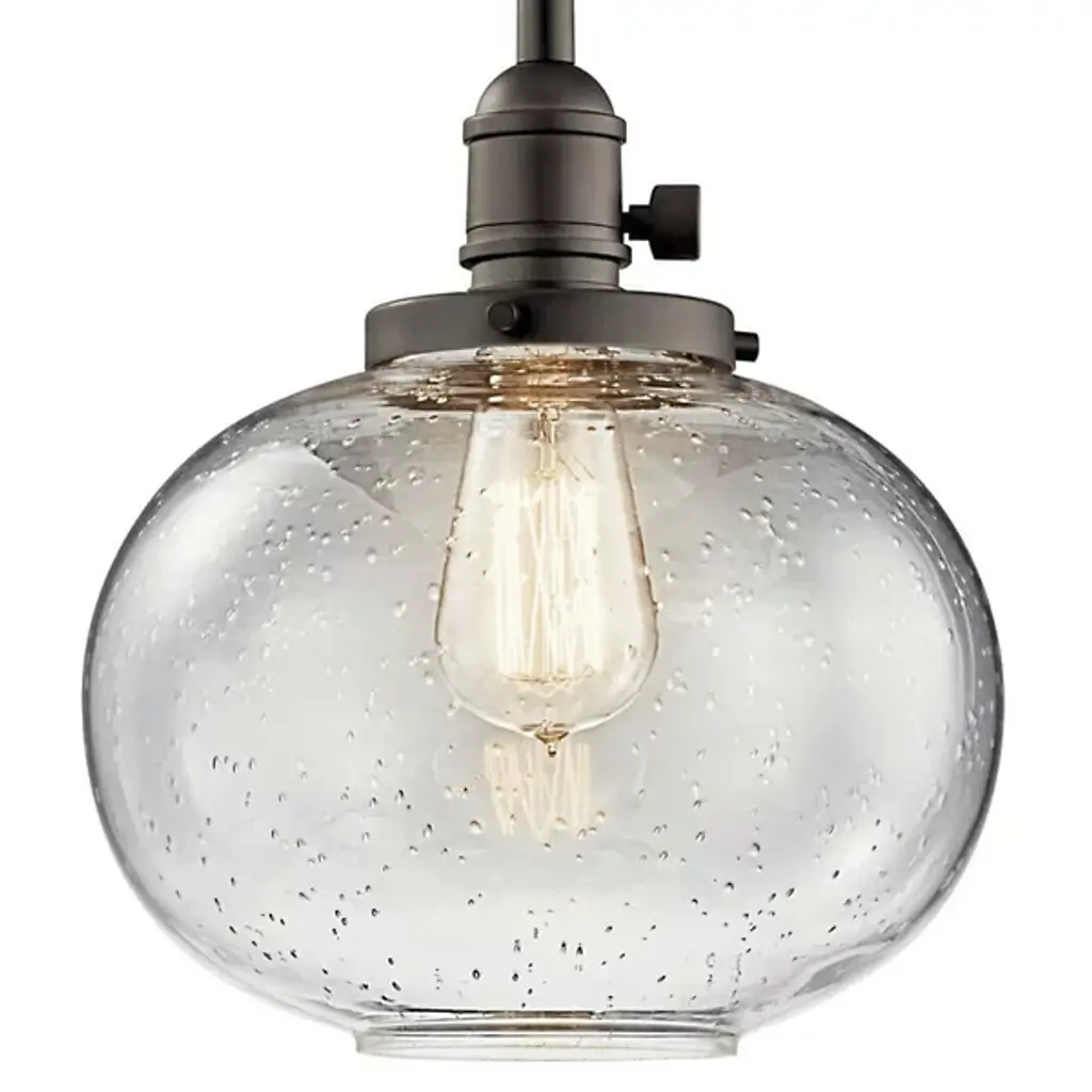 Minimalist and transitional. The Avery Globe Pendant from Kichler features a straightforward design that will easily blend in with a lot of different established decors. The Clear Seeded Glass shade diffuses light for a glow that’s free from any hotspots or glares, and the bubbles in the glass will provide an intriguing, sparkling light. You can either install one of these pendants on its own, but it also is capable of mixing and matching with others so you can create your own unique light system.