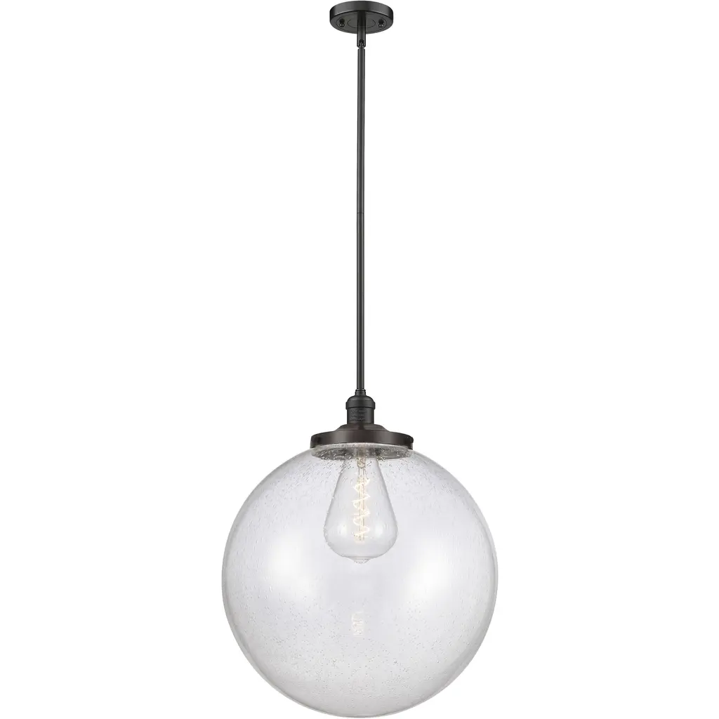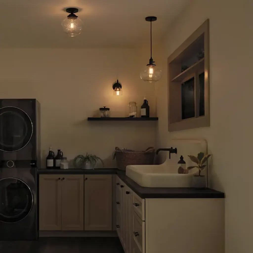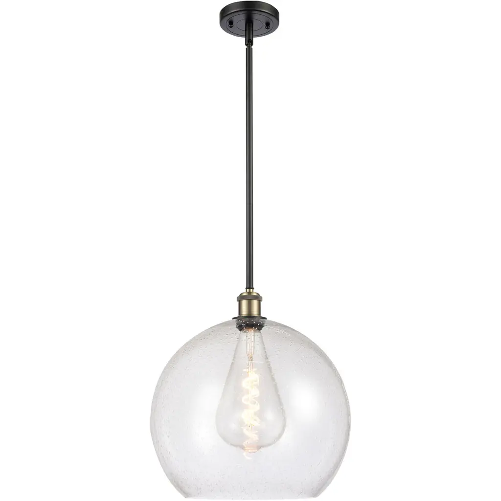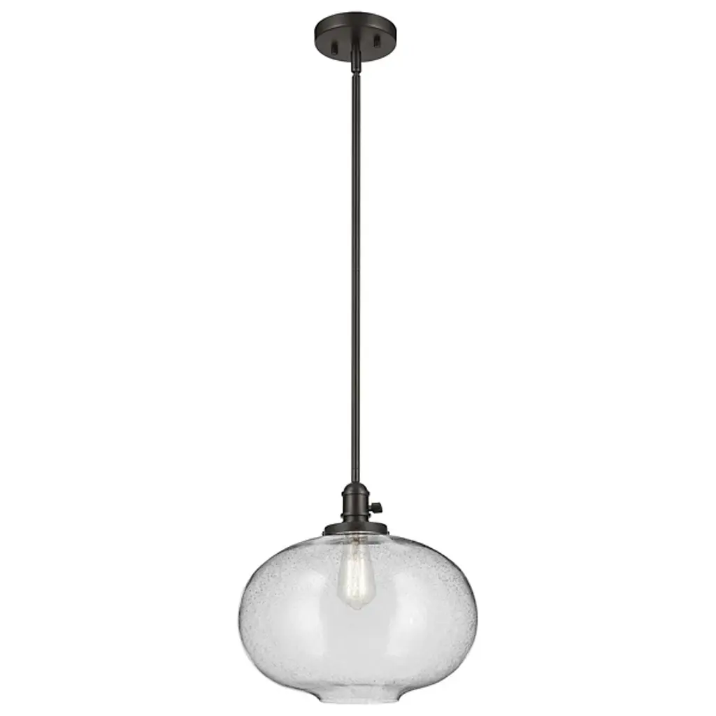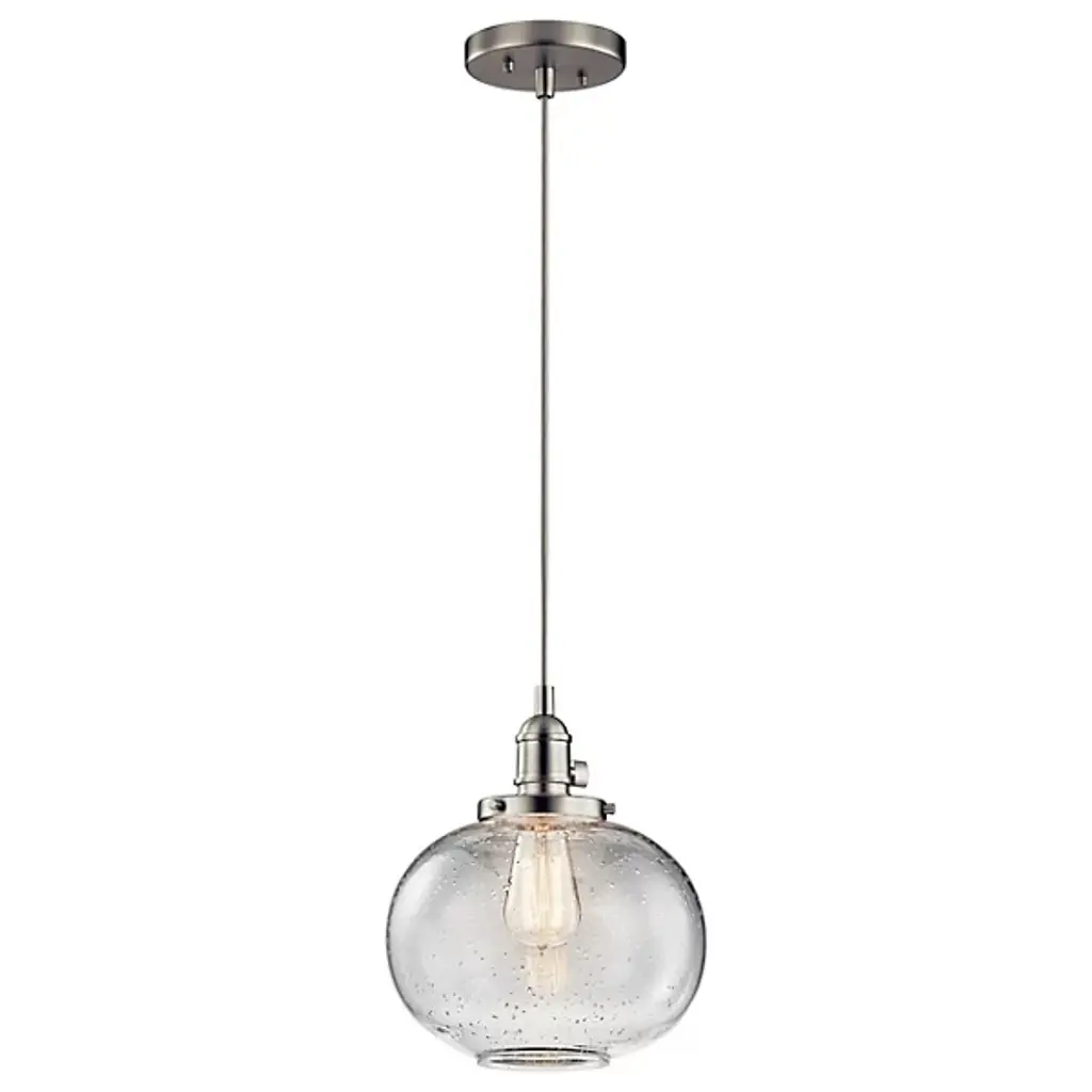Minimalist and transitional. The Avery Globe Pendant from Kichler features a straightforward design that will easily blend in with a lot of different established decors. The Clear Seeded Glass shade diffuses light for a glow that’s free from any hotspots or glares, and the bubbles in the glass will provide an intriguing, sparkling light. You can either install one of these pendants on its own, but it also is capable of mixing and matching with others so you can create your own unique light system.