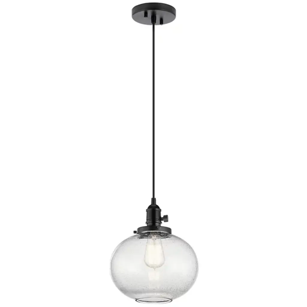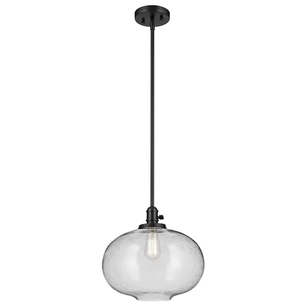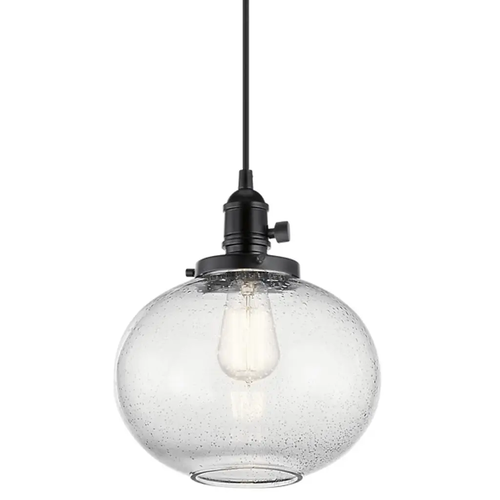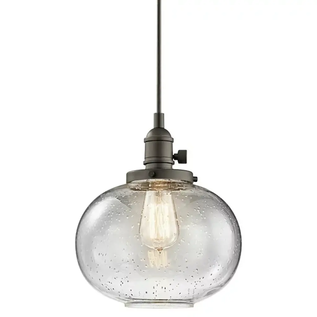 Minimalist and transitional. The Avery Globe Pendant from Kichler features a straightforward design that will easily blend in with a lot of different established decors. The Clear Seeded Glass shade diffuses light for a glow that’s free from any hotspots or glares, and the bubbles in the glass will provide an intriguing, sparkling light. You can either install one of these pendants on its own, but it also is capable of mixing and matching with others so you can create your own unique light system.
