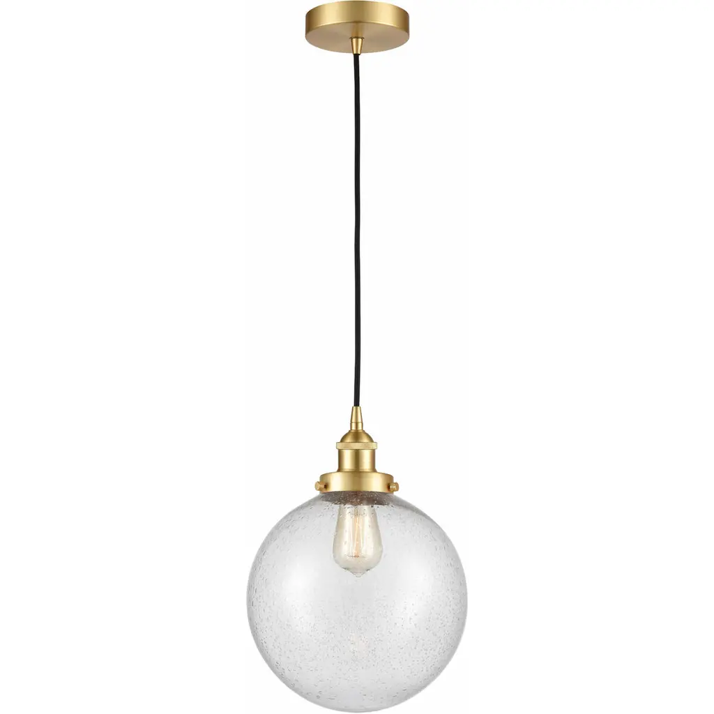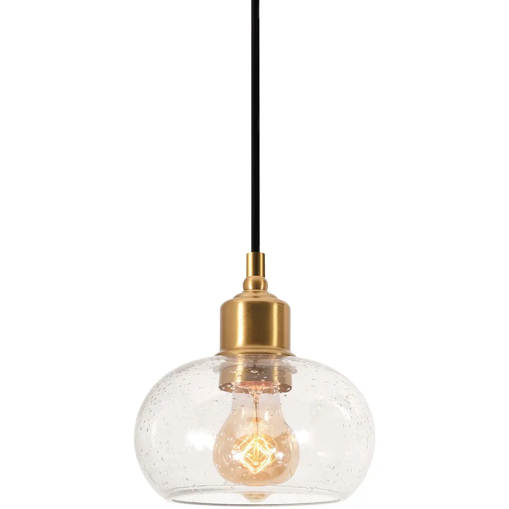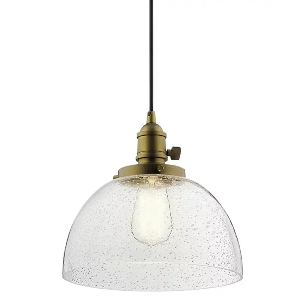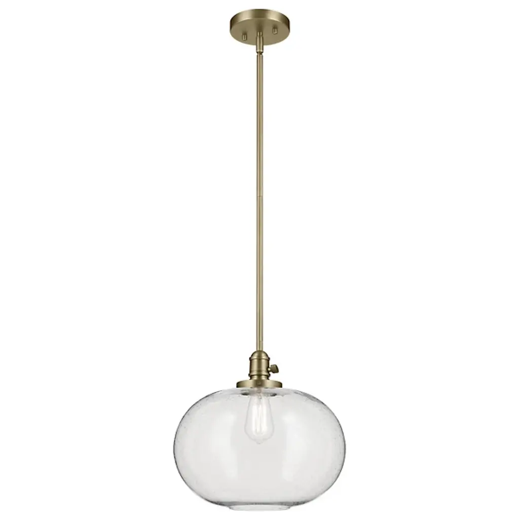 Minimalist and transitional. The Avery Globe Pendant from Kichler features a straightforward design that will easily blend in with a lot of different established decors. The Clear Seeded Glass shade diffuses light for a glow that’s free from any hotspots or glares, and the bubbles in the glass will provide an intriguing, sparkling light. You can either install one of these pendants on its own, but it also is capable of mixing and matching with others so you can create your own unique light system.