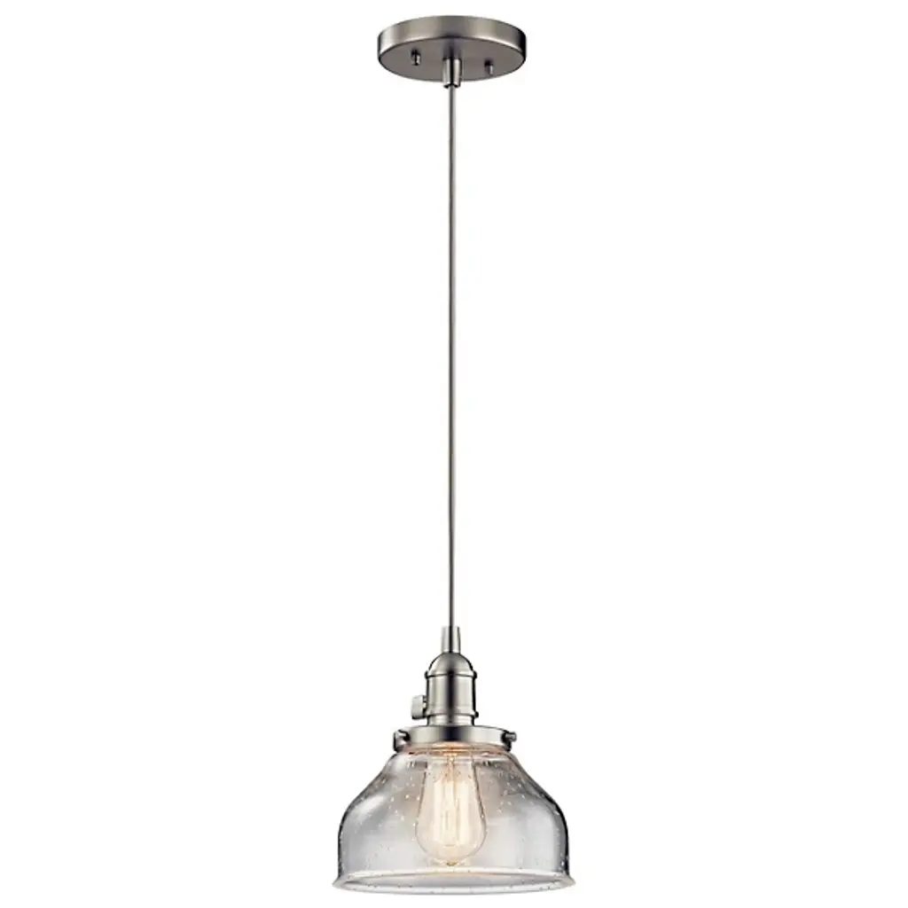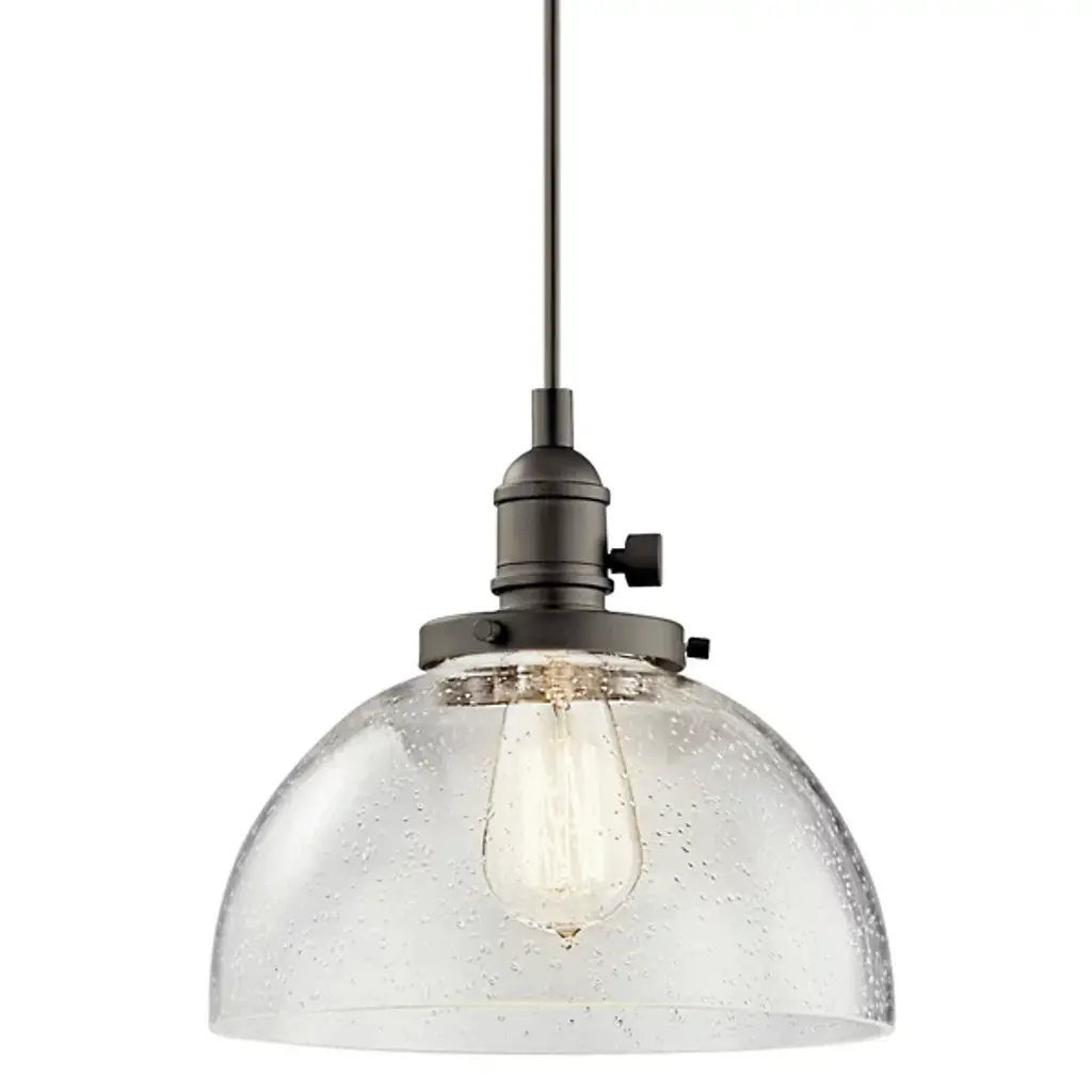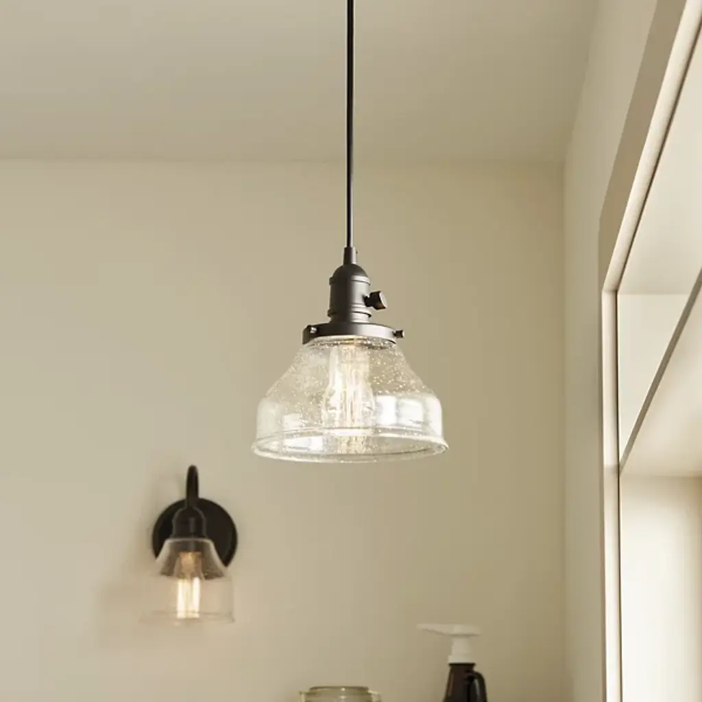 The Avery Pendant by Kichler is charming and uncomplicated. With a goblet shaped Clear Seeded Glass shade, beautifully diffused light can be enhanced with a vintage filament bulb, which must be purchased separately. Sleek hardware detailing adds an industrial feel to this fixture, which is finished with adjustable cording and a simple circular canopy. Adding a layer of light over tables, counters and a variety of living spaces, this pendant is a tailored and rustic addition to the home.