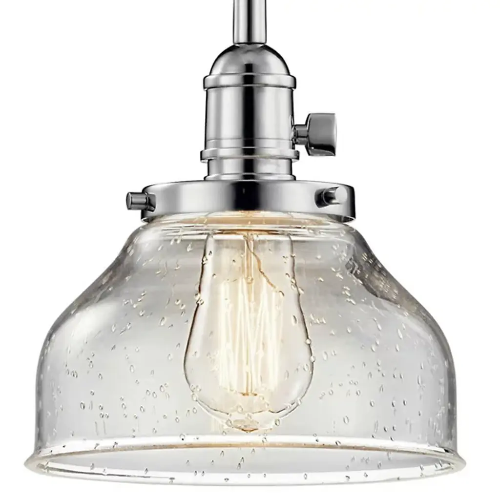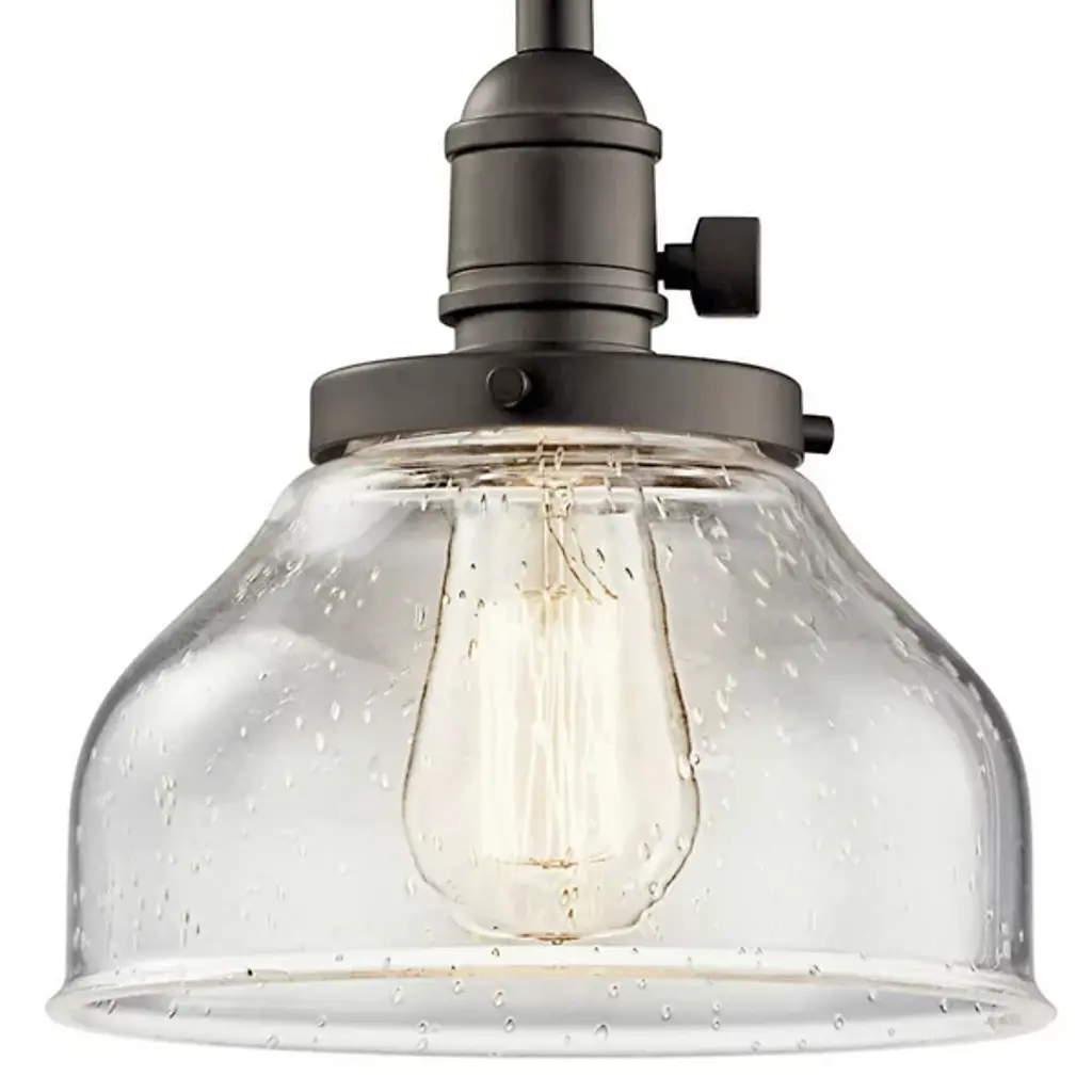 The Avery Pendant by Kichler is charming and uncomplicated. With a goblet shaped Clear Seeded Glass shade, beautifully diffused light can be enhanced with a vintage filament bulb, which must be purchased separately. Sleek hardware detailing adds an industrial feel to this fixture, which is finished with adjustable cording and a simple circular canopy. Adding a layer of light over tables, counters and a variety of living spaces, this pendant is a tailored and rustic addition to the home.