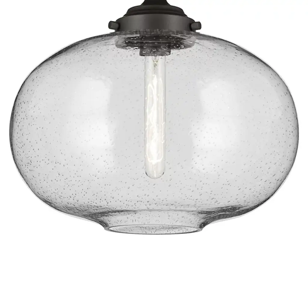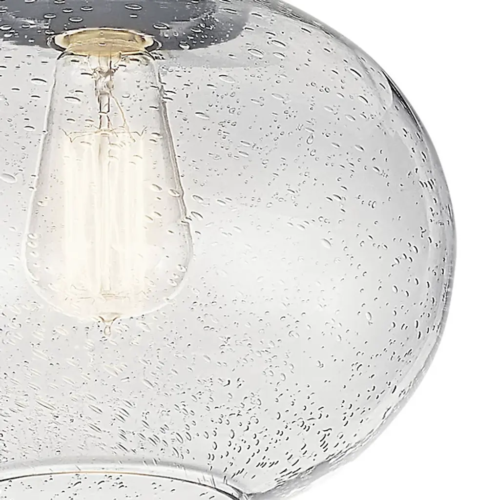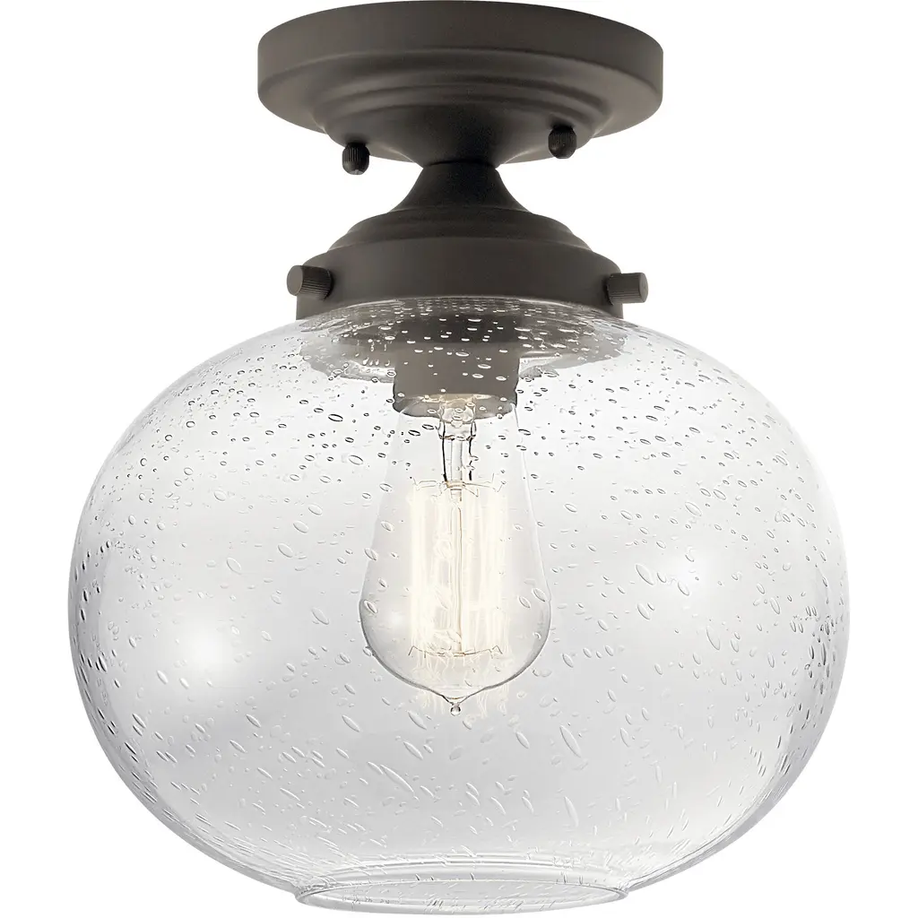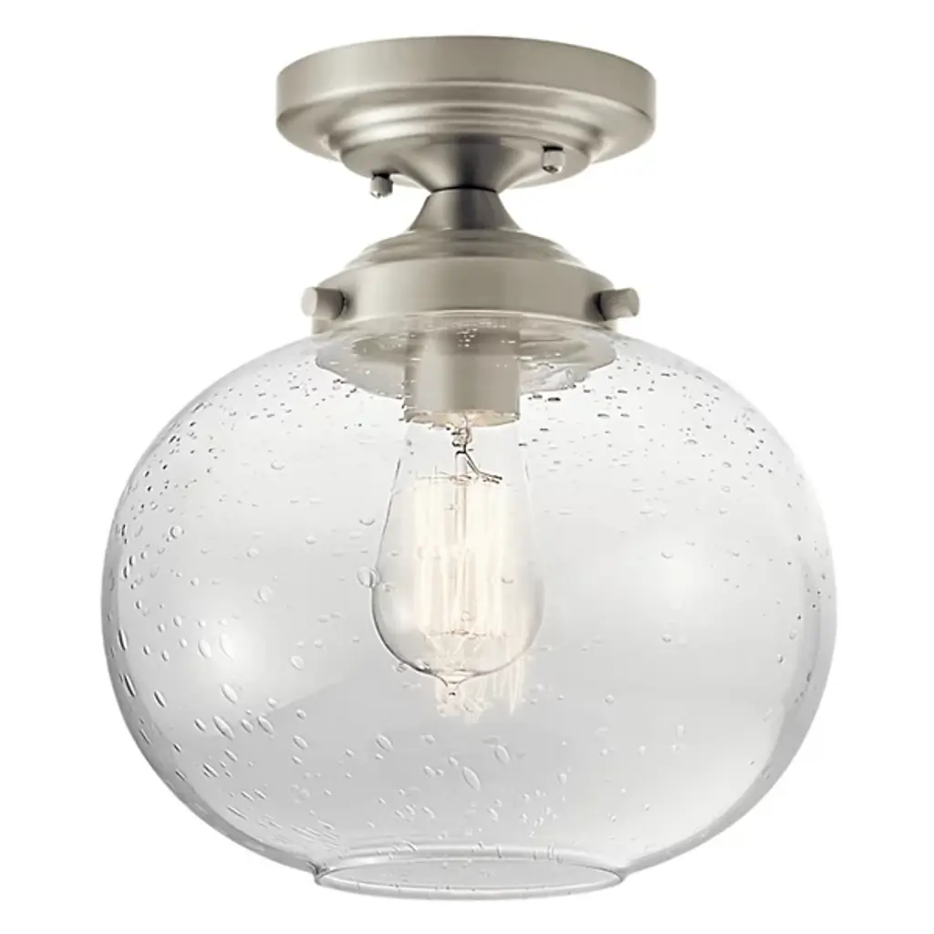 The Avery Semi-Flushmount from Kichler is a contemporary ceiling light designed to complement a variety of décor styles. This ceiling light works well with traditional and industrial style designs. It features a clear seeded glass shade with a semi-exposed incandescent bulb, which is not included, that creates a sparkling effect around the room. The Avery Semi-Flush mount can be installed in bathrooms and other areas where ambient moisture is present.